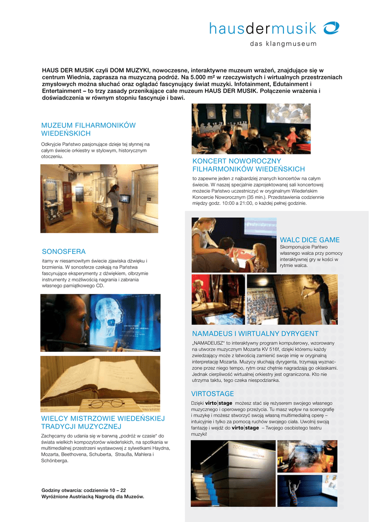 hausdermusik das klangmuseum hausdermusik HAUS DER MUSIK czyli DOM MUZYKI, nowoczesne, interaktywne muzeum wrażeń, znajdujące się w das klangmuseum centrum Wiednia, zaprasza na muzyczną podróż. Na 5.000 m² w rzeczywistych i wirtualnych przestrzeniach zmysłowych można słuchać oraz oglądać fascynujący świat muzyki. Infotainment, Edutainment i Entertainment – to trzy zasady przenikające całe muzeum HAUS DER MUSIK. Połączenie wrażenia i doświadczenia w równym stopniu fascynuje i bawi. Muzeum Filharmoników Wiedeńskich Odkryjcie Państwo pasjonujące dzieje tej słynnej na całym świecie orkiestry w stylowym, historycznym otoczeniu. Koncert Noworoczny Filharmoników Wiedeńskich to zapewne jeden z najbardziej znanych koncertów na całym świecie. W naszej specjalnie zaprojektowanej sali koncertowej możecie Państwo uczestniczyć w oryginalnym Wiedeńskim Koncercie Noworocznym (35 min.). Przedstawienia codziennie między godz. 10:00 a 21:00, o każdej pełnej godzinie. Walc dice game Skomponujcie Pańtwo własnego walca przy pomocy interaktywnej gry w kości w rytmie walca. Sonosfera itamy w niesamowitym świecie zjawiska dżwięku i brzmienia. W sonosferze czekają na Państwa fascynujące eksperymenty z dźwiękiem, olbrzymie instrumenty z możliwością nagrania i zabrania własnego pamiątkowego CD. NAMADEUS i wirtualny dyrygent „NAMADEUSZ“ to interaktywny program komputerowy, wzorowany na utworze muzycznym Mozarta KV 516f, dzięki któremu każdy zwiedzający może z łatwością zamienić swoje imię w oryginalną interpretację Mozarta. Muzycy słuchają dyrygenta, trzymają wyznaczone przez niego tempo, rytm oraz chętnie nagradzają go oklaskami. Jednak cierpliwość wirtualnej orkiestry jest ograniczona. Kto nie utrzyma taktu, tego czeka niespodzianka. VIRTOSTAGE Wielcy mistrzowie wiedeńskiej tradycji muzycznej Zachęcamy do udania się w barwną „podróż w czasie“ do świata wielkich kompozytorów wiedeńskich, na spotkania w multimedialnej przestrzeni wystawowej z sylwetkami Haydna, Mozarta, Beethovena, Schuberta, Straußa, Mahlera i Schönberga. Godziny otwarcia: codziennie 10 – 22 Wyróżnione Austriacką Nagrodą dla Muzeów. Dzięki virto|stage możesz stać się reżyserem swojego własnego muzycznego i operowego przeżycia. Tu masz wpływ na scenografię i muzykę i możesz stworzyć swoją własną multimedialną operę – intuicyjnie i tylko za pomocą ruchów swojego ciała. Uwolnij swoją fantazję i wejdź do virto|stage – Twojego osobistego teatru muzyki!