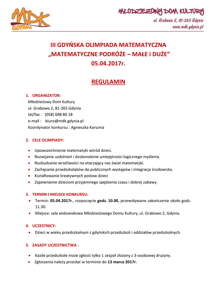 III GDYŃSKA OLIMPIADA MATEMATYCZNA „MATEMATYCZNE PODRÓŻE – MAŁE i DUŻE” 05.04.2017r. REGULAMIN 1. ORGANIZATOR: Młodzieżowy Dom Kultury ul. Grabowo 2, 81-265 Gdynia tel/fax : (058) 698 86 18 e-mail : [email protected] Koordynator konkursu : Agnieszka Karsznia 2. CELE OLIMPIADY: Upowszechnienie matematyki wśród dzieci. Rozwijanie uzdolnień i doskonalenie umiejętności logicznego myślenia. Rozbudzanie wrażliwości na otaczający nas świat matematyki. Zachęcanie przedszkolaków do publicznych występów i integracja środowiska. Kształtowanie kreatywnych postaw dzieci Zapewnienie dzieciom przyjemnego spędzenia czasu i dobrej zabawy. 3. TERMIN I MIEJSCE KONKURSU: Termin: 05.04.2017r., rozpoczęcie godz. 10.00, przewidywane zakończenie około godz. 11.30. Miejsce: sala widowiskowa Młodzieżowego Domu Kultury, ul. Grabowo 2, Gdynia. 4. UCZESTNICY: Dzieci w wieku przedszkolnym z gdyńskich przedszkoli i oddziałów przedszkolnych. 5. ZASADY UCZESTNICTWA : Każde przedszkole może zgłosić tylko 1 zespół złożony z 3-osobowej drużyny. Zgłoszenia należy przesłać w terminie do 13 marca 2017r. Wypełnioną i podpisaną „Kartę zgłoszenia” prosimy dostarczyć do sekretariatu Młodzieżowego Domu Kultury drogą elektroniczną na adres: [email protected] lub przesłać fax-em.: tel./fax: 58 698 86 18 wew. 25. O uczestnictwie w olimpiadzie decyduje kolejność zgłoszeń (10 pierwszych zgłoszeń). O zakwalifikowaniu się do olimpiady nauczyciel prowadzący zostanie poinformowany drogą telefoniczną lub mailową. ( Obowiązkowo ) Nauczyciel przygotowujący zespół zgłasza propozycję pięciu zadań na olimpiadę. Propozycja zadań powinna być oryginalna i nie publikowana wcześniej. Zgłoszone propozycje zadań będą opiniowane, redagowane, opracowywane i podlegają niezależnej weryfikacji przez koordynatora olimpiady. • ( Dodatkowo dla chętnych ) Nauczyciel przygotowujący zespół wraz z kartą zgłoszenia dostarcza scenariusz eksperymentu jaki jego trzy osobowa grupa uczniów ( po weryfikacji i telefonicznym potwierdzeniu ) będzie prezentowała w czasie olimpiady. Pamiętajmy jednak, że wszystkie materiały potrzebne do wykonania doświadczenia na olimpiadzie należy zorganizować we własnym zakresie. Na zakończenie olimpiady max trzy wybrane zespoły będą miały możliwość zaprezentowania przygotowanego wcześniej eksperymentu. Czas trwania eksperymentu nie może przekraczać 10 minut. Impreza nie ma charakteru konkursowego, wszystkie zespoły ( uczestnicy ) otrzymają dyplomy uczestnictwa. Zgłoszenie udziału w olimpiadzie jest równoznaczne z wyrażeniem zgody na nieodpłatne prawo do zapisu udziału dowolną techniką i wykorzystywanie zapisanego materiału do celów edukacyjnych i popularyzatorskich, oraz publikacji. Nadesłanie karty zgłoszenia jest równoznaczne z akceptacją niniejszego Regulaminu Uczestnicy olimpiady przyjeżdżają na koszt własny. 6. OPIS PRZEBIEGU OLIMPIADY I ZAKRES MATERIAŁU MATEMATYCZNEGO : Zespoły złożone z dzieci reprezentujących dane przedszkole będą miały do rozwiązania zadania z logicznego myślenia np.: ułożyć z puzzli figury geometryczne i je nazywać, przeliczyć elementy zbiorów, kontynuować układy rytmiczne, dodawać i odejmować na konkretach i w pamięci (dozwolone liczenie na palcach), wymienić nazwy dni tygodnia i miesięcy w roku, rysować według podanych instrukcji i kodów. Koordynator Olimpiady Agnieszka Karsznia Kierownik Działu Sportu i Rekreacji Tatiana Różankiewicz