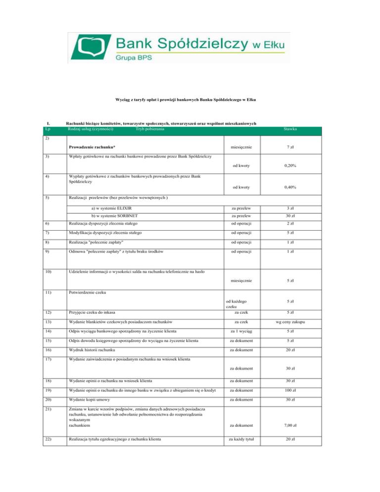 Wyciąg z taryfy opłat i prowizji bankowych Banku Spółdzielczego w Ełku I. Lp Rachunki bieżące komitetów, towarzystw społecznych, stowarzyszeń oraz wspólnot mieszkaniowych Rodzaj usług (czynności) Tryb pobierania Stawka 2) Prowadzenie rachunku* 3) 4) 5) miesięcznie 7 zł od kwoty 0,20% od kwoty 0,40% Wpłaty gotówkowe na rachunki bankowe prowadzone przez Bank Spółdzielczy Wypłaty gotówkowe z rachunków bankowych prowadzonych przez Bank Spółdzielczy Realizacji przelewów (bez przelewów wewnętrznych ) a) w systemie ELIXIR za przelew 3 zł b) w systemie SORBNET za przelew 30 zł 6) Realizacja dyspozycji zlecenia stałego od operacji 2 zł 7) Modyfikacja dyspozycji zlecenia stałego od operacji 5 zł 8) Realizacja "polecenie zapłaty" od operacji 1 zł 9) Odmowa "polecenie zapłaty" z tytułu braku środków od operacji 1 zł 10) Udzielenie informacji o wysokości salda na rachunku telefonicznie na hasło miesięcznie 5 zł 11) Potwierdzenie czeku 12) Przyjęcie czeku do inkasa 13) Wydanie blankietów czekowych posiadaczom rachunków 14) od każdego czeku za czek 5 zł 5 zł za czek wg ceny zakupu Odpis wyciągu bankowego sporządzony na życzenie klienta za 1 wyciąg 5 zł 15) Odpis dowodu księgowego sporządzony do wyciągu na życzenie klienta za dokument 5 zł 16) Wydruk historii rachunku za dokument 20 zł 17) Wydanie zaświadczenia o posiadanym rachunku na wniosek klienta za dokument 30 zł 18) Wydanie opinii o rachunku na wniosek klienta za dokument 30 zł 19) Wydanie opinii o rachunku do innego banku w związku z ubieganiem się o kredyt za dokument 100 zł 20) Wydanie kopii umowy za dokument 30 zł 21) Zmiana w karcie wzorów podpisów, zmiana danych adresowych posiadacza rachunku, ustanowienie lub odwołanie pełnomocnictwa do rozporządzania wskazanym rachunkiem za dokument 7,00 zł Realizacja tytułu egzekucyjnego z rachunku klienta za każdy tytuł 20 zł 22) 23) Likwidacja lokaty terminowej 24) Wypłata gotówki z rachunku powyżej 20 000,00 zł 25) od operacji 2 zł od operacji 0,20% nie mniej niż 50,00 zł (nie dotyczy wypłat awizowanych nie później niż do godz. 11.00 na 1 dzień roboczy przed planowaną wypłatą) Dokonanie lub odwołanie dyspozycji zastrzeżenia: a) blankietów czekowych 30 zł b) dokumentu tożsamości od dyspozycji 30 zł 26) Likwidacja rachunku przed upływem okresu wypowiedzenia jednorazowo 30 zł 27) Likwidacja rachunku przed upływem 3 miesięcy od daty założenia. jednorazowo 30 zł 28) Za realizację wypłaty z tytułu SPATKOBRANIA jednorazowo 30 zł 29) Wysłanie upomnień/wezwań do zapłaty należności Banku z tyt. powstania niedopuszczalnego salda debetowego na rachunku za upomnienie 20 zł II. Usługi HomeNet Lp Rodzaj usług (czynności) 1) Tryb pobierania Stawka Korzystanie z usługi HomeNet jednorazowo 100 zł 2) Korzystanie z usługi HomeNet (dostep do rachunku za 1 stanowisko) miesięcznie 5 zł 3) Realizacja przelewu z rachunku za przelew 1 zł Tryb pobierania Stawka miesięcznie za każdy depozyt 5 zł III. Pozostałe usługi związane z obsługą rachunków bankowych Lp Rodzaj usług (czynności) 1) Przechowywanie depozytu- od każdego depozytu miesięcznie (klucze BPS S.A O/Ełk zwolnione z prowizji) IV. Obrót dewizowy Lp Rodzaj usług (czynności) 1) Przelew SEPA przychodzący 2) Polecenie wypłaty, przelewy przychodzące za przelew 16 zł 3) SEPA wychodzące za przelew 15 zł 4) Polecenia wypłaty za przelew 15 zł 5) Koszty OUR za przelew 80 zł 6) Reklamacja przekazu w obrocie dewizowym za przelew 100 zł + koszty banków trzecich V. Lp 1) Tryb pobierania za przelew Stawka 10 zł Obsługa kasowa Rodzaj usług (czynności) Tryb pobierania Stawka od operacji 0,50% nie mniej niż 3,00 zł wpłaty gotówkowe przekazywane na rachunki w innych bankach krajowych 2) Zakład Energetyczny od operacji 3) Multimedia Polska Sp.z o.o Gdynia od operacji 4) Orange (dawna Telekomunikacja Polska S.A) od operacji 2 ,00 zł 2 ,00 zł 2 ,00 zł 5) wpłaty na cele charytatywne od operacji 6) od wypłaty czeku potwierdzonego przez inny bank od operacji 7) wypłaty gotówki z rachunku powyżej 20 000,00 zł od operacji 0 zł 0,50% 0,20% nie mniej niż 50,00 zł (nie dotyczy wypłat awizowanych nie później niż do godz. 11.00 na 1 dzień roboczy przed planowaną wypłatą) *Opłata za prowadzenie konta pobierana jest z "góry". Nie pobiera się opłaty za prowadzenie konta za miesiąc, w którym konto zostało otwarte.