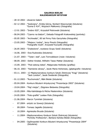 GALERIA BIELAK KALENDARIUM WYSTAW - 28 10 2002 - otwarcie Galerii - 02 12 2002 - "Sześciany", Emilia Górna, Norbert Wawrzyniak (biżuteria) "Guma E 414", Wojciech Małkowicz (fotografia) - 13 01 2003 - "Srebro 925", Krzysztof Piotrowski (biżuteria) - 06.04.2003 - "Czarno na białym", Dekada Fotografii Krakowskiej (portrety) - 05.05 2003 - "Archiwalia", 85 lat Firmy Foto Garzyńska (fotografia) - 23.05.2003 - "Miejsce i ludzie", Jerzy Pirecki (fotografia) "Fotografie myśli", Krzysztof Kurzydło (fotografia) - 26.05 2003 - "Znalezione", wystawa Grupy Sześć (biżuteria) - 16.06. 2003 - Ewa Rudowska (biżuteria) - 21.07. 2003 - "Tytan i stal", Lars Tornvaldsson (noże i biżuteria) - 08.09. 2003 - Esther Knobel, Wilhelm Tasso Mattar (biżuteria) - 15.09. 2003 - "Pod osłoną nieba", Małgorzata Hołówka (grafika) - 06.10. 2003 - "Kamienie obrazy", Jacek Maria Hohensee, (gliptografie i biżuteria) - 03.11. 2003 - 12 Międzynarodowy konkurs Sztuki Złotniczej "Krąg" (biżuteria) "Jack London", Jacek Świderski (fotografia) - 01.12.2003 - "Ruchomości", B&A Bielak (biżuteria) - 05.04.2004 - Konkurs Biżuterii Artystycznej "Prezentacje 2003" (biżuteria) - 19.04.2004 - "Pięć miejsc", Zbigniew Bielawka (fotografia) - 10.05.2004 - Mila Kalnitskaja & Micha Maslennikov (biżuteria) - 24.05.2004 - "Foto-grafiki" Lesław Pizło (fotografia) - 21.06.2004 - Marcin Tymiński (biżuteria) - 44.07.2004 - artyści ze Szwecji (biżuteria) - 44.09.2004 - Tomasz Jagiełło (biżuteria) - 44.10.2004 - Agnieszka Bruzda (biżuteria) - 44.11.2004 - Międzynarodowy Konkurs Sztuki Złotniczej (biżuteria) "Portrety Profesorów", Barbara Kańska Bielak (fotografia) - 44.04.2005 - Ogólnopolski Konkurs Biżuterii Artystycznej "Prezentacje 2004" (biżuteria) - 44.05.2005 - Jacek Byczewski (biżuteria) -44. 07.2005 - Biżuteria z Anglii - wystawa czołowych brytyjskich projektantów - 44.09.2005 - "Ptactwo oraz inne obiekty latające czyli 25 lat pracy we dwoje", Zofia i Witold Kozubscy (biżuteria) - 44.10.2005 - Bogumił Bytomski (biżuteria) - 10.04.2006 - "Kontrasty" - Ogólnopolski Otwarty Konkurs Biżuterii "Prezentacje 2005" (biżuteria) - 15.05. 2006 - "Jaworscy & Szymon", Joanna i Tadeusz Jaworscy (biżuteria) oraz Szymon Chmielewski (fotografia) - 26.06.2006 - "Kolarze" Jacek Wysokiński (biżuteria) i Paweł Rupiński (malarstwo) - 11.09.2006 - Anna, Alicja, Jan Jakub Wyganowscy (biżuteria) - 09.10.2006 - "Intymność", Marta Bożyk (grafika) - wystawa w ramach Miesiąca Grafiki w Krakowie - 30.10.2006 - Andrzej Boss (biżuteria) - 27.11.2006 - wystawa firmy GÓRECKI (biżuteria) - 04.12.2006 - "XV" STFZ 1991 - 2006, wystawa członków STFZ (biżuteria) - 09.03.2007 - "W Kadrze", Ewa Rosiek-Buszko (miniatury tkackie) - 16.04.2007 - Ogólnopolski Otwarty Konkurs Biżuterii "Prezentacje 2006" (biżuteria) - 14.05.2007 - "XL", Kamilla Rohn (biżuteria) - 11.06.2007 - "Design", Grupa Sześć (biżuteria) - 07.07.2007 - "The Consumer Society”, Paula Lindblom & Friends (biżuteria) - 11.08.2007 - Biżuteria z Włoch - 24.09.2007 - "Dla i Przeciw", Mariusz Pajączkowski (biżuteria) - 03.12.2007 - "Powrót", Cezary Łutowicz (biżuteria z krzemieniem pasiastym) - 44.04.2008 - Ogólnopolski Otwarty Konkurs Biżuterii "Prezentacje 2007" (biżuteria) - 12.05.2008 - Jan Suchodolski (biżuteria) - 23.06.2008 - PRO FORMA 2, Maryla Maria Dubiel (biżuteria) - 15.09.2008 - Yael Krakowski (biżuteria) - 11-12.2008 - "30/90", Barbara & Andrzej Bielak (biżuteria-fotografia) - 26.06.2009 - Horror Vacui międzynarodowa wystawa biżuterii