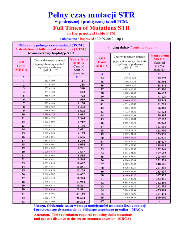 Pełny czas mutacji STR w podręcznej i praktycznej tabeli PCM. Full Times of Mutations STR in the practical table FTM ( ulepszono / improved / 30.09.2012 - stp.) Obliczanie pełnego czasu mutacji ( PCM ) Calculation of full-time of mutations ( FTM ) 67-markerowy haplotyp STR - ciąg dalszy / continuation Czas widocznych mutacji GD from MRCA Czas widocznych mutacji i jego wykładniczy mnożnik, uzyskany z podstawy 1,06713 (1...66) Years from MRCA Czas od MRCA 3 330 x 6,58 około lat: C 111 238 380 542 722 919 1 150 1 403 1 678 1 987 2 344 2 717 3 146 3 621 4 129 4 606 5 340 6 034 6 791 7 637 8 555 9 548 10 672 11 881 13 209 14 632 16 244 17 964 19 861 21 911 31 3 441 x 7,02 24 156 32 33 3 552 x 7,49 26 604 29 304 A 1 2 3 4 5 6 7 8 9 10 11 12 13 14 15 16 17 18 19 20 21 22 23 24 25 26 27 28 29 30 B 111 x 1,00 222 x 1,07 333 x 1,14 444 x 1,22 555 x 1,30 666 x 1,38 777 x 1,48 888 x 1,58 999 x 1,68 1 110 x 1,79 1 221 x 1,92 1 332 x 2,04 1 443 x 2,18 1 554 x 2,33 1 665 x 2,48 1 776 x 2,65 1 887 x 2,83 1 998 x 3,02 2 109 x 3,22 2 220 x 3,44 2 331 x 3,67 2 442 x 3,91 2 553 x 4,18 2 664 x 4,46 2 775 x 4,76 2 886 x 5,07 2 997 x 5,42 3 108 x 5,78 3 219 x 6,17 3 663 x 8,00 GD from i jego wykładniczy mnożnik, uzyskany z podstawy MRCA 1,06713 (1...66) A 34 35 36 37 38 39 40 41 42 43 44 45 46 47 48 49 50 51 52 53 54 55 56 57 58 59 60 61 62 63 64 65 66 67 Years from MRCA Czas od MRCA 7 326 x 68,25 około lat: C 32 192 35 392 38 841 42 590 46 693 51 125 55 944 61 211 66 900 73 122 79 805 87 113 95 023 103 610 112 900 123 030 133 977 145 827 158 615 172 548 187 612 203 907 221 538 240 616 261 318 283 637 307 825 333 946 362 200 392 797 425 814 461 471 500 000 - - B 3 774 x 8,53 3 885 x 9,11 3 996 x 9,72 4 107 x 10,37 4 218 x 11,07 4 329 x 11,81 4 440 x 12,60 4 551 x 13,45 4 662 x 14,35 4 773 x 15,32 4 884 x 16,34 4 995 x 17,44 5 106 x 18,61 5 217 x 19,86 5 328 x 21,19 5 439 x 22,62 5 550 x 24,14 5 661 x 25,76 5 772 x 27,48 5 883 x 29,33 5 994 x 31,30 6 105 x 33,40 6 216 x 35,64 6 327 x 38,03 6 438 x 40,59 6 549 x 43,31 6 660 x 46,22 6 771 x 49,32 6 882 x 52,63 6 993 x 56,17 7 104 x 59,94 7 215 x 63,96 Uwaga. Obliczanie czasu wymaga umiejętności ustalania liczby mutacji i genetycznego dystansu do najbliższego wspólnego przodka – MRCA Attention. Time calculation requires counting skills mutations and genetic distance to the recent common ancestor - MRCA) Powyższą tabelę PCM dla 67 markerowego haplotypu można także stosować - dla mutacji w haplotypie 25 markerowym, mnożąc je przez 2,65 - dla mutacji w haplotypie 37 markerowym, mnożąc je przez 1,50 - dla mutacji w haplotypie 111 markerowym, dzieląc je przez 1,75 Uwaga Środkowa kolumna (B) tej tabeli służy tylko uzasadnieniu wyniku. Zasady powstania podręcznej i praktycznej tabeli pełnego czasu mutacji (PCM) Tabela PCM powstała na podstawie następujących czynników 1. Podstawą obliczeń w tabeli jest statystycznie domiemana obecność jednej mutacji w najbardziej wolno mutującym markerze, DYS425 = 500000 lat, a tym samym i w pozostałych markerach tego haplotypu. (The basis of calculation in the table is statistically determined the presence of one mutation in the most slow mutating marker, DYS425 = 500,000 years, and thus, and other markers of this haplotype). 2. Ciąg wykładniczy (geometryczny) mutacji widocznych jest oparty na fakcie, że w haplotypie, wraz z kurczeniem się 67/1 do 1/67 miejsc jeszcze niezmutowanych, odwrotnie wzrasta od 1/67 do 67/1 ilość miejsc na mutacje powtórne, czyli statystycznie niewidoczne (na miejsce mutacji widocznych powstają niewidoczne). Według opublikowanych zwłaszcza przez FTDNA (J.Chandlera) i A. Klosowa tabel mutacji w parach ojciec-syn, do mutacji STR w najbardziej powolnym markerze DYS425 w 66 markerowym haplotypie (po zrezygnowaniu z jeszcze bardziej powolnego DYS472) dochodzi statystycznie co 500.000 lat. Tymczasem, biorąc pod uwagę obliczone z tabeli J. Chandlera i A. Klosowa tempo mutacji w haplotypie: jedna mutacja na około 111 lat, do statystycznego czasu zaistnienia tej mutacji DYS425, a tym samym i całego zestawu 66 mutacji widocznych, powstaje około 4505 mutacji. Tak więc w czasie 66 mutacji widocznych, dochodzi także, w markerach już zmutowanych, do bardzo licznych mutacji powtórnych, czyli 4439 statystycznie niewidocznych, odpowiednio opóźniających czas owych mutacji widocznych, w sumie około 68,25 razy. Mutacje widoczne spowalniają się, gdyż w ich miejsce powstają wtedy mutacje powtóre, czyli statystycznie niewidoczne. To spowolnianie tempa mutacji widocznych, spowodowane kurczeniem się dla nich miejsc dotąd niezmutowanych oraz nierównością tempa mutacji w poszczególnych markerach od jeden do około kilkadziesiąt lub kilkaset, trzeba dla cełów obliczeniowych wyrazić ciągiem wykładniczym. Dlatego, aby otrzymać pełny czas mutacji ( PCM ) dla każdej liczby mutacji w tym 67 minus 1 markerowym haplotypie, należy znaleźć iloraz ciągu wykładniczego, tj. “a” w funkcji wykładniczej a x (1...65). Tym ilorazem a jest uwidoczniona na tabeli PCM liczba 1,06713. Uwaga Powyższa zasada obliczania pełnego czasu mutacji (PCM), uwzględniająca pełny zestaw mutacji widocznych i niewidocznych (powtórnych) a) nie wymaga osobnych tablic na tzw. mutacje zwrotne (zob. w tablicach A.Klosowa); b) nie wymaga stosowania dla czasów "ewolucyjnych" (np. powyżej 10000 lat) dodatkowej tabeli 22-markerowego haplotypu z wybranych markerów powolnych (zob. tablica Klosowa); c) nie wymaga wreszcie tzw. ewolucyjnego "współczynnika Żywotovskyego" (0,000069 mutacji na marker na pokolenie), który przy zastosowaniu go do czasów bliskich, genealogicznych, zawyżając rezultat niekiedy aż trzykrotnie, wywołuje wśród genealogów i genetyków tak wiele sprzeciwu i krytyki. Równocześnie tablica PCM stwarza możliwość obliczania czasu najstarszych haplogrup i populacji, praktycznie od początku współczesnego człowieka. Krzywa wykładnicza czasu mutacji wid