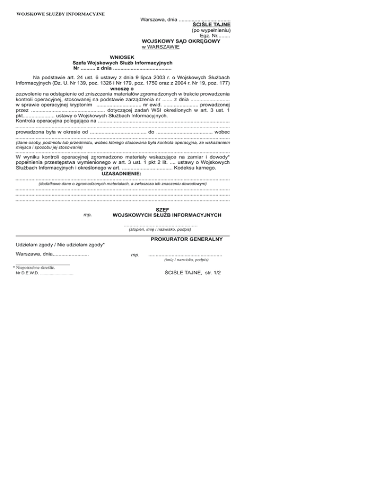 WOJSKOWE SŁUŻBY INFORMACYJNE Warszawa, dnia .................................... ŚCIŚLE TAJNE (po wypełnieniu) Egz. Nr......... WOJSKOWY SĄD OKRĘGOWY w WARSZAWIE WNIOSEK Szefa Wojskowych Służb Informacyjnych Nr .......... z dnia ........................................ Na podstawie art. 24 ust. 6 ustawy z dnia 9 lipca 2003 r. o Wojskowych Służbach Informacyjnych (Dz. U. Nr 139, poz. 1326 i Nr 179, poz. 1750 oraz z 2004 r. Nr 19, poz. 177) wnoszę o zezwolenie na odstąpienie od zniszczenia materiałów zgromadzonych w trakcie prowadzenia kontroli operacyjnej, stosowanej na podstawie zarządzenia nr ....... z dnia ........................... w sprawie operacyjnej kryptonim ............................... nr ewid. ........................ prowadzonej przez ................................................... dotyczącej zadań WSI określonych w art. 3 ust. 1 pkt...................... ustawy o Wojskowych Służbach Informacyjnych. Kontrola operacyjna polegająca na ........................................................................................... .................................................................................................................................................... prowadzona była w okresie od ....................................... do ....................................... wobec .................................................................................................................................................... (dane osoby, podmiotu lub przedmiotu, wobec którego stosowana była kontrola operacyjna, ze wskazaniem miejsca i sposobu jej stosowania) .................................................................................................................................................... W wyniku kontroli operacyjnej zgromadzono materiały wskazujące na zamiar i dowody* popełnienia przestępstwa wymienionego w art. 3 ust. 1 pkt 2 lit. .... ustawy o Wojskowych Służbach Informacyjnych i określonego w art. ................................... Kodeksu karnego. UZASADNIENIE: .................................................................................................................................................... (dodatkowe dane o zgromadzonych materiałach, a zwłaszcza ich znaczeniu dowodowym) .................................................................................................................................................... .................................................................................................................................................... .................................................................................................................................................... mp. SZEF WOJSKOWYCH SŁUŻB INFORMACYJNYCH ................................................... (stopień, imię i nazwisko, podpis) PROKURATOR GENERALNY Udzielam zgody / Nie udzielam zgody* Warszawa, dnia......................... mp. ................................................... (imię i nazwisko, podpis) * Niepotrzebne skreślić. Nr D.E.W.D. ............................ ŚCIŚLE TAJNE, str. 1/2 Warszawa, dnia.......................................... ŚCIŚLE TAJNE (po wypełnieniu) Egz. Nr......... Sygn. akt ........................... POSTANOWIENIE Wojskowy Sąd Okręgowy w Warszawie Sędzia....................................................................................................................................... przy udziale ....................................................................................... po rozpoznaniu wniosku Szefa Wojskowych Służb Informacyjnych w przedmiocie odstąpienia od zniszczenia materiałów zgromadzonych w wyniku kontroli operacyjnej zarządzonej w przypadku niecierpiącym zwłoki na podstawie art. 24 ust. 5 ustawy z dnia 9 lipca 2003 r. o Wojskowych Służbach Informacyjnych (Dz. U. Nr 139, poz. 1326 i Nr 179, poz. 1750 oraz z 2004 r. Nr 19, poz. 177) postanawia ZEZWOLIĆ / NIE ZEZWOLIĆ* na odstąpienie od zniszczenia materiałów zgromadzonych w wyniku kontroli operacyjnej polegającej na ......................................................................................................................... (rodzaj kontroli operacyjnej) w sprawie o kryptonimie ........................... nr ew. ............................... zarządzonej przez Szefa Wojskowych Służb Informacyjnych zarządzeniem nr.... z dnia ................................ na okres .................................... tygodni / miesięcy*, na kontynuowanie której Sąd nie udzielił zgody postanowieniem nr.............................. z dnia ............................................. Uzasadnienie: .......................................................................................................................... (w przypadku nieudzielenia zezwolenia) ................................................................................................................................................... ................................................................................................................................................... ................................................................................................................................................... ................................................................................................................................................... ................................................................................................................................................... ................................................................................................................................................... ................................................................................................................................................... ..............................................................................