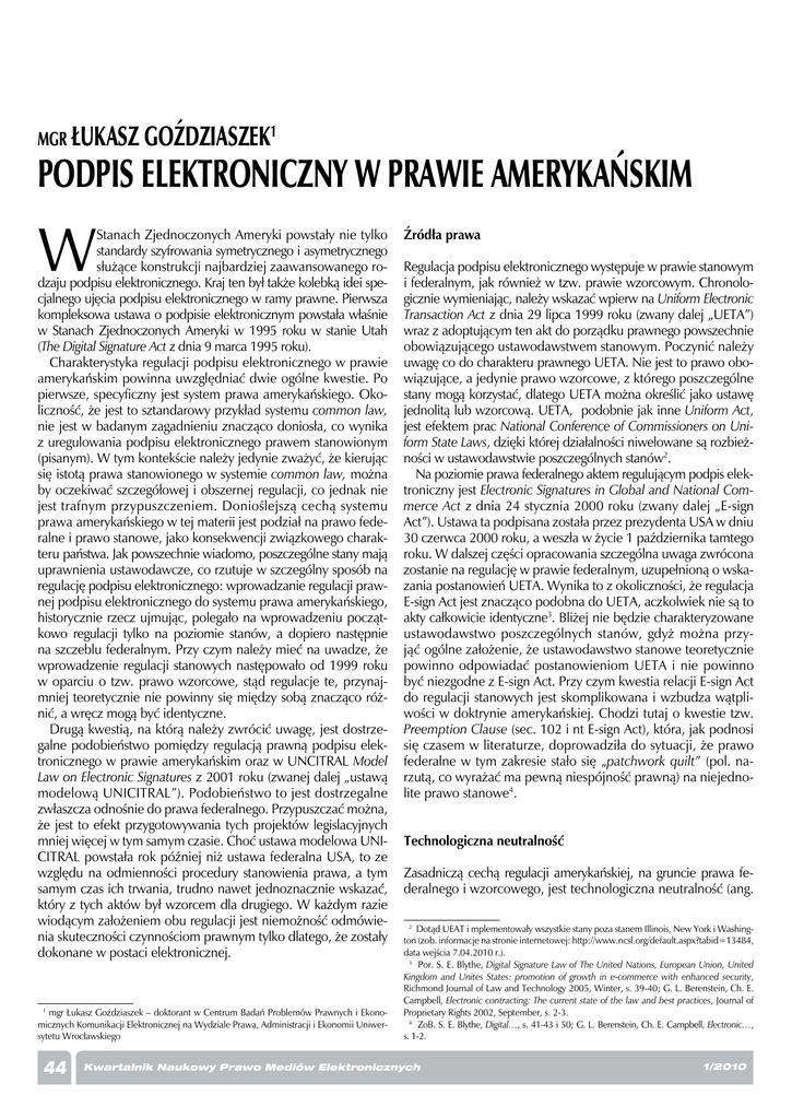Podpis elektroniczny w prawie amerykańskim mgr Łukasz Goździaszek1 Podpis elektroniczny w prawie amerykańskim W Stanach Zjednoczonych Ameryki powstały nie tylko standardy szyfrowania symetrycznego i asymetrycznego służące konstrukcji najbardziej zaawansowanego rodzaju podpisu elektronicznego. Kraj ten był także kolebką idei specjalnego ujęcia podpisu elektronicznego w ramy prawne. Pierwsza kompleksowa ustawa o podpisie elektronicznym powstała właśnie w Stanach Zjednoczonych Ameryki w 1995 roku w stanie Utah (The Digital Signature Act z dnia 9 marca 1995 roku). Charakterystyka regulacji podpisu elektronicznego w prawie amerykańskim powinna uwzględniać dwie ogólne kwestie. Po pierwsze, specyficzny jest system prawa amerykańskiego. Okoliczność, że jest to sztandarowy przykład systemu common law, nie jest w badanym zagadnieniu znacząco doniosła, co wynika z uregulowania podpisu elektronicznego prawem stanowionym (pisanym). W tym kontekście należy jedynie zważyć, że kierując się istotą prawa stanowionego w systemie common law, można by oczekiwać szczegółowej i obszernej regulacji, co jednak nie jest trafnym przypuszczeniem. Donioślejszą cechą systemu prawa amerykańskiego w tej materii jest podział na prawo federalne i prawo stanowe, jako konsekwencji związkowego charakteru państwa. Jak powszechnie wiadomo, poszczególne stany mają uprawnienia ustawodawcze, co rzutuje w szczególny sposób na regulację podpisu elektronicznego: wprowadzanie regulacji prawnej podpisu elektronicznego do systemu prawa amerykańskiego, historycznie rzecz ujmując, polegało na wprowadzeniu początkowo regulacji tylko na poziomie stanów, a dopiero następnie na szczeblu federalnym. Przy czym należy mieć na uwadze, że wprowadzenie regulacji stanowych następowało od 1999 roku w oparciu o tzw. prawo wzorcowe, stąd regulacje te, przynajmniej teoretycznie nie powinny się między sobą znacząco różnić, a wręcz mogą być identyczne. Drugą kwestią, na którą należy zwrócić uwagę, jest dostrzegalne podobieństwo pomiędzy regulacją prawną podpisu elektronicznego w prawie amerykańskim oraz w UNCITRAL Model Law on Electronic Signatures z 2001 roku (zwanej dalej „ustawą modelową UNICITRAL”). Podobieństwo to jest dostrzegalne zwłaszcza odnośnie do prawa federalnego. Przypuszczać można, że jest to efekt przygotowywania tych projektów legislacyjnych mniej więcej w tym samym czasie. Choć ustawa modelowa UNICITRAL powstała rok później niż ustawa federalna USA, to ze względu na odmienności procedury stanowienia prawa, a tym samym czas ich trwania, trudno nawet jednoznacznie wskazać, który z tych aktów był wzorcem dla drugiego. W każdym razie wiodącym założeniem obu regulacji jest niemożność odmówienia skuteczności czynnościom prawnym tylko dlatego, że zostały dokonane w postaci elektronicznej. mgr Łukasz Goździaszek – doktorant w Centrum Badań Problemów Prawnych i Ekonomicznych Komunikacji Elektronicznej na Wydziale Prawa, Administracji i Ekonomii Uniwersytetu Wrocławskiego 44 Źródła prawa Regulacja podpisu elektronicznego występuje w prawie stanowym i federalnym, jak również w tzw. prawie wzorcowym. Chronologicznie wymieniając, należy wskazać wpierw na Uniform Electronic Transaction Act z dnia 29 lipca 1999 roku (zwany dalej „UETA”) wraz z adoptującym ten akt do porządku prawnego powszechnie obowiązującego ustawodawstwem stanowym. Poczynić należy uwagę co do charakteru prawnego UETA. Nie jest to prawo obowiązujące, a jedynie prawo wzorcowe, z którego poszczególne stany mogą korzystać, dlatego UETA można określić jako ustawę jednolitą lub wzorcową. UETA, podobnie jak inne Uniform Act, jest efektem prac National Conference of Commissioners on Uniform State Laws, dzięki której działalności niwelowane są rozbieżności w ustawodawstwie poszczególnych stanów. Na poziomie prawa federalnego aktem regulującym podpis elektroniczny jest Electronic Signatures in Global and National Commerce Act z dnia 24 stycznia 2000 roku (zwany dalej „E-sign Act”). Ustawa ta podpisana została przez prezydenta USA w dniu 30 czerwca 2000 roku, a weszła w życie 1 października tamtego roku. W dalszej części opracowania szczególna uwaga zwrócona zostanie na regulację w prawie federalnym, uzupełnioną o wskazania postanowień UETA. Wynika to z okoliczności, że regulacja E-sign Act jest znacząco podobna do UETA, aczkolwiek nie są to akty całkowicie identyczne. Bliżej nie będzie charakteryzowane ustawodawstwo poszczególnych stanów, gdyż można przyjąć ogólne założenie, że ustawodawstwo stanowe teoretycznie powinno odpowiadać postanowieniom UETA i nie powinno być niezgodne z E-sign Act. Przy czym kwestia relacji E-sign Act do regulacji stanowych jest skomplikowana i wzbudza wątpliwości w doktrynie amerykańskiej. Chodzi tutaj o kwestie tzw. Preemption Clause (sec. 102 i nt E-sign Act), która, jak podnosi się czasem w literaturze, doprowadziła do sytuacji, że prawo federalne w tym zakresie stało się „patchwork quilt” (pol. narzutą, co wyrażać ma pewną niespójność prawną) na niejednolite prawo stanowe. Technologiczna neutralność Zasadniczą cechą regulacji amerykańskiej, na gruncie prawa federalnego i wzorcowego, jest technologiczna neutralność (ang. Dotąd UEAT i mplementowały wszystkie stany poza stanem Illinois, New York i Washington (zob. informacje na stronie internetowej: http://www.ncsl.org/default.aspx?tabid=13484, data wejścia 7.04.2010 r.). Por. S. E. Blythe, Digital Signature Law of The United Nations, European Union, United Kingdom and Unites States: promotion of growth in e-commerce with enhanced security, Richmond Journal of Law and Technology 2005, Winter, s. 39-40; G. L. Berenstein, Ch. E. Campbell, Electronic contracting: The current state of the law and best practices, Journal of Proprietary Rights 2002, September, s. 2-3. ZoB. S. E. Blythe