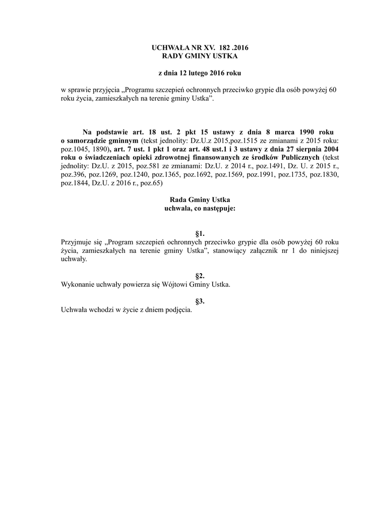 UCHWAŁA NR XV. 182 .2016 RADY GMINY USTKA z dnia 12 lutego 2016 roku w sprawie przyjęcia „Programu szczepień ochronnych przeciwko grypie dla osób powyżej 60 roku życia, zamieszkałych na terenie gminy Ustka”. Na podstawie art. 18 ust. 2 pkt 15 ustawy z dnia 8 marca 1990 roku o samorządzie gminnym (tekst jednolity: Dz.U.z 2015,poz.1515 ze zmianami z 2015 roku: poz.1045, 1890), art. 7 ust. 1 pkt 1 oraz art. 48 ust.1 i 3 ustawy z dnia 27 sierpnia 2004 roku o świadczeniach opieki zdrowotnej finansowanych ze środków Publicznych (tekst jednolity: Dz.U. z 2015, poz.581 ze zmianami: Dz.U. z 2014 r., poz.1491, Dz. U. z 2015 r., poz.396, poz.1269, poz.1240, poz.1365, poz.1692, poz.1569, poz.1991, poz.1735, poz.1830, poz.1844, Dz.U. z 2016 r., poz.65) Rada Gminy Ustka uchwala, co następuje: §1. Przyjmuje się „Program szczepień ochronnych przeciwko grypie dla osób powyżej 60 roku życia, zamieszkałych na terenie gminy Ustka”, stanowiący załącznik nr 1 do niniejszej uchwały. §2. Wykonanie uchwały powierza się Wójtowi Gminy Ustka. §3. Uchwała wchodzi w życie z dniem podjęcia. Załącznik nr 1 do Uchwały Nr XV.182 .2016 Rady Gminy Ustka z dnia 12 lutego 2016 roku „Program szczepień ochronnych przeciwko grypie dla osób powyżej 60 roku życia, zamieszkałych na terenie gminy Ustka” I. OPIS PROBLEMU ZDROWOTNEGO 1. Grypa jako poważne zagrożenie zdrowia osób starszych Grypa – jest ostrą, bardzo zakaźną chorobą układu oddechowego, przebiega z gorączką, kaszlem i ogólnym osłabieniem. Grypa u ludzi jest wywoływana przez wirusy grypy A, B, C. Pierwszy z wirusów charakteryzuje się dużą zmiennością antygenową, dzieli się na podtypy w zależności od różnic w białkach powierzchniowych wirusa: hemaglutyniny (H) i neuraminidazy (A), drugi ma mniejsze znaczenie epidemiologiczne, trzeci wywołuje zazwyczaj zakażenia bezobjawowe. Grypa cechuje się wysokim wskaźnikiem zapadalności, zwłaszcza u osób młodych i niskim wskaźnikiem śmiertelności. Śmiertelność jest najwyższa u osób starszych. Śmiertelność wynosi zazwyczaj 0,1-0,5%, tzn. umiera 1-5 osób na tysiąc chorych. W przypadku osób powyżej 65 r. ż. śmiertelność wynosi ok. 1%. Ponad 90% zgonów z powodu grypy występuje u osób w podeszłym wieku. Powikłaniami grypy mogą być m. in. zapalenie płuc, zapalenie mięśnia sercowego i osierdzia, zapalenie ucha środkowego, zespół wstrząsu toksycznego, zapalenie mięśni i mioglobinuria (mogąca być przyczyną niewydolności nerek), wystąpienie lub zaostrzenia kłębuszkowego zapalenia nerek, niewydolność nerek, odrzucenie przeszczepu, choroby naczyniowe mózgu, nasilenie padaczki, toksyczna encefalopatia, zapalenie mózgu, poinfekcyjne zapalenie opon mózgowych, wzrost przypadków choroby Parkinsona, wylewy podpajęczynówkowe, śpiączkowe zapalenie mózgu, ostre psychozy, schizofrenia. II. Epidemiologia grypy Dane WHO wskazują, że grypa jest istotnym problemem zdrowotnym. Choruje na nią na świecie ok. 5-25% populacji, umiera 500 000 do 1 000 000 osób rocznie. Wg danych ECDC rocznie choruje w wyniku zakażenia wirusem grypy ok. 10% Europejczyków, zaś powikłania pogrypowe wiążą się z koniecznością hospitalizacji u setek tysięcy osób. Liczba zgłoszonych przypadków grypy lub zachorowań na grypę w powiecie słupskim w okresie od 16 do 22 lutego 2013 roku wynosiła 886 osób (wykres nr 1). Wykres nr 1. Liczba zgłoszonych przypadków grypy lub podejrzeń zachorowań na grypę w poszczególnych powiatach (w okresie od 16 do 22 lutego 2013r.) 20-letnia analiza poziomów podejrzeń zachorowań i zachorowań na grypę, wskazuje na spadek osiąganych wartości zachorowań, prawidłowość ta jest obserwowana również w większości przypadków okresowych wzrostów wskaźnika zapadalności. Charakterystyczna dla wirusa grypy zmienność i potencjał epidemiczny powoduje, że mimo malejącego wskaźnika zapadalności pozostaje on nadal istotnym zagrożeniem epidemiologicznym. do 50 od 50,1 do 100 od 100,1 do 150 od 150,1 do 200 pow. 200 Wykres nr 2. Średnia dzienna zapadalność w poszczególnych powiatach woj. pomorskiego w okresie od 16 do 22 lutego 2013 roku. a) Populacja podlegająca jednostce samorządu terytorialnego i populacja kwalifikująca się do włączenia do programu Wg danych z ewidencji ludności na terenie gminy Ustka mieszka 8026 osób, w tym w wieku powyżej 60 roku życia 1660 osób (stan na dzień 12 listopada 2015 roku). Do programu planowana jest do włączenia populacja osób spełniających następujące wskazania: – osoby w wieku powyżej 60 roku życia – w formie akcji szczepień realizowanych ambulatoryjnie. Wykres nr 3. Liczba zgłoszonych przypadków grypy i podejrzeń zachorowań na grypę w woj. pomorskim od 1 września 2012 r. b) Obecne postępowanie w zakresie profilaktyki zachorowań na grypę u osób powyżej 60 roku życia, z uwzględnieniem świadczeń opieki zdrowotnej finansowanych ze środków publicznych Profilaktyka w przypadku grypy polega na stosowaniu szczepień ochronnych, leków przeciwwirusowych i przestrzeganiu podstawowych zasad higieny, noszeniu maseczek, profilaktyce farmakologicznej oraz izolacji chorych. Szczepienia ochronne przeciwko grypie są rekomendowane jako podstawowa metoda profilaktyki zachorowań przez kilkanaście uznanych Towarzystw Naukowych na świecie w tym Komitet Doradczy ds. Szczepień (ACIP) WHO, Amerykańską Akademię Pediatrii. Efektywność szczepień jest uwarunkowana przez wiek, poziom immunokompetencji osób szczepionych, skład szczepionki. Z uwagi na dużą zmienność genetyczną wirusa, co roku zachorowania wywołuje inny szczep wirusa grypy. Skutkiem tego jest konieczność corocznego ponawiania szczepień ochronnych preparatem o innym składzie, uwzględniającym prognozowane szczepy na dany sezon epidemiczny. W przypadku Beneluksu lub Hiszpanii odsetek uodpornionych w analizowanej grupie wiekowej sięga 90%. Polska pod 
