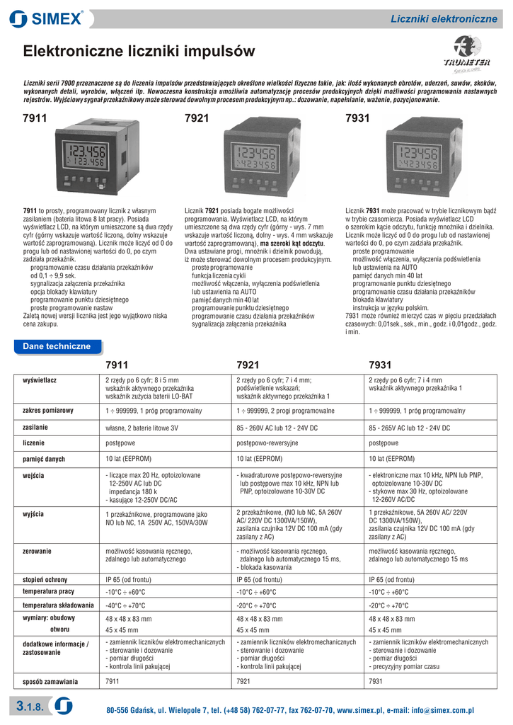 R SIMEX Liczniki elektroniczne Elektroniczne liczniki impulsów Liczniki serii 7900 przeznaczone s¹ do liczenia impulsów przedstawiaj¹cych okreœlone wielkoœci fizyczne takie, jak: iloœæ wykonanych obrotów, uderzeñ, suwów, skoków, wykonanych detali, wyrobów, w³¹czeñ itp. Nowoczesna konstrukcja umo¿liwia automatyzacjê procesów produkcyjnych dziêki mo¿liwoœci programowania nastawnych rejestrów. Wyjœciowy sygna³ przekaŸnikowy mo¿e sterowaæ dowolnym procesem produkcyjnym np.: dozowanie, nape³nianie, wa¿enie, pozycjonowanie. 7911 7921 7931 7911 to prosty, programowany licznik z w³asnym zasilaniem (bateria litowa 8 lat pracy). Posiada wyœwietlacz LCD, na którym umieszczone s¹ dwa rzêdy cyfr (górny wskazuje wartoœæ liczon¹, dolny wskazuje wartoœæ zaprogramowan¹). Licznik mo¿e liczyæ od 0 do progu lub od nastawionej wartoœci do 0, po czym zadzia³a przekaŸnik. w programowanie czasu dzia³ania przekaŸników od 0,1 ÷ 9,9 sek. w sygnalizacja za³¹czenia przekaŸnika w opcja blokady klawiatury w programowanie punktu dziesiêtnego w proste programowanie nastaw Zalet¹ nowej wersji licznika jest jego wyj¹tkowo niska cena zakupu. Licznik 7921 posiada bogate mo¿liwoœci programowania. Wyœwietlacz LCD, na którym umieszczone s¹ dwa rzêdy cyfr (górny - wys. 7 mm wskazuje wartoœæ liczon¹, dolny - wys. 4 mm wskazuje wartoœæ zaprogramowan¹), ma szeroki k¹t odczytu. Dwa ustawiane progi, mno¿nik i dzielnik powoduj¹, i¿ mo¿e sterowaæ dowolnym procesem produkcyjnym. w proste programowanie w funkcja liczenia cykli w mo¿liwoœæ w³¹czenia, wy³¹czenia podœwietlenia lub ustawienia na AUTO w pamiêæ danych min 40 lat w programowanie punktu dziesiêtnego w programowanie czasu dzia³ania przekaŸników sygnalizacja za³¹czenia przekaŸnika Licznik 7931 mo¿e pracowaæ w trybie licznikowym b¹dŸ w trybie czasomierza. Posiada wyœwietlacz LCD o szerokim k¹cie odczytu, funkcjê mno¿nika i dzielnika. Licznik mo¿e liczyæ od 0 do progu lub od nastawionej wartoœci do 0, po czym zadzia³a przekaŸnik. w proste programowanie w mo¿liwoœæ w³¹czenia, wy³¹czenia podœwietlenia lub ustawienia na AUTO w pamiêæ danych min 40 lat w programowanie punktu dziesiêtnego w programowanie czasu dzia³ania przekaŸników w blokada klawiatury w instrukcja w jêzyku polskim. 7931 mo¿e równie¿ mierzyæ czas w piêciu przedzia³ach czasowych: 0,01sek., sek., min., godz. i 0,01godz., godz. i min. Dane techniczne 7911 7921 7931 wyœwietlacz 2 rzêdy po 6 cyfr; 8 i 5 mm wskaŸnik aktywnego przekaŸnika wskaŸnik zu¿ycia baterii LO-BAT 2 rzêdy po 6 cyfr; 7 i 4 mm; podœwietlenie wskazañ; wskaŸnik aktywnego przekaŸnika 1 2 rzêdy po 6 cyfr; 7 i 4 mm wskaŸnik aktywnego przekaŸnika 1 zakres pomiarowy 1 ÷ 999999, 1 próg programowalny 1 ÷ 999999, 2 progi programowalne 1 ÷ 999999, 1 próg programowalny zasilanie w³asne, 2 baterie litowe 3V 85 - 260V AC lub 12 - 24V DC 85 - 265V AC lub 12 - 24V DC liczenie postêpowe postêpowo-rewersyjne postêpowe pamiêæ danych 10 lat (EEPROM) 10 lat (EEPROM) 10 lat (EEPROM) wejœcia - licz¹ce max 20 Hz, optoizolowane 12-250V AC lub DC impedancja 180 kW - kasuj¹ce 12-250V DC/AC - kwadraturowe postêpowo-rewersyjne lub postêpowe max 10 kHz, NPN lub PNP, optoizolowane 10-30V DC - elektroniczne max 10 kHz, NPN lub PNP, optoizolowane 10-30V DC - stykowe max 30 Hz, optoizolowane 12-260V AC/DC wyjœcia 1 przekaŸnikowe, programowane jako NO lub NC, 1A 250V AC, 150VA/30W 2 przekaŸnikowe, (NO lub NC, 5A 260V AC/ 220V DC 1300VA/150W), zasilania czujnika 12V DC 100 mA (gdy zasilany z AC) 1 przekaŸnikowe, 5A 260V AC/ 220V DC 1300VA/150W), zasilania czujnika 12V DC 100 mA (gdy zasilany z AC) zerowanie mo¿liwoœæ kasowania rêcznego, zdalnego lub automatycznego - mo¿liwoœæ kasowania rêcznego, zdalnego lub automatycznego 15 ms, - blokada kasowania mo¿liwoœæ kasowania rêcznego, zdalnego lub automatycznego 15 ms stopieñ ochrony IP 65 (od frontu) IP 65 (od frontu) IP 65 (od frontu) temperatura pracy -10°C ÷ +60°C -10°C ÷ +60°C -10°C ÷ +60°C temperatura sk³adowania -40°C ÷ +70°C -20°C ÷ +70°C -20°C ÷ +70°C wymiary: obudowy 48 x 48 x 83 mm 48 x 48 x 83 mm 48 x 48 x 83 mm 45 x 45 mm 45 x 45 mm 45 x 45 mm dodatkowe informacje / zastosowanie - zamiennik liczników elektromechanicznych - sterowanie i dozowanie - pomiar d³ugoœci - kontrola linii pakuj¹cej - zamiennik liczników elektromechanicznych - sterowanie i dozowanie - pomiar d³ugoœci - kontrola linii pakuj¹cej - zamiennik liczników elektromechanicznych - sterowanie i dozowanie - pomiar d³ugoœci - precyzyjny pomiar czasu sposób zamawiania 7911 7921 7931 otworu 3.1.8. 80-556 Gdañsk, ul. Wielopole 7, tel. (+48 58) 762-07-77, fax 762-07-70, www.simex.pl, e-mail: [email protected]