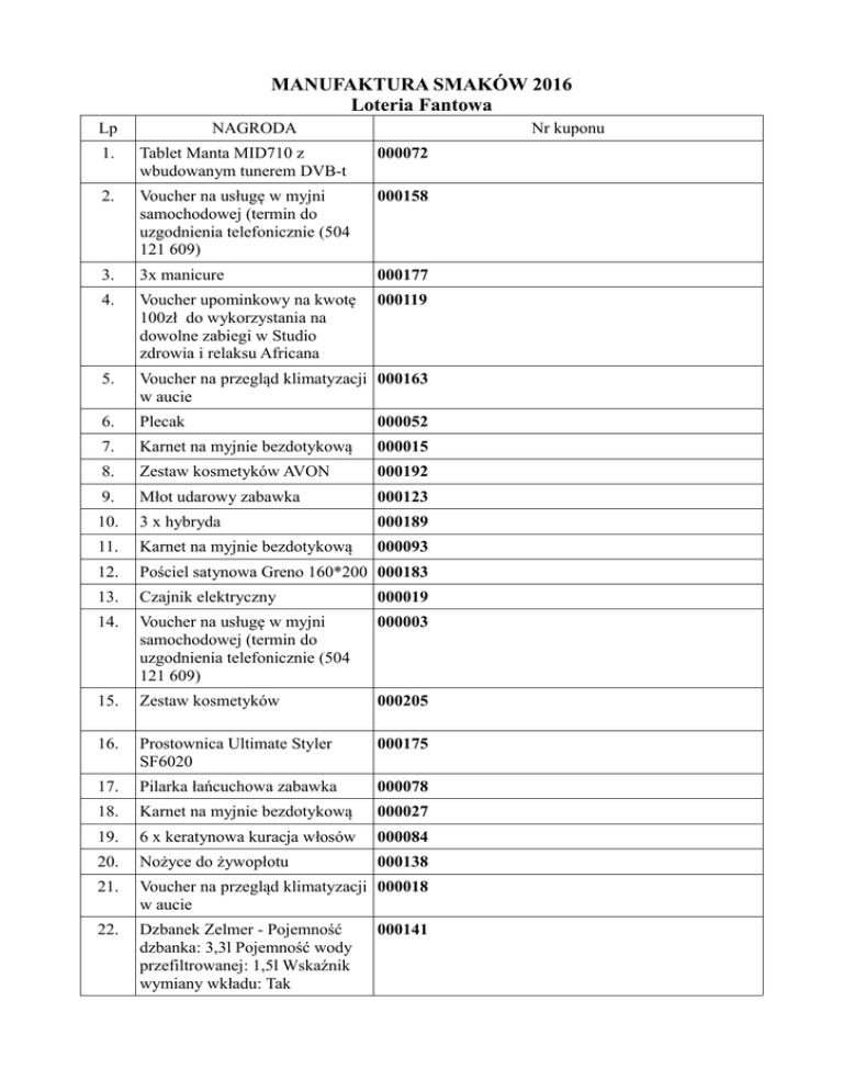 MANUFAKTURA SMAKÓW 2016 Loteria Fantowa Lp NAGRODA Nr kuponu 1. Tablet Manta MID710 z wbudowanym tunerem DVB-t 000072 2. Voucher na usługę w myjni samochodowej (termin do uzgodnienia telefonicznie (504 121 609) 000158 3. 3x manicure 000177 4. Voucher upominkowy na kwotę 100zł do wykorzystania na dowolne zabiegi w Studio zdrowia i relaksu Africana 000119 5. Voucher na przegląd klimatyzacji 000163 w aucie 6. Plecak 000052 7. Karnet na myjnie bezdotykową 000015 8. Zestaw kosmetyków AVON 000192 9. Młot udarowy zabawka 000123 10. 3 x hybryda 000189 11. Karnet na myjnie bezdotykową 000093 12. Pościel satynowa Greno 160*200 000183 13. Czajnik elektryczny 000019 14. Voucher na usługę w myjni samochodowej (termin do uzgodnienia telefonicznie (504 121 609) 000003 15. Zestaw kosmetyków 000205 16. Prostownica Ultimate Styler SF6020 000175 17. Pilarka łańcuchowa zabawka 000078 18. Karnet na myjnie bezdotykową 000027 19. 6 x keratynowa kuracja włosów 000084 20. Nożyce do żywopłotu 000138 21. Voucher na przegląd klimatyzacji 000018 w aucie 22. Dzbanek Zelmer - Pojemność dzbanka: 3,3l Pojemność wody przefiltrowanej: 1,5l Wskaźnik wymiany wkładu: Tak 000141 23. Voucher na 300 jaj 000121 24. Blender elektryczny 000118 25. Karnet na myjnie bezdotykową 000048 26. Spieniacz do mleka - Stal nierdzewna 000160 27. Radio przenośne 000087 28. Karnet na myjnie bezdotykową 000060 29. Pobyt 2 dniowy dla 1 os w 000109 hotelu Słoneczny Zdrój w Busko Zdrój 30. Trampolina 000186 SPONSORZY JW KOMPUTERYWojciech Pernak Opole Lub. Usługi motoryzacyjne Agnieszka Mirosław Opole Lub. Zakład fryzjerski IMAGE Kinga Głazowska Opole Lub. Studio zdrowia i relaksu AFICANA w Opolu Lub. BSS COMAPNY Dariusz SkowrońskiOpole Lub. Sklep PLASTUŚ Edyta Kramek Opole Lub. Myjnia bezdotykowa Piotr Głazowski P.U.H. Kozak Art.Ogrodnicze, Leśne Skutery Opole Lub. AVON Iwona Sidor PATRIW Ferma drobiu SŁOWIK Majdan Trzebieski MAX ELEKTRO Grzegorz Wosik MRÓWKA Opole Lub. Justyna Lankamer FruVitaLand, Frukto Bis Ziętek - Beata Zietek