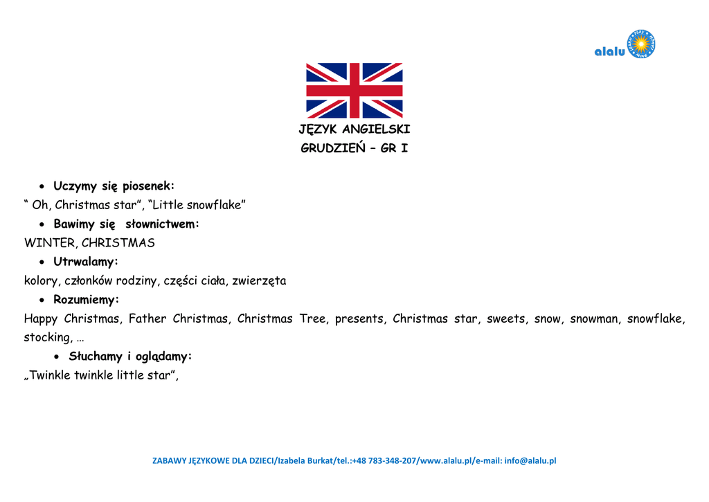 JĘZYK ANGIELSKI GRUDZIEŃ – GR I Uczymy się piosenek: “ Oh, Christmas star”, “Little snowflake” Bawimy się słownictwem: WINTER, CHRISTMAS Utrwalamy: kolory, członków rodziny, części ciała, zwierzęta Rozumiemy: Happy Christmas, Father Christmas, Christmas Tree, presents, Christmas star, sweets, snow, snowman, snowflake, stocking, … Słuchamy i oglądamy: „Twinkle twinkle little star”, ZABAWY JĘZYKOWE DLA DZIECI/Izabela Burkat/tel.:+48 783-348-207/www.alalu.pl/e-mail: [email protected] JĘZYK ANGIELSKI GRUDZIEŃ - GR II Uczymy się piosenek: “Oh, Christmas star”,“ A ball for the Christmas tree”,” We wish you a happy Christmas”, “Little Snowflake” Bawimy się słownictwem: WINTER, CHRISTMAS, Utrwalamy: kolory, członków rodziny, części ciała, zwierzęta Rozumiemy: Christmas Tree, Father Christmas, ball, Christmas star, Happy Christmas, presents, sweets, snow, snowman, , red nose, let’s make a snowmen… little snowflake, falling on my head, on my nose, in my hand, bell, We wish you a Happy Christmas and a Happy New Year Słuchamy i oglądamy: “Dancing Christmas Tree”, „Twinkle twinkle little star”, ZABAWY JĘZYKOWE DLA DZIECI/Izabela Burkat/tel.:+48 783-348-207/www.alalu.pl/e-mail: [email protected] JĘZYK ANGIELSKI GRUDZIEŃ – GR III Uczymy się piosenek: „Little snowflake”, „ We wish you a Happy Christmas”, ”Jingle bells”, „Twinkle twinkle little star”, „ Dancing Christmas Tree” Bawimy sie słownictwem: WINTER, CHRISTMAS Utrwalamy : kolory, liczby, członków rodziny, części ciała, zwierzęta Rozumiemy: Happy Christmas, Father Christmas, Christmas Tree, We wish you a Happy Christmas, and a Happy New Year, ball, bell, presents, Christmas star, sweets, snow, snowman, snowflake, falling on my head, on my nose, in my hands, It’ s cold, ice, red nose let’s make a snowmen, stocking, shake your head, kick your legs, wave your arms, jump up and down, turn around Słuchamy i oglądamy: Christmas songs ZABAWY JĘZYKOWE DLA DZIECI/Izabela Burkat/tel.:+48 783-348-207/www.alalu.pl/e-mail: [email protected]