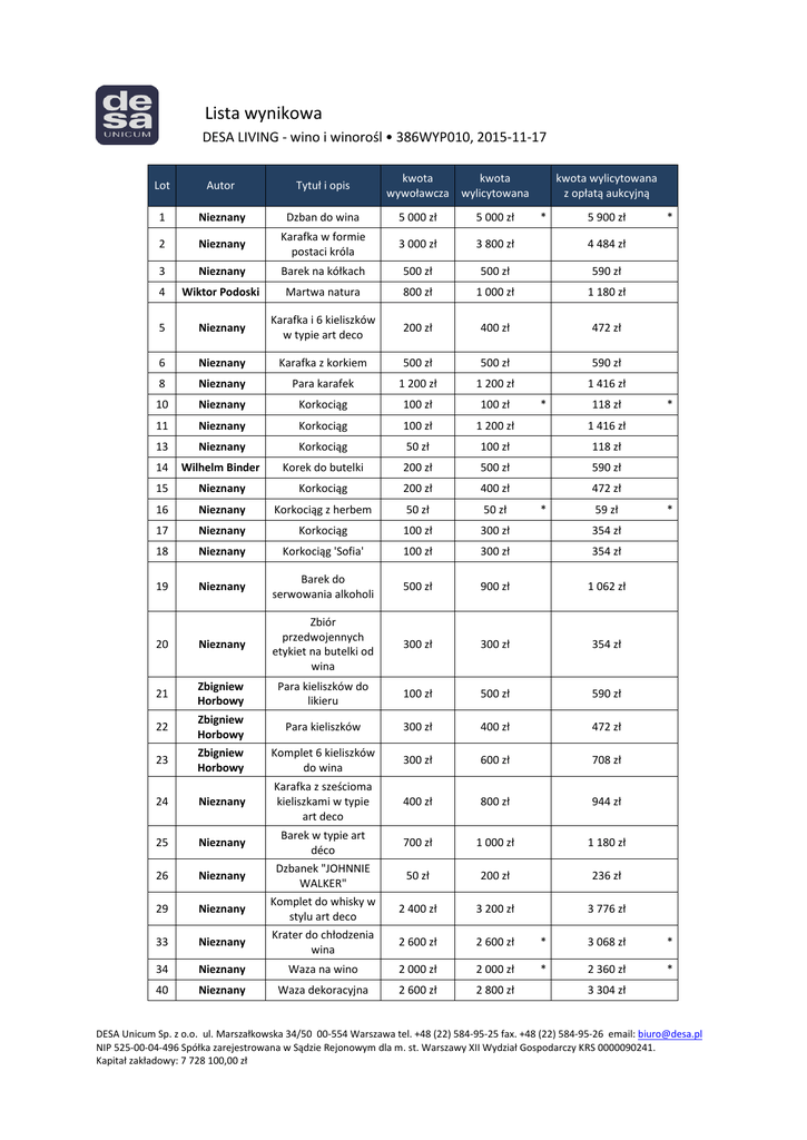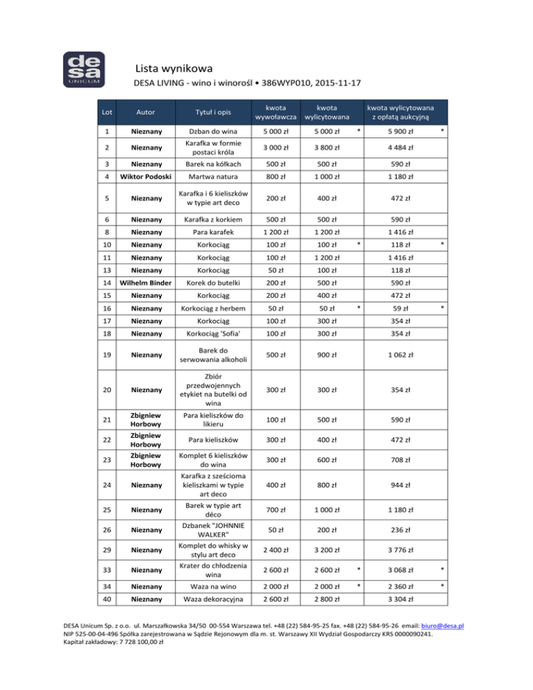 Lista wynikowa DESA LIVING - wino i winorośl • 386WYP010, 2015-11-17 kwota kwota wywoławcza wylicytowana kwota wylicytowana z opłatą aukcyjną Lot Autor Tytuł i opis 1 Nieznany Dzban do wina 5 000 zł 5 000 zł 2 Nieznany Karafka w formie postaci króla 3 000 zł 3 800 zł 4 484 zł 3 Nieznany Barek na kółkach 500 zł 500 zł 590 zł 4 Wiktor Podoski Martwa natura 800 zł 1 000 zł 1 180 zł 5 Nieznany Karafka i 6 kieliszków w typie art deco 200 zł 400 zł 472 zł 6 Nieznany Karafka z korkiem 500 zł 500 zł 590 zł 8 Nieznany Para karafek 1 200 zł 1 200 zł 1 416 zł 10 Nieznany Korkociąg 100 zł 100 zł 11 Nieznany Korkociąg 100 zł 1 200 zł 1 416 zł 13 Nieznany Korkociąg 50 zł 100 zł 118 zł 14 Wilhelm Binder Korek do butelki 200 zł 500 zł 590 zł 15 Nieznany Korkociąg 200 zł 400 zł 472 zł 16 Nieznany Korkociąg z herbem 50 zł 50 zł 17 Nieznany Korkociąg 100 zł 300 zł 354 zł 18 Nieznany Korkociąg 'Sofia' 100 zł 300 zł 354 zł 19 Nieznany Barek do serwowania alkoholi 500 zł 900 zł 1 062 zł 20 Nieznany Zbiór przedwojennych etykiet na butelki od wina 300 zł 300 zł 354 zł 21 Zbigniew Horbowy Para kieliszków do likieru 100 zł 500 zł 590 zł Para kieliszków 300 zł 400 zł 472 zł Komplet 6 kieliszków do wina 300 zł 600 zł 708 zł 22 23 Zbigniew Horbowy Zbigniew Horbowy * * * 5 900 zł 118 zł 59 zł * * * 24 Nieznany Karafka z sześcioma kieliszkami w typie art deco 400 zł 800 zł 944 zł 25 Nieznany Barek w typie art déco 700 zł 1 000 zł 1 180 zł 26 Nieznany Dzbanek "JOHNNIE WALKER" 50 zł 200 zł 236 zł 29 Nieznany Komplet do whisky w stylu art deco 2 400 zł 3 200 zł 3 776 zł 33 Nieznany Krater do chłodzenia wina 2 600 zł 2 600 zł * 3 068 zł * 34 Nieznany Waza na wino 2 000 zł 2 000 zł * 2 360 zł * 40 Nieznany Waza dekoracyjna 2 600 zł 2 800 zł 3 304 zł DESA Unicum Sp. z o.o. ul. Marszałkowska 34/50 00-554 Warszawa tel. +48 (22) 584-95-25 fax. +48 (22) 584-95-26 email: [email protected] NIP 525-00-04-496 Spółka zarejestrowana w Sądzie Rejonowym dla m. st. Warszawy XII Wydział Gospodarczy KRS 0000090241. Kapitał zakładowy: 7 728 100,00 zł Lista wynikowa DESA LIVING - wino i winorośl • 386WYP010, 2015-11-17 46 Wilhelm Ertelt Martwa natura z flaszą wina 2 400 zł 2 400 zł 47 Nieznany Barek w typie art déco 900 zł 1 500 zł 1 770 zł 48 Nieznany 500 zł 700 zł 826 zł 49 Nieznany 300 zł 300 zł * 354 zł * 54 Nieznany 300 zł 600 zł * 708 zł * 55 Nieznany Winorośl 500 zł 500 zł 590 zł 57 Nieznany Afisz reklamowy szampana 'Dealul Zorilor' 100 zł 300 zł 354 zł 60 Władysław Z. Rogalski Świecznik pięcioświecowy 5 000 zł 7 500 zł 8 850 zł 61 Nieznany Kieliszek do wina w typie Römera 50 zł 50 zł 59 zł 62 Nieznany Para kieliszków do wina w typie Römera 100 zł 200 zł 236 zł 63 Nieznany Kieliszek do wina w typie Römera 50 zł 50 zł 59 zł 64 Nieznany Kieliszek do wina w typie Römera 50 zł 50 zł 59 zł 65 Nieznany Para kieliszków do wina w typie Römera 100 zł 100 zł 118 zł 68 Nieznany Para kieliszków w typie Römera 100 zł 100 zł 118 zł 73 Nieznany Komplet sześciu kieliszków do wina w typie Römera 200 zł 200 zł 236 zł 74 Nieznany Zestaw trzech kieliszków do wina w typie Römera 100 zł 100 zł 118 zł 75 Nieznany Korek do butelki 200 zł 200 zł 236 zł 77 Nieznany Korek do butelki 200 zł 200 zł 236 zł 85 Fritz Heckert Kieliszek w typie Römera 100 zł 100 zł 118 zł 86 Nieznany Komplet czterech kieliszków do wina 600 zł 600 zł 87 Nieznany Kielich 100 zł 200 zł 236 zł 94 Zbigniew Horbowy Komplet 6 kieliszków do wina 400 zł 900 zł 1 062 zł 95 Nieznany Bola do grzanego wina i sześć kubków 1 300 zł 1 300 zł Koszyczek na butelkę wina Karafka w kształcie samochodu Butelka z konsolacji Romana Opałki * * * 2 832 zł 708 zł 1 534 zł * * * DESA Unicum Sp. z o.o. ul. Marszałkowska 34/50 00-554 Warszawa tel. +48 (22) 584-95-25 fax. +48 (22) 584-95-26 email: [email protected] NIP 525-00-04-496 Spółka zarejestrowana w Sądzie Rejonowym dla m. st. Warszawy XII Wydział Gospodarczy KRS 0000090241. Kapitał zakładowy: 7 728 100,00 zł Lista wynikowa DESA LIVING - wino i winorośl • 386WYP010, 2015-11-17 100 Nieznany Dzban z uchwytem oraz trzy kubki do wina 1 000 zł 2 200 zł 102 Nieznany Drewniana forma w kształcie kiści winogron 50 zł 50 zł 107 Nieznany Koszyk na butelkę 100 zł 100 zł 108 Nieznany Dzbanek na wino 300 zł 300 zł 354 zł 109 Nieznany Dzban do wody w formie marabuta 1 800 zł 2 200 zł 2 596 zł 116 Nieznany Karafka z korkiem 100 zł 100 zł 118 zł "Hetera" 2 400 zł 3 200 zł 3 776 zł Jan 117 Kaczmarkiewicz * 2 596 zł * 59 zł * 118 zł * 120 Nieznany Bola do ponczu 200 zł 200 zł 236 zł 122 Nieznany Komplet 6 kieliszków do likieru 300 zł 300 zł 354 zł 125 Marek Włodarski (wł. Henryk Streng) Martwa natura z kogutem 10 000 zł 13 000 zł 15 340 zł 127 Władysław Granzow Martwa natura z szarym dzbanem 7 000 zł 7 000 zł 8 260 zł 129 Nieznany Paterka 100 zł 100 zł 118 zł 131 Nieznany Talerzyk w formie imbryka 50 zł 100 zł 118 zł 134 Nieznany Półmisek 200 zł 200 zł * 236 zł * Półmisek okrągły 100 zł 100 zł * 118 zł * Nieznany Naczynie z pokrywą 7 000 zł 8 500 zł 10 030 zł 147 Nieznany Zestaw trzech kieliszków do wina w typie Römera 100 zł 200 zł 236 zł 151 Nieznany Para kieliszków tzw. karczmiaków 300 zł 300 zł 354 zł 153 Nieznany Wiaderko na lód 300 zł 500 zł 590 zł 156 Nieznany Zegar podróżny w stylu empirowym 5 000 zł 8 500 zł 10 030 zł 157 Nieznany Lampa biurkowa w typie secesyjnym 1 000 zł 1 000 zł 167 Nieznany Para tac okrągłych 100 zł 150 zł 177 zł 172 Nieznany Kubek 200 zł 300 zł 354 zł 179 Nieznany Karafka z korkiem 200 zł 300 zł 354 zł 185 Nieznany Komplet 4 kieliszków do wina 200 zł 200 zł 236 zł 186 Nieznany Szpilka do krawatu 600 zł 600 zł 708 zł Nieznany Podstawka pod butelkę 100 zł 100 zł 118 zł 135 Autor nieznany 143 195 * 1 180 zł * DESA Unic