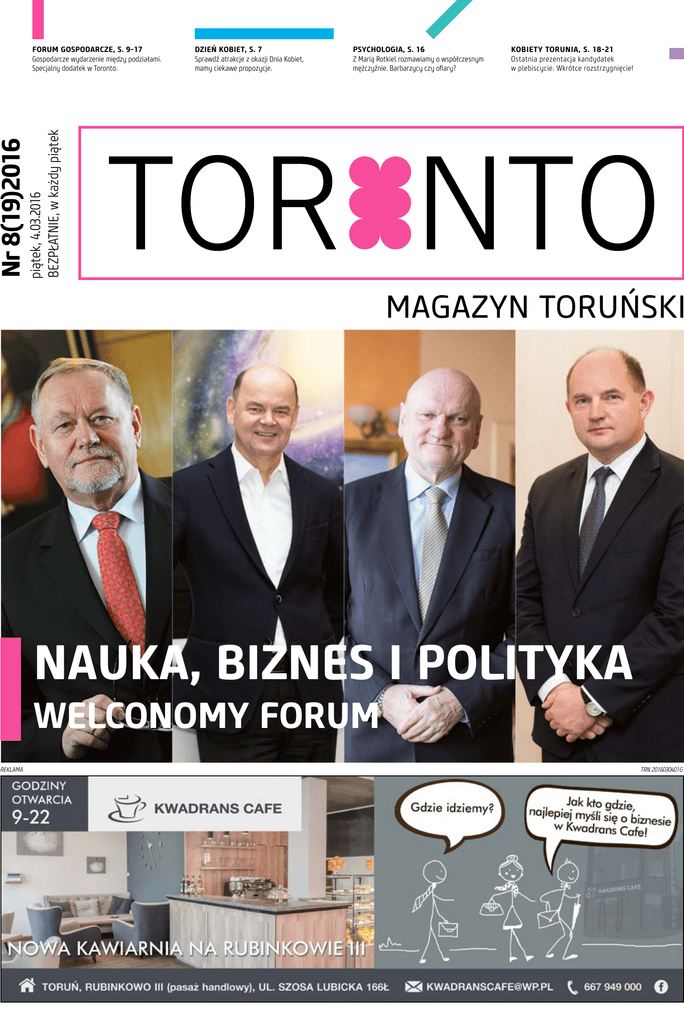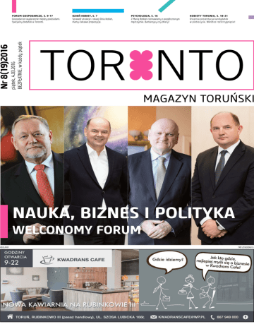 Dzień Kobiet, s. 7 Sprawdź atrakcje z okazji Dnia Kobiet, mamy ciekawe propozycje. Psychologia, s. 16 Z Marią Rotkiel rozmawiamy o współczesnym mężczyźnie. Barbarzycy czy ofiary? Kobiety Torunia, s. 18-21 Ostatnia prezentacja kandydatek w plebiscycie. Wkrótce rozstrzygnięcie! Nr 8(19)2016 piątek, 4.03.2016 BEZPŁATNIE, w każdy piątek Forum Gospodarcze, s. 9-17 Gospodarcze wydarzenie między podziałami. Specjalny dodatek w Toronto. Nauka, biznes i polityka Welconomy Forum REKLAMA TRN 2016030401G LUDZIE TORONTO TORONTO magazyn toruński www.toronto-magazyn.pl [email protected] Adres: ul. Grudziądzka 79/6 tel. 789 191 070 red.nacz. Żaneta Lipińska-Patalon wydanie bezpłatne wydawca: Interactive-Press Żaneta Lipińska-Patalon MARCIN TREICHEL Reklama: [email protected] Tel.789 223 013, Tel.789 216 119, Tel.789 223 339 Rysowaniem i projektowaniem graficznym zajmuje się od wielu lat. Doświadczenie zdobył, pracując dla dzienników regionalnych oraz współpracując z agencjami reklamowymi przy wielu różnorodnych projektach. Forum zgody i przyszłości Współpracy, dialogu, merytorycznej rozmowy. Tak, dokładanie tego nam potrzeba! Niestety kiedy patrzę, co dzieje się dziś w polityce, co gorsza, kiedy widzę, jak wpływa to na zwykłych ludzi… Jak emocje psują relacje, jak poglądy zatruwają zdroworozsądkowe myślenie – jestem przerażona. Forum Gospodarcze, które odbywa się już po raz XXIII, chyba jak nigdy staje się „Ida” i polski Chińczyk W Polsce film „Ida” obejrzało ok. 100 tysięcy widzów. Przy 4 milionach na „Listach do M.” szału to nie robi. Tyle że „Listy do M.” na Oscara nie powinny raczej liczyć, a „Ida” już go ma. Jest pierwszym polskim filmem pełnometrażowym, który zdobył Oscara, pokonując ponad 80 krajów świata. Tymczasem tydzień temu, publiczna Telewizja Polska pokazała i ocenzurowała „Idę”, opatrując film planszami własnej roboty. „Wyjaśniały” Opracowanie graficzne: Anna Paula Szmeichel mruff design Druk: Agora SA szym mieście po raz dziewiąty, co daje tylko świadectwo temu, że wielkie rozmowy zadomowiły się u nas na dobre. Nasze wielkie święto w poniedziałek 7 marca tradycyjnie otworzy prof. Jerzy Buzek, który poprowadzi dyskusję na temat innowacyjności w gospodarce. Jego panelistami będą : Piotr Całbecki, Marek Cywiński, Jarosław Dąbrowski, Adam Łącki, Andrzej Malinowski, Paweł Olechnowicz i Ryszard Petru. To zacne grono poprzez dyskusję wprowadzi wszystkich uczestników forum do trzydziestu sześciu tematów tegorocznej edycji. Tematów ważnych dla kierunku rozwoju naszego kraju, dla samorządów, przedsiębiorców i uczelni. Łącznie weźmie w nich udział 37 moderatorów i ponad 200 panelistów. Drugi dzień Welconomy Forum in Torun poświęcony będzie innowacyjności w nauce. Debatę poprowadzi prof. Andrzej Tretyn. Rektor naszego Uniwersytetu wraz z honorowym panelistą, premierem Jarosławem Gowinem wprowadzą uczestników w dyskusję na temat roli nauki w obliczu Agendy Unii Europejskiej 2013-2020, która właśnie w tym roku wchodzi w fazę realizacji finansowanej. Ale Welconomy Forum in Torun to nie wykłady, których się słucha. To wydarzenie jest kreowane tak, by pobudzało dyskusje i angażowało wszystkich uczestników. Chcemy, by głos zabrać mógł każdy, kto chce zmieniać nasz kraj i nasze życie. Chcemy tworzyć dobrą atmosferę otoczenia biznesu. Wierzymy, że tylko merytoryczna dyskusja pozwoli rozwiązywać problemy współczesnego świata. Stawiamy na otwartość i relacje międzyludzkie. W tym miejscu zapraszam wszystkich mieszkańców Torunia do udziału w XXIII Welconomy Forum in Torun, które w tym roku odbędzie się w hotelu Copernicus. Zapraszam do rejestracji elektronicznej na poszczególne panele i do zobaczenia na forum. A już dziś z wielką dumą zapraszam na następną edycję, która obędzie się w naszym mieście 13 i 14 marca 2017. runiu nie tylko w kontekście geotermalnych odwiertów czy smoga w Krakowie. Wiele autorytetów ze świata biznesu, nauki, polityki i administracji będzie debatować nad modelem naszej gospodarki. Kiedy przeglądałem tematykę i nazwiska prelegentów forum, serce rośnie. Wiele zagadnień idealnie wpisuje się w sytuację Torunia. Oto dyskusja ma dotyczyć możliwości gmin położonych przy autostradach, czy ma to przełożenie na gospodarkę i przedsiębiorczość tych gmin i miast, czy je należycie wykorzystują. Ciekawe jak ma się to, np. do zlikwidowanego węzła w Czerniewicach i 2 złotych za przejazd mostem? Goście pochylą się nad inwestycjami samorządów, może będą Jarosław Jarry Jaworski, specjalista public relations, Cieszę się, że w najbliższym ty- przekonywać do tworzenia freak godniu będzie słychać o To- miejsc pracy i inwestycji w ludzi, a nie tylko pomników, betonowych budowli i hal? Bardzo czekam na wnioski z debaty o relacjach pomiędzy administracją, a sektorem prywatnym. Te w Toruniu od lat raczej kuleją. Cieszę się, że weźmie w niej udział Przewodniczący Rady Miasta Torunia. Liczę, że z wrodzoną sobie dokładnością i kulturą osobistą, postara się owe nowości i dobre wzory wprowadzić w życie. Oby go tylko wysłuchano. Słowem: wygląda na to, że materiału na powielanie w Toruniu będzie aż nadto. Pytanie tylko, czy to wykorzystamy? Czy Forum zmieni naszą rzeczywistość, czy jego dorobek trafi jedynie na dno szuflad lokalnej władzy. buforem dla wszystkich napięć i niesnasek. Mam nadzieję, że ponad dwieście kilometrów od słynnej Wiejskiej, emocje faktycznie opadną, a uczestnicy w atmosferze partnerstwa będą rozmawiać o rzeczach ważnych dla naszego kraju, regionu i miasta. W Toruniu pojawi się bardzo mocna obsada ministrów, a z drugiej strony zasiądą przedstawiciele biznesu. Razem o strategicznych problemach będą rozmawiać właśniew Toruniu. A któż wie o nich najwięcej jak nie reprezentanci największym polskic