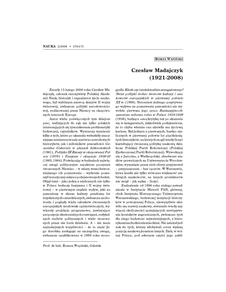 NAUKA 2/2008 • 170-171 ROMAN WAPIŃSKI Czesław Madajczyk (1921-2008) Zmarły 15 lutego 2008 roku Czesław Madajczyk, członek rzeczywisty Polskiej Akademii Nauk, historyk i organizator życia naukowego, był wybitnym znawcą dziejów II wojny światowej, zwłaszcza polityki narodowościowej, realizowanej przez Niemcy na okupowanych terenach Europy. Autor wielu poświęconych tym dziejom prac, trafiających do rąk nie tylko polskich interesujących się tym zakresem problematyki badawczej, czytelników. Wystarczy wymienić kilka z tych, które po ukazaniu wzbudziły znaczniejsze zainteresowanie zarówno zawodowych historyków, jak i miłośników przeszłości: Generalna Gubernia w planach hitlerowskich (1961), Polityka III Rzeszy w okupowanej Polsce (1970) i Faszyzm i okupacje 1938-45 (1983, 1984). Poświęcając w badaniach najwięcej uwagi politycznym aspektom poczynań ówczesnych Niemiec – w miarę wszechstronniejszego ich poznawania – wydatnie poszerzył tematyczny zakres podejmowanych badań. Objął nimi – jako jeden z nielicznych nie tylko w Polsce badaczy faszyzmu i II wojny światowej – w pierwszym rzędzie wpływ, jaki na przemiany w sferze kultury przełomu lat trzydziestych-czterdziestych, zwłaszcza zachowania i poglądy wielu członków ówczesnych europejskich środowisk opiniotwórczych, wywierały projekcje programowe, zawierające propozycje ekstremalnych rozwiązań, radykalnych ruchów politycznych i wiele stosowanych przez nie form działania. A – nie mam najmniejszych wątpliwości – że ta część Jego dorobku zasługuje na szczególną uwagę, zwłaszcza opublikowana w 1998 roku monoProf. dr hab. Roman Wapiński, Gdańsk grafia Klerk czy intelektualista zaangażowany? Świat polityki wobec twórców kultury i naukowców europejskich w pierwszej połowie XX w. (1998). Natomiast żadnego pozytywnego wpływu na poznawanie przeszłości nie wywołała pierwsza jego praca Burżuazyjno-obszarnicza reforma rolna w Polsce 1918-1939 (1956), budząca ostrą krytykę tuż po ukazaniu się w księgarniach, jakkolwiek podejrzewam, że to chyba właśnie ona ułatwiła mu życiową karierę. Był jednym z pierwszych, bardzo nielicznych w pierwszej połowie lat pięćdziesiątych historyków, na których mogli wtedy liczyć kształtujący ówczesną politykę naukową działacze Polskiej Partii Robotniczej (Polskiej Zjednoczonej Partii Robotniczej). Wywodzący się z Jarocina, z Wielkopolski, absolwent studiów prawniczych na Uniwersytecie Wrocławskim, wysunięte przez nich oferty przyjmował – przypuszczam – bez oporów. W Warszawie, która kusiła nie tylko wówczas większość ambitnych naukowców, na innych protektorów nie mógł – jak sądzę – liczyć. Znalezienie od 1956 roku stałego zatrudnienia w Instytucie Historii PAN, głównej, obok Instytutu Historycznego Uniwersytetu Warszawskiego, badawczej instytucji historyków w powojennej Polsce, niewątpliwie ułatwiło mu rozwój naukowy, stwarzało wtedy najwięcej okoliczności sprzyjających nawiązywaniu kontaktów zagranicznych, zwłaszcza tych dla niego badawczo najważniejszych, z historykami zachodnioniemieckimi. Nie należał jednak do tych, którzy zdobywali coraz wyższą pozycję naukową kosztem innych. Dziś, w wolnej Polsce, pod adresem części jego publi- Czesław Madajczyk (1921-2008) kacji, podobnie jak wielu innych historyków dziejów najnowszych, można wysunąć szereg zarzutów. W dobie prowadzonego głównie przez Instytut Pamięci Narodowej pod hasłami edukacji historycznej polowania na czarowni- 171 ce, przypominającego to z pierwszej połowy lat pięćdziesiątych, pamięć o jego dorobku ulega zatarciu. Żaden jednak szanujący się historyk II wojny, polski czy obcy, nie powinien na to pozwolić.