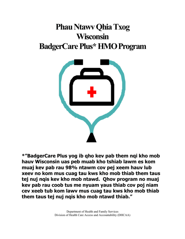 Phau Ntawv Qhia Txog Wisconsin BadgerCare Plus* HMO Program *”BadgerCare Plus yog ib qho kev pab them nqi kho mob hauv Wisconsin uas peb muab kho tshiab lawm es kom muaj kev pab rau 98% ntawm cov pej xeem hauv lub xeev no kom mus cuag tau kws kho mob thiab them taus tej nuj nqis kev kho mob ntawd. Qhov program no muaj kev pab rau coob tus me nyuam yaus thiab cov poj niam cev xeeb tub kom lawv mus cuag tau kws kho mob thiab them taus tej nuj nqis kho mob ntawd thiab.” Department of Health and Family Services Division of Health Care Access and Accountability (DHCAA) Yog koj muaj ib tug niam qhuav txiv qhuav sawv cev koj, thov pab muab cov ntawv no rau nws, log yog hu qhia rau nws tias cov ntaub ntawv tseem ceeb no tuaj txog lawm. [English] For help to translate or understand this document, please call 1-800-291-2002. [Español] Si necesita ayuda para traducir o entender este texto, por favor llame al teléfono 1-800-291-2002. [Russian] ǭșȓȐ ȊȈȔ ȕȍ ȊșȨ ȗȖȕȧȚȕȖ Ȋ ȥȚȖȔ ȌȖȒțȔȍȕȚȍ, ȗȖȏȊȖȕȐȚȍ ȗȖ ȚȍȓȍȜȖȕț 1-800-291-2002. [Hmong] Yog koj xav tau kev pab txhais los yog qhia kom koj to taub daim ntawv no, hu rau 1-800-291-2002. [Hearing Impaired] For help to understand this document, please call TDD/TTY 1-800-291-2002. Hauv qab no yog ob daig npav Wisconsin Forward Cards. Cov npav no yog ua rau cov neeg uas tau txais kev pab rau BadgerCare Plus. Daim npav Forward Health card xim dawb yog daim BadgerCare Plus ID card tshiab. Daim npav tshiab no yog ua rau cov neeg ua tau txais kev pab tshiab los yog cov uas nws ua nws daim npav dub poob lawm los yog ploj lawm es nws thov dua daim tshiab. Daim npav Forward card xim xiav tseem siv tau li qub thiab. Sau Npe Nkag Rau HMO Ib qho ntawm tej txiaj ntsim ntau yam ntawm BadgerCare Plus program yog qhov uas koj yuav muaj peev xwm sau npe nkag tau rau hauv ib lub koom haum kho mob Wisconsin BadgerCare Plus Health Maintenance Organization (HMO). Tej tsev neeg uas muaj tej me nyuam uas tau txais kev pab kho mob los ntawm Wisconsin BadgerCare Plus program ces yog cov uas muaj npe nyob rau hauv ib lub koom haum kho mob HMO. Feem coob ntawm tej tsev neeg ntawd yuav tsum tau sau npe nyob rau hauv ib lub koom haum kho mob HMO. Yog tias qhov chaws koj nyob muaj ob lub koom haum kho mob HMOs rov saud lawm, koj yuav xaiv tau tias koj yuav sau npe nyob rau lub twg. Daim ntawv nyob nrog cov ntawv no yuav qhia koj tias seb koj puas yuav tau xaiv ib lub HMO. Yog koj paub tsis meej tias ua koj puas yuav tau xaiv ib lub HMO no, koj hu rau tus Enrollment Specialist rau 1-800-291-2002. -1- Kev Pab Ntawm Lub HMO Ib tus kws kho mob los yog ib lub chaw ua hauj lwm kho mob yuav pab koj txog koj tej kev kho mob kho nkeeg. HMOs pab txog kev kho mob txhua lub sij hawm, 24 teev tauj ib hnub, 7 hnub tauj ib lub lim piam. Muaj qee lub HMOs tseem muaj kev kho mob txhua yam nyob rau tib qho chaw thiab. BadgerCare Plus Plans BadgerCare Plus muaj ob yam kev pab (plans), qhov Standard Plan thiab qhov Benchmark Plan. x Standard Plan – Pab rau cov me nyuam yaus, niam thiab txiv, cov txheeb ze uas lees tu tej me nyuam ntawd (caretaker relatives), cov hluas uas loj hlob los ntawm cov tsev tu me nyuam ntsuag (foster care), thiab cov poj niam cev xeeb tub uas khwv tau nyiaj tsawg tshaj los yog npaum li 200% qhov kev txom nyem uas tsoom fwv teev tseg (Federal Poverty Level (FPL)). Nyob rau qhov Standard Plan no, yus yuav tsum tau them me ntsis nyiaj lub sij hawm yus mus cuag kws kho mob (copayments) thiab. x Benchmark Plan – Pab rau cov me nyuam yaus thiab cov poj niam cev xeeb tub uas khwv tau nyiaj ntau tshaj 200% ntawm qhov kev txom nyem uas tsoom fwv teev tseg (above 200% of the FPL) thiab qee tus niam txiv uas nws ua hauj lwm rau nws tus kheej (self-employed), thiab lwm tus txheeb ze uas tu cov me nyuam yaus ntawd (pog yawg los yog niam tais yawm txiv, niam hlob txiv hlob/niam ntxawm txiv ntxawm los yog phauj thiab yawg laus, uas tu thiab saib xyuas cov me nyuam uas niam thiab txiv tsis nrog nyob). Nyob rau qhov Benchmark Plan no, yus yuav tsum tau them nyiaj raws hli (premium) thiab them me ntsis nyiaj lub sij hawm yus mus cuag kws kho mob (copayments) thiab. Cov Kev Pab Kho Mob Uas BadgerCare Plus Pab Them Standard Plan: Nyob rau hauv qhov Standard Plan mas yuav tsum yog muaj mob tiag raws li nram qab no mas HMOs thiaj li yuav pab them tej kev kho mob ntawd. Tej yam kev kho mob uas HMO pab them muaj raws li nram qab no: -2- x Kev mus cuag yus tus kws kho mob thiab mus pw kho mob tom tsev kho mob (Doctor visits and hospital care) x Kev kho qhov muag, nrog rau tsom qhov muag (Eye care, including glasses) x Kev mus cuag kws kho mob tom tsev kho mob loj thiab kev kho tej yam mob ceev heev uas tos tsis taus mam mus cuag yus tus kws kho mob (Outpatient and emergency care) x Kev mus kuaj thaum cev xeeb tub (Prenatal care) x Tej yam khoom siv kho mob (Medical equipment) x Kev kho txog kev xiam hlwb los yog kev nyuaj siab ntxov plawv (Mental health services) x Kev kho pob ntseg, nrog rau tej khoom pab kom hnov lus zoo (Hearing services, including hearing aids) x Kev pab kom txhob muaj me nyuam coob coob los yog thaum twg yus xav muaj me nyuam es maj cia muaj xwb (Family planning services) x Kev pab tu ib ce los yog tu vaj tus tsev lub caij yus ua tsis taus lawm (Personal care services) x Kev pab kom tes taw rov muaj zog (Physical and occupational therapy) x Kev pab kho hniav nyob rau qee lub county (Dental care in certain counties) x Kev txiav yeeb txiav tshuaj (dej caw thiab kev quav lwm yam tshuaj) (Substance abuse (alcohol and other drug abuse) services) x Tej tshuaj pab kom yus txiav tau luam yeeb uas yus cia li mus yuav yus xwb los tau (Over-the-counter tobacco cessation products) x Kev mus cuag kws pab kom txhob muaj teeb meem txog kev nyuaj siab ntxhov plawv los yog kev quav yeeb quav tshuaj rau cov poj niam cev xeeb tub uas tej zaum yuav muaj kev ntxhov siab ntau yam (Preventive mental health and substance abuse counseling for pregnant 