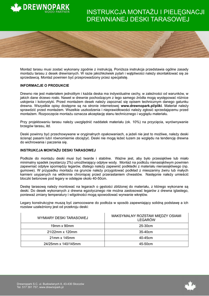 INSTRUKCJA MONTAŻU I PIELĘGNACJI DREWNIANEJ DESKI TARASOWEJ Montaż tarasu musi zostać wykonany zgodnie z instrukcją. Poniższa instrukcja przedstawia ogólne zasady montażu tarasu z desek drewnianych. W razie jakichkolwiek pytań i wątpliwości należy skontaktować się ze sprzedawcą. Montaż powinien być przeprowadzony przez specjalistę. INFORMACJE O PRODUKCIE Drewno nie jest materiałem jednolitym i każda deska ma indywidualne cechy, w zależności od warunków, w jakich dane drzewo rosło. Nawet w drewnie pochodzącym z tego samego źródła mogą występować różnice usłojenia i kolorystyki. Przed montażem desek należy zapoznać się opisem technicznym danego gatunku drewna. Wszystkie opisy dostępne są na stronie internetowej www.drewnopark.pl/pliki. Materiał należy sprawdzić przed montażem. Wszelkie uszkodzenia i nieprawidłowości należy zgłosić sprzedającemu przed montażem. Rozpoczęcie montażu oznacza akceptację stanu technicznego i wyglądu materiału. Przy projektowaniu tarasu należy uwzględnić naddatek materiału (ok. 10%) na przycięcia, wyrównywanie brzegów tarasu, itd. Deski powinny być przechowywane w oryginalnych opakowaniach, a jeżeli nie jest to możliwe, należy deski ścisnąć pasami lub/i równomiernie obciążyć. Deski nie mogą leżeć luzem ze względu na tendencję drewna do wichrowania i paczenia się. INSTRUKCJA MONTAŻU DESKI TARASOWEJ Podłoże do montażu deski musi być twarde i stabilne. Ważne jest, aby było przesiąkliwe lub miało minimalny spadek (wystarczy 2%) umożliwiający odpływ wody. Montaż na podłożu nienasiąkliwym powinien zapewniać odpływ spomiędzy legarów, dlatego należy zapewnić podkładki z materiału nienasiąkliwego (np. gumowe). W przypadku montażu na gruncie należy przygotować podkład z mieszaniny żwiru lub małych kamieni usypanych na włókninie chroniącej przed przerastaniem chwastów. Następnie należy umieścić bloczki betonowe pod legary w odstępie około 40-50cm. Deskę tarasową należy montować na legarach o gęstości zbliżonej do materiału, z którego wykonane są deski. Do desek wykonanych z drewna egzotycznego nie można zastosować legarów z drewna iglastego, ponieważ zmiany temperatury i wilgotności mogą spowodować wyrwanie wkrętów. Legary konstrukcyjne muszą być zamocowane do podłoża w sposób zapewniający solidną podstawę a ich rozstaw uzależniony jest od przekroju deski: WYMIARY DESKI TARASOWEJ MAKSYMALNY ROZSTAW MIĘDZY OSIAMI LEGARÓW 19mm x 90mm 25-30cm 21/22mm x 120mm 35-40cm 21mm x 145mm 40-45cm 24/25mm x 140/145mm 45-50cm Drewnopark S.C. ul. Budowlanych 8, 43-430 Skoczów Tel. 517 391 757, www.drewnopark.pl Przy montażu należy uwzględnić naturalny proces wysychania drewna w czasie gorących letnich dni i pęcznienia podczas deszczowej pogody – dlatego odstęp między deskami powinien wynosić 5-10mm. Jeśli taras przylega do ściany lub innego stałego elementu, należy zapewnić szczelinę dylatacyjną wynoszącą co najmniej 10mm. Deski należy przykręcić do każdego legara 2 wkrętami o długości co najmniej dwukrotnie większej niż grubość deski. Zaleca się stosowanie wkrętów ze stali nierdzewnej. Przed wkręcaniem należy wykonać wstępne nawiercenie (wiertło 4mm przy wkręcie o średnicy 5mm). Wkręty powinny być mocowane w odległości 30-60mm od czoła deski, aby unikać wyginania się końców. Główka wkrętu powinna być na poziomie powierzchni deski i nie wystawać ponad nią. PIELĘGNACJA I OCHRONA Stała pielęgnacja polega na usuwaniu zanieczyszczeń (piasku, liści, błota) przy użyciu szczotki. Należy pamiętać o zapewnieniu odpowiedniej wentylacji wokół tarasu. Nie wolno dopuścić do zbierania się zanieczyszczeń dookoła tarasu oraz w szczelinach między deskami. W sezonie zimowym należy usuwać na bieżąco śnieg przy użyciu szczotek nie dopuszczając do powstania oblodzonej warstwy. Pod wpływem czynników atmosferycznych drewniane deski tarasowe podlegają naturalnemu procesowi patynowania wierzchniej warstwy. Powstaje wówczas srebrzysta powłoka nie mająca wpływu na obniżenie parametrów technicznych drewna i proces starzenia biologicznego. W celu zachowania naturalnego koloru drewna oraz zapewnienia dodatkowej ochrony należy stosować olej impregnujący przeznaczony na zewnętrzne konstrukcje drewniane. Olejowanie najlepiej powtarzać dwa razy w roku: na wiosnę przed rozpoczęciem sezonu oraz jesienią, aby odpowiednio zabezpieczyć drewno przed zimą. Przy olejowaniu zaleca się korzystanie z wyrobów renomowanych producentów chemii rekomendowanych przez DREWNOPARK oraz ścisłe stosowanie się do instrukcji producenta chemii. Przed nakładaniem oleju należy usunąć resztki poprzedniej powłoki oraz brudu. Zaleca się użycie specjalnych środków do czyszczenia zniszczonego pod wpływem czynników atmosferycznych drewna. Przed nałożeniem oleju powierzchnia drewna powinna być całkowicie sucha. Nie należy olejować tarasów w temperaturach poniżej +15OC oraz przy wysokiej wilgotności powietrza. Drewnopark S.C. ul. Budowlanych 8, 43-430 Skoczów Tel. 517 391 757, www.drewnopark.pl