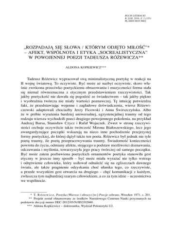 RUCH LITERACKI R. LVII, 2016, Z. 2 (335) PL ISSN 0035-9602 „ROZPADAJĄ SIĘ SŁOWA / KTÓRYM ODJĘTO MIŁOŚĆ”* – AFEKT, WSPÓLNOTA I ETYKA „SOCREALISTYCZNA” W POWOJENNEJ POEZJI TADEUSZA RÓŻEWICZA** ALDONA KOPKIEWICZ*** Tadeusz Różewicz wypracował swą minimalistyczną poetykę w reakcji na II wojnę światową. To oczywiste. Być może aż nazbyt oczywiste, skoro właśnie zwrócona przeciwko poetyckiemu obrazowaniu i muzyczności forma stała się niemal równoznaczna z etycznym przedstawieniem rzeczywistości. Tak jakby poetyckość nie dawała się pogodzić ze świadectwem – tak jakby piękno i wyobraźnia twórcza nie miały wartości poznawczej. Tę intuicję potwierdza fakt, że przedstawiając wojenne i zagładowe doświadczenia, wiersz Różewiczowski adaptowali chociażby Jerzy Ficowski i Anna Świrszczyńska. Albo że w próbie wyrażenia bardziej uniwersalnej, egzystencjalnej traumy od tego rodzaju wiersza wychodzili poeci drugiego powojennego pokolenia, na przykład Andrzej Bursa, Stanisław Czycz i Rafał Wojaczek. Zwrot w stronę rzeczywistości cechuje oczywiście także twórczość Mirona Białoszewskiego, lecz jego awangardyzujące początki wskazują na nieco inne pochodzenie przejrzystej formy poetyckiej, do której dążył także ten poeta. Różewicz był jednak nie tyle poetą traumy, ile poetą przepracowywania traumy. Świadomość konieczności powrotu do życia, odmiany afektu, stojącego u podstaw możliwości doznawania, odczuwania i myślenia, towarzyszyła jego pracy twórczej od samego początku. Być może zatem pozbawiona poetyckich ornamentów poetyka stanowiła gest etyczny w jeszcze inny sposób – być może miała wyrażać nie tylko wstrząs i odrętwienie człowieka, który usiłował odnaleźć się na zgliszczach dawnego świata, ale także pragnienie odzyskania choć ułamka tego, co rzeczywiste, a przede wszystkim gest otwarcia na drugiego – chęć komunikacji z każdym, zwłaszcza tym najbardziej szarym człowiekiem, a co za tym idzie – uczestnictwa we wspólnocie. * T. R ó ż e w i c z, Poetyka (Wiersze i obrazy) [w:] Poezje zebrane, Wrocław 1971, s. 201. ** Projekt został sfinansowany ze środków Narodowego Centrum Nauki przyznanych na podstawie decyzji numer DEC-2012/05/N/HS2/02660. *** Aldona Kopkiewicz – doktorantka, Wydział Polonistyki UJ. 218 Aldona Kopkiewicz Ówczesne postawy światopoglądowe Kazimierza Wyki czy Czesława Miłosza – uparte trwanie przy ciągłości kultury, dzięki której człowiek ma możliwość przekraczania nawet najgłębszych kryzysów cywilizacji – wydają się zatem nie tyle przeciwstawne intencjom Różewicza, ile od nich odmienne: inaczej zarysowują się wizje tego, jak przekroczyć doświadczenie traumatyczne. Jerzy Jarzębski uważa, że owa odmienność wynika z różnicy pokoleniowej dzielącej tych pisarzy. W szkicu przedstawiającym źródła bliskości światopoglądowej Miłosza i Gombrowicza zauważa1: Istotne wydaje się to, że – z jednej strony – zdążyli jeszcze na początku lat 30. wejść w życie literackie i intelektualne, zyskać dojrzałość jeszcze przed wybuchem wojny, a z drugiej strony – w czasy wojenne wejść wystarczająco wcześnie, by odebrać jej doświadczenie z całą bezpośredniością młodości. […] Pisarze pokolenia skamandryckiego nie umieli już wyskoczyć ze skamieliny świata, w którym wzrastali, pisarze pokolenia wojennego nie zdążyli wejść w zażyłość z rzeczywistością przedwojenną – ledwie jej liznęli, zanim wszystko bezpowrotnie się rozsypało, pozostawiając po sobie przejmujące wrażenie pustki, tak dobrze oddane w wierszach młodego Borowskiego czy Różewicza. Gombrowicz i Miłosz należeli do generacji, która miała lepszą od innych szansę na dokonanie rozliczenia z epoką mijającą, jak i krytycznego spojrzenia na nową cywilizację instalującą się w gruzach.2 Różnica ta wybrzmiewa w pełni, jeśli przyjrzymy się powojennym wyborom światopoglądowym i estetycznym Borowskiego i Różewicza3. Dlaczego jednak chciałabym zobaczyć ten spór – dobrze przecież przez literaturoznawców rozpoznany i opisany – przez pryzmat afektu? Powojenna debata wokół etyki i estetyki poezji (i innych sztuk z pewnością także) wydaje się sporem o humanistyczne lub chrześcijańskie wartości. Wartości te pozostają jednak nieodłączne od podstawowych afektów, te zaś prowadzą nas do relacji między poetą i wspólnotą. Należało bowiem odpowiedzieć na pytanie, kim jest i jak na wspólnotę winien oddziaływać poeta po ostatecznej katastrofie. Jak modulować podstawowy afekt, który poezja ma pobudzać? Jaki afekt powinien pobudzać znów poetę, i do jakiej 1 Poglądy Gombrowicza wybrzmiewają w kontekście mojej pracy szczególnie interesująco ze względu na głośny szkic „Przeciw poetom”, w którym pisarz ośmiesza czczość i nudę czystej poezji. Tekst wraz z odpowiedziami Miłosza: W. G o m b r o w i c z, Przeciw poetom. Dialog o poezji z Czesławem Miłoszem, Kraków 1995. 2 J. J a r z ę b s k i, Pisarze pokolenia 1910 jako krytycy: Gombrowicz i Miłosz [w:] Formacja 1910. Świadkowie nowoczesności, dz. cyt., s. 177. 3 O socrealizmie Różewicza bez cudzysłowu, z historycznoliterackiej perspektywy por. T. K ł a k, Sceny z życia poety. Przygody Tadeusza Różewicza z krytyką socrealistyczną [w:] t e g o ż, O Tadeuszu Różewiczu. Studia i szkice, Kielce 2012; R. C i e ś l a k, Różewicz i socrealizm [w:] Presja i ekspresja. Zjazd szczeciński i socrealizm, red. D. Dąbrowska, P. Michałowski, Szczecin 2002. Por. także o podobnej sytuacji światopoglądowej i ideowych wyborach Borowskiego i Różewicza: T. D r e w n o w s k i, Stworzyć poezję po Oświęcimiu [w:] t e g o ż, Walka o oddech: bio-poetyka. O pisarstwie Tadeusza Różewicza, Kraków 2002. „Rozpadają się słowa / którym odjęto miłość” – afekt, wspólnota i etyka… 219 poezji? Te właśnie