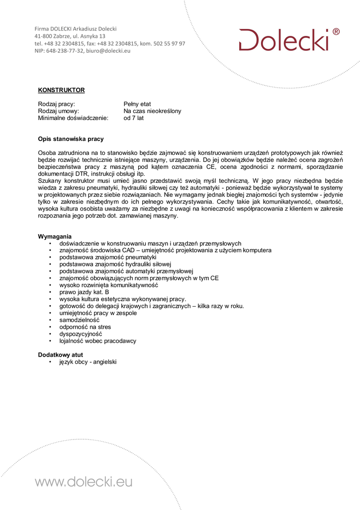 KONSTRUKTOR Rodzaj pracy: Rodzaj umowy: Minimalne doświadczenie: Pełny etat Na czas nieokreślony od 7 lat Opis stanowiska pracy Osoba zatrudniona na to stanowisko będzie zajmować się konstruowaniem urządzeń prototypowych jak również będzie rozwijać technicznie istniejące maszyny, urządzenia. Do jej obowiązków będzie należeć ocena zagrożeń bezpieczeństwa pracy z maszyną pod kątem oznaczenia CE, ocena zgodności z normami, sporządzanie dokumentacji DTR, instrukcji obsługi itp. Szukany konstruktor musi umieć jasno przedstawić swoją myśl techniczną. W jego pracy niezbędna będzie wiedza z zakresu pneumatyki, hydrauliki siłowej czy też automatyki - ponieważ będzie wykorzystywał te systemy w projektowanych przez siebie rozwiązaniach. Nie wymagamy jednak biegłej znajomości tych systemów - jedynie tylko w zakresie niezbędnym do ich pełnego wykorzystywania. Cechy takie jak komunikatywność, otwartość, wysoka kultura osobista uważamy za niezbędne z uwagi na konieczność współpracowania z klientem w zakresie rozpoznania jego potrzeb dot. zamawianej maszyny. Wymagania • doświadczenie w konstruowaniu maszyn i urządzeń przemysłowych • znajomość środowiska CAD – umiejętność projektowania z użyciem komputera • podstawowa znajomość pneumatyki • podstawowa znajomość hydrauliki siłowej • podstawowa znajomość automatyki przemysłowej • znajomość obowiązujących norm przemysłowych w tym CE • wysoko rozwinięta komunikatywność • prawo jazdy kat. B • wysoka kultura estetyczna wykonywanej pracy. • gotowość do delegacji krajowych i zagranicznych – kilka razy w roku. • umiejętność pracy w zespole • samodzielność • odporność na stres • dyspozycyjność • lojalność wobec pracodawcy Dodatkowy atut • język obcy - angielski