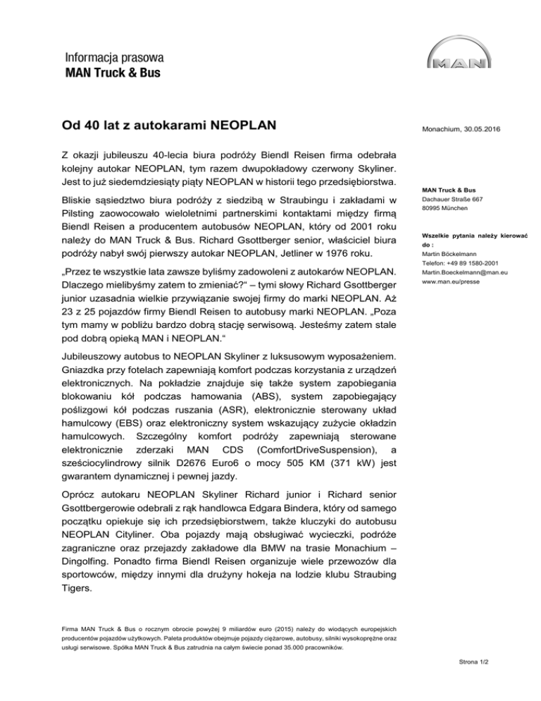 Od 40 lat z autokarami NEOPLAN Monachium, 30.05.2016 Z okazji jubileuszu 40-lecia biura podróży Biendl Reisen firma odebrała kolejny autokar NEOPLAN, tym razem dwupokładowy czerwony Skyliner. Jest to już siedemdziesiąty piąty NEOPLAN w historii tego przedsiębiorstwa. MAN Truck & Bus Bliskie sąsiedztwo biura podróży z siedzibą w Straubingu i zakładami w Pilsting zaowocowało wieloletnimi partnerskimi kontaktami między firmą Biendl Reisen a producentem autobusów NEOPLAN, który od 2001 roku należy do MAN Truck & Bus. Richard Gsottberger senior, właściciel biura podróży nabył swój pierwszy autokar NEOPLAN, Jetliner w 1976 roku. „Przez te wszystkie lata zawsze byliśmy zadowoleni z autokarów NEOPLAN. Dlaczego mielibyśmy zatem to zmieniać?“ – tymi słowy Richard Gsottberger junior uzasadnia wielkie przywiązanie swojej firmy do marki NEOPLAN. Aż 23 z 25 pojazdów firmy Biendl Reisen to autobusy marki NEOPLAN. „Poza tym mamy w pobliżu bardzo dobrą stację serwisową. Jesteśmy zatem stale pod dobrą opieką MAN i NEOPLAN.“ Dachauer Straße 667 80995 München Wszelkie pytania należy kierować do : Martin Böckelmann Telefon: +49 89 1580-2001 [email protected] www.man.eu/presse Jubileuszowy autobus to NEOPLAN Skyliner z luksusowym wyposażeniem. Gniazdka przy fotelach zapewniają komfort podczas korzystania z urządzeń elektronicznych. Na pokładzie znajduje się także system zapobiegania blokowaniu kół podczas hamowania (ABS), system zapobiegający poślizgowi kół podczas ruszania (ASR), elektronicznie sterowany układ hamulcowy (EBS) oraz elektroniczny system wskazujący zużycie okładzin hamulcowych. Szczególny komfort podróży zapewniają sterowane elektronicznie zderzaki MAN CDS (ComfortDriveSuspension), a sześciocylindrowy silnik D2676 Euro6 o mocy 505 KM (371 kW) jest gwarantem dynamicznej i pewnej jazdy. Oprócz autokaru NEOPLAN Skyliner Richard junior i Richard senior Gsottbergerowie odebrali z rąk handlowca Edgara Bindera, który od samego początku opiekuje się ich przedsiębiorstwem, także kluczyki do autobusu NEOPLAN Cityliner. Oba pojazdy mają obsługiwać wycieczki, podróże zagraniczne oraz przejazdy zakładowe dla BMW na trasie Monachium – Dingolfing. Ponadto firma Biendl Reisen organizuje wiele przewozów dla sportowców, między innymi dla drużyny hokeja na lodzie klubu Straubing Tigers. Firma MAN Truck & Bus o rocznym obrocie powyżej 9 miliardów euro (2015) należy do wiodących europejskich producentów pojazdów użytkowych. Paleta produktów obejmuje pojazdy ciężarowe, autobusy, silniki wysokoprężne oraz usługi serwisowe. Spółka MAN Truck & Bus zatrudnia na całym świecie ponad 35.000 pracowników. Strona 1/2 P_Coach_EOT_Biendl.jpg Podpis pod zdjęciem: Biuro podróży Biendl Reisen odebrało nowego Skylinera. Jest to 75. autokar marki NEOPLAN w historii tej firmy. Równocześnie zakupiło ono także autobus NEOPLAN Cityliner. H_Coach_Biendl.jpg Podpis pod zjęciem: Od 40 lat w biznesie: handlowiec Edgar Binder przekazał jubileuszowy pojazd Richardowi juniorowi i Richardowi seniorowi Gsottbergerom z firmy Biendl Reisen (od lewej) Strona 2/2