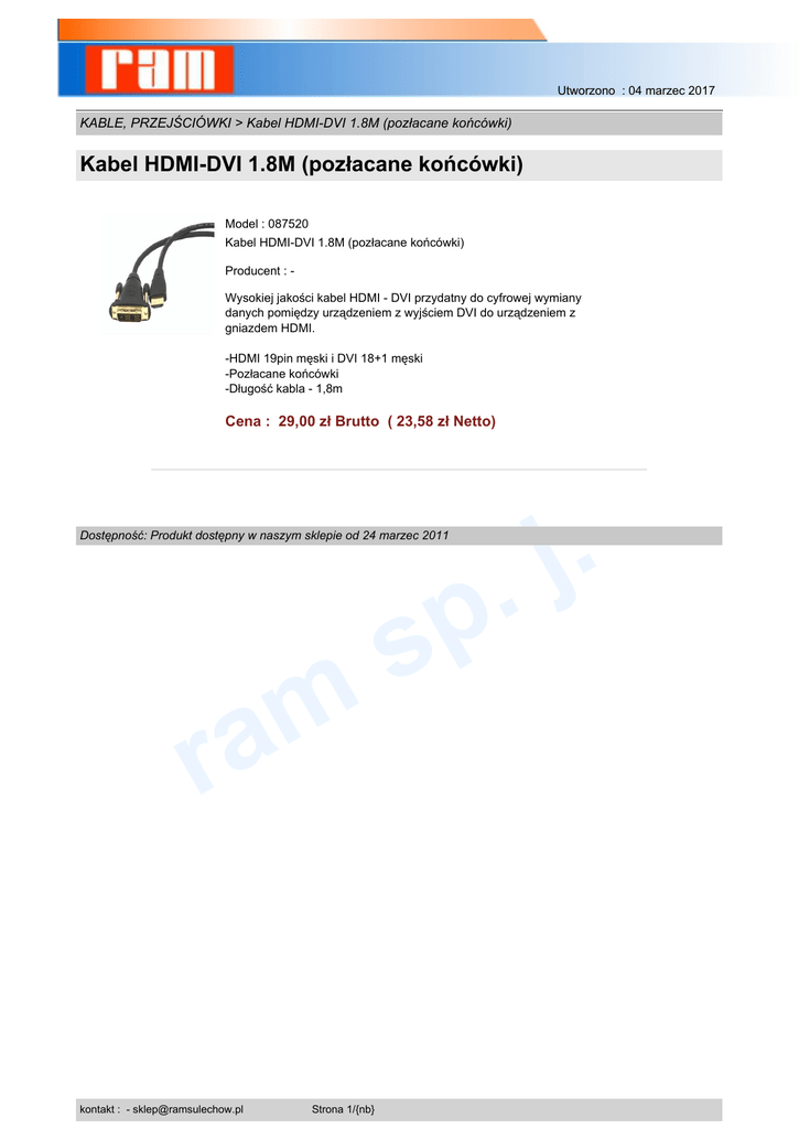 Utworzono : 04 marzec 2017 KABLE, PRZEJŚCIÓWKI > Kabel HDMI-DVI 1.8M (pozłacane końcówki) Kabel HDMI-DVI 1.8M (pozłacane końcówki) Model : 087520 Kabel HDMI-DVI 1.8M (pozłacane końcówki) Producent : Wysokiej jakości kabel HDMI - DVI przydatny do cyfrowej wymiany danych pomiędzy urządzeniem z wyjściem DVI do urządzeniem z gniazdem HDMI. -HDMI 19pin męski i DVI 18+1 męski -Pozłacane końcówki -Długość kabla - 1,8m Cena : 29,00 zł Brutto ( 23,58 zł Netto) . j . Dostępność: Produkt dostępny w naszym sklepie od 24 marzec 2011 m a r kontakt : - [email protected] Strona 1/{nb} p s