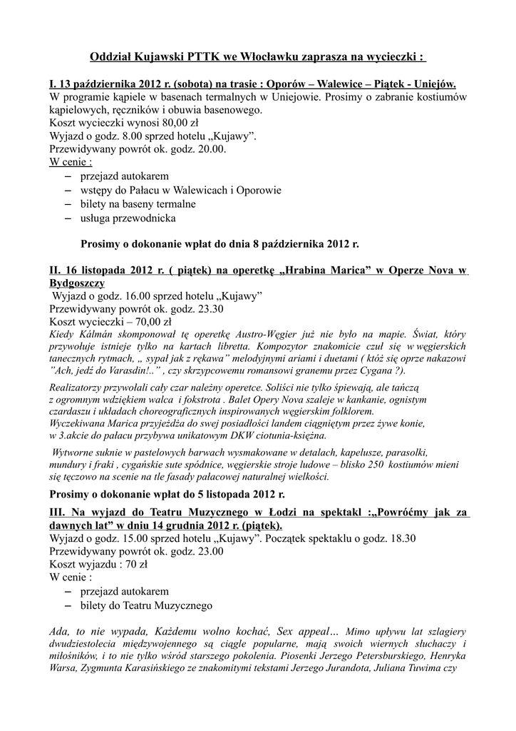 Oddział Kujawski PTTK we Włocławku zaprasza na wycieczki : I. 13 października 2012 r. (sobota) na trasie : Oporów – Walewice – Piątek - Uniejów. W programie kąpiele w basenach termalnych w Uniejowie. Prosimy o zabranie kostiumów kąpielowych, ręczników i obuwia basenowego. Koszt wycieczki wynosi 80,00 zł Wyjazd o godz. 8.00 sprzed hotelu „Kujawy”. Przewidywany powrót ok. godz. 20.00. W cenie : – przejazd autokarem – wstępy do Pałacu w Walewicach i Oporowie – bilety na baseny termalne – usługa przewodnicka Prosimy o dokonanie wpłat do dnia 8 października 2012 r. II. 16 listopada 2012 r. ( piątek) na operetkę „Hrabina Marica” w Operze Nova w Bydgoszczy Wyjazd o godz. 16.00 sprzed hotelu „Kujawy” Przewidywany powrót ok. godz. 23.30 Koszt wycieczki – 70,00 zł Kiedy Kálmán skomponował tę operetkę Austro-Węgier już nie było na mapie. Świat, który przywołuje istnieje tylko na kartach libretta. Kompozytor znakomicie czuł się w węgierskich tanecznych rytmach, „ sypał jak z rękawa” melodyjnymi ariami i duetami ( któż się oprze nakazowi ”Ach, jedź do Varasdin!..” , czy skrzypcowemu romansowi granemu przez Cygana ?). Realizatorzy przywołali cały czar należny operetce. Soliści nie tylko śpiewają, ale tańczą z ogromnym wdziękiem walca i fokstrota . Balet Opery Nova szaleje w kankanie, ognistym czardaszu i układach choreograficznych inspirowanych węgierskim folklorem. Wyczekiwana Marica przyjeżdża do swej posiadłości landem ciągniętym przez żywe konie, w 3.akcie do pałacu przybywa unikatowym DKW ciotunia-księżna. Wytworne suknie w pastelowych barwach wysmakowane w detalach, kapelusze, parasolki, mundury i fraki , cygańskie sute spódnice, węgierskie stroje ludowe – blisko 250 kostiumów mieni się tęczowo na scenie na tle fasady pałacowej naturalnej wielkości. Prosimy o dokonanie wpłat do 5 listopada 2012 r. III. Na wyjazd do Teatru Muzycznego w Łodzi na spektakl :„Powróćmy jak za dawnych lat” w dniu 14 grudnia 2012 r. (piątek). Wyjazd o godz. 15.00 sprzed hotelu „Kujawy”. Początek spektaklu o godz. 18.30 Przewidywany powrót ok. godz. 23.00 Koszt wyjazdu : 70 zł W cenie : – przejazd autokarem – bilety do Teatru Muzycznego Ada, to nie wypada, Każdemu wolno kochać, Sex appeal… Mimo upływu lat szlagiery dwudziestolecia międzywojennego są ciągle popularne, mają swoich wiernych słuchaczy i miłośników, i to nie tylko wśród starszego pokolenia. Piosenki Jerzego Petersburskiego, Henryka Warsa, Zygmunta Karasińskiego ze znakomitymi tekstami Jerzego Jurandota, Juliana Tuwima czy Andrzeja Własta wykonywali cieszący się wielką popularnością artyści kabaretowi oraz aktorzy grający w komediach i melodramatach: Eugeniusz Bodo, Tola Mankiewiczówna, Zula Pogorzelska, Hanka Ordonówna i Adolf Dymsza. W widowisku muzycznym, którym zespół Teatru Muzycznego zainaugurował sezon artystyczny 2010/2011 i który wznawia w sezonie 2012/2013, artyści przypominają te znakomite piosenki w nowych aranżacjach. Prosimy o dokonanie wpłat do dnia 3 grudnia 2012 r. Uwaga : Wycieczki dla członków PTTK z opłaconą składką członkowską za 2012 r.
