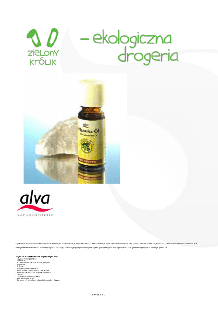 Czysty 100% olejek z drzewa Manuka z Nowej Zelandii jest wyjątkowo silnym antyseptykiem jego działanie szacuje się na pięciokrotnie silniejsze niż penicylina, ma właściwości antybakteryjne, przeciwgrzybiczne i przeciwzapalne. Jest idealnym zabezpieczeniem dla osób cierpiących na cukrzycę u których występuje problem gojenia się ran, gdyż nawet jedna aplikacja olejku na ranę gwałtownie przyspiesza proces jej gojenia się. Olejek ten ma zastosowanie między innymi przy: - grzybicy skóry i paznokci, - odleżynach, - chorobach skóry, stanach zapalnych skóry, - opryszczce, - wrzodach, - trudno gojących się ranach, - skaleczeniach, poparzeniach, oparzeniach, - zapaleniu zewnętrznych organów płciowych, - łojotoku, - infekcjach dróg oddechowych, - bólach reumatycznych, - sforsowanych mięśniach, bólach kości, mięśni i stawów, Strona 1 z 2 - napięciach nerwowych, zaburzeniach funkcji systemu nerwowego, - zapobieganiu infekcjom i ukąszeniom owadów. - zapaleniu zewnętrznych organów płciowych Przedstawione działanie posiada wyłącznie 100% czysty olejek Manuka produkowany w Nowej Zelandii. Wszelkiego rodzaju olejki które zawierają dodatkowe substancje nie posiadają tak bogatych właściwości. Olejek Manuka stosowany jest często jako główny składnik produktów do pielęgnacji skóry problematycznej. Jest także głównym składnikiem szamponów przeciw łupieżowych gdyż znakomicie usuwa ze skóry głowy bakterie i grzyby odpowiedzialne za powstawanie łupieżu i innych chorób skóry. Z powodzeniem stosowany jest także w mydłach antybakteryjnych, które nie zmieniają pH skóry i są polecane jako alternatywa dla płynów do higieny intymnej. Produkt posiada certyfikat Ecocert. - w 100% naturalny zapach bez parabenów, bez glikolu, bez sztucznych barwników bez silikonu bez Phenoxyethanolu bez PEG i SLS bez składników GMO fizjologiczne pH - hypoalergiczny Stosowanie : - Rany i zranienia: W celu dezynfekcji polać bezpośrednio na ranę. Jako zastępstwo zasypki antybakteryjnej 100% olejek Manuka Oil ma 5-krotnie silniejsze działanie niż penicylina. Olejek, który można stosować na otwarta ranę, bardzo głęboko ją penetruje zostawiając czystą tkankę. - Grzybica paznokci: Zamoczyć paznokcie w 100% olejku Manuka Oil a następnie wcierać przez ok 20 sekund rano i wieczorem. - Kruche paznokcie : Do 100 ml oliwki z oliwek lub dla dzieci dodać 40 kropli 100% olejku Manuka Oil. Następnie przelać do ciemnej buteleczki i dobrze potrząsnąć, aby się wszystko wymieszało. Odmierzyć łyżeczkę przygotowanego preparatu i wlać do miseczki. Moczyć w niej paznokcie przez chwilę a następnie wetrzeć preparat w palce. - Grzybica stóp: 2-3 razy dziennie wcierać 100% olejek Manuka Oil bezpośrednio na skórę objętą zmianami. - Zmęczone stopy: Oprócz działania odprężającego moczenie stóp jest pomocne w początkach przeziębienia. Do małej miski należy wlać ciepłą wodę i dodać 5 kropli 100% olejku Manuka Oil, a następnie zanurzyć stopy. Samym olejkiem można wysmarować zmęczone podeszwy stóp i poczuć natychmiastową ulgę. - Odciski: Zaleca się posmarowanie kilkoma kroplami 100% olejku Manuka Oil odciski twarde kilka razy dziennie aż do ich wyeliminowania. W przypadku odcisków świeżo nabytych wystarczy kilkukrotne posmarowanie otwartego miejsca. - Poparzenia (również od słońca): Po schłodzeniu poparzonego miejsca wodą natrzeć lub polać 100% olejkiem Manuka Oil poparzone miejsce lub zastosować chłodną rumiankową kąpiel z dodatkiem 10 kropli olejku. - Układ oddechowy: Bakteriobójczy i przeciw wirusowy, pomaga zwalczać przeziębienie i grypę, łagodzi chorobygardła, zapalenie migdałów, choroby dziąseł, łagodzi także objawy zapalenia oskrzeli. Stosuje się go w płukankach do gardła i jamy ustnej, kompresach, inhalacjach lub przez nacieranie. W celu zmniejszenia dolegliwości w nieżycie gardła, zapaleniu zatok przynosowych, przeziębieniu, przy męczącym kaszlu, wydzielinie zalegającej oskrzela należy odmierzyć kilka kropel olejku na chusteczkę i wdychać głęboko. - Opryszczka: Posmarować 100% olejkiem Manuka Oil gdy tylko pojawią się niepokojące objawy. Następnie smarować 3 razy dziennie. - Bóle gardła: Płukać roztworem z 5-10 kropli 100% olejku Manuka Oil na szklankę wody. - Grypa: Kilkoma kroplami 100% olejku Manuka Oil zwilżyć piżamę i poduszkę chorego. Można rozpuścić 5-6 kropli w gorącej wodzie i zrobić inhalację, które uwalniają drogi oddechowe i dają efekt łagodzący. - Ukąszenia owadów: Miejsca ukąszenia smarować aż do ustąpienia obrzęku lub świądu. - Ból zęba: Kropla 100% olejku Manuka Oil ukoi cierpienie. Obolałe dziąsła, nieprzyjemny zapach z ust, osad na zębach (3-5 kropli zmieszać z wodą płukać 2 razy dziennie, można również stosować kroplę bezpośrednio na szczoteczkę). Zapobiega powstawaniu kamienia nazębnego, paradontozie. Stany zapalne dziąseł: chore miejsca posmarować czystym olejkiem. - Zapalenie ucha środkowego: 2 krople 100% olejku Manuka Oil na waciku wprowadzić do ucha, powtarzać 3 razy dziennie przez 2-3 dni. - Wysypki, owrzodzenia, otarcia, swędzenia przy półpaścu i opryszczce: 100% olejek Manuka Oil aplikujemy bezpośrednio na chore miejsce. 100% olejku Manuka Oil nie można stosować na wysypkę dziecięcą. Przy wysypce dziecięcej olejek rozprowadzamy w odpowiednich proporcjach z oliwka dla dzieci w proporcji 1:10. - Oczy: 100% olejku Manuka Oil nie można stosować bezpośrednio do oczu. Na okłady oczu 1 kroplę olejku rozcieńczyć w szklance wody. - Alergie skórne: 10 kropli dodać do kąpieli lub pocierać zaatakowane miejsca olejkiem. - Kąpiel odprężająca: 10 kropli 100% olejku Manuka Oil wlać do wanny, dodać litr mleka lub kubeczek śmietany. Składniki 100% czysty olej Manuka Strona 2 z 2