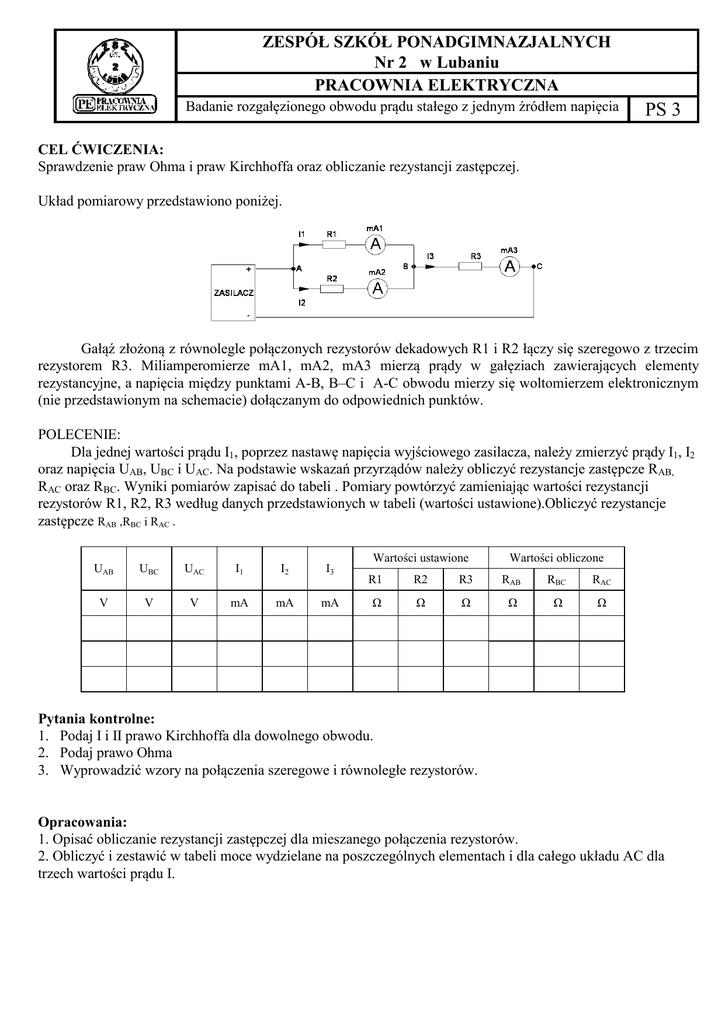 ZESPÓŁ SZKÓŁ PONADGIMNAZJALNYCH Nr 2 w Lubaniu PRACOWNIA ELEKTRYCZNA Badanie rozgałęzionego obwodu prądu stałego z jednym źródłem napięcia PS 3 CEL ĆWICZENIA: Sprawdzenie praw Ohma i praw Kirchhoffa oraz obliczanie rezystancji zastępczej. Układ pomiarowy przedstawiono poniżej. Gałąź złożoną z równolegle połączonych rezystorów dekadowych R1 i R2 łączy się szeregowo z trzecim rezystorem R3. Miliamperomierze mA1, mA2, mA3 mierzą prądy w gałęziach zawierających elementy rezystancyjne, a napięcia między punktami A-B, B–C i A-C obwodu mierzy się woltomierzem elektronicznym (nie przedstawionym na schemacie) dołączanym do odpowiednich punktów. POLECENIE: Dla jednej wartości prądu I1, poprzez nastawę napięcia wyjściowego zasilacza, należy zmierzyć prądy I1, I2 oraz napięcia UAB, UBC i UAC. Na podstawie wskazań przyrządów należy obliczyć rezystancje zastępcze RAB, RAC oraz RBC. Wyniki pomiarów zapisać do tabeli . Pomiary powtórzyć zamieniając wartości rezystancji rezystorów R1, R2, R3 według danych przedstawionych w tabeli (wartości ustawione).Obliczyć rezystancje zastępcze RAB ,RBC i RAC . Wartości ustawione UAB UBC UAC I1 I2 I3 V V V mA mA mA Wartości obliczone R1 R2 R3 RAB RBC RAC Ω Ω Ω Ω Ω Ω Pytania kontrolne: 1. Podaj I i II prawo Kirchhoffa dla dowolnego obwodu. 2. Podaj prawo Ohma 3. Wyprowadzić wzory na połączenia szeregowe i równoległe rezystorów. Opracowania: 1. Opisać obliczanie rezystancji zastępczej dla mieszanego połączenia rezystorów. 2. Obliczyć i zestawić w tabeli moce wydzielane na poszczególnych elementach i dla całego układu AC dla trzech wartości prądu I.