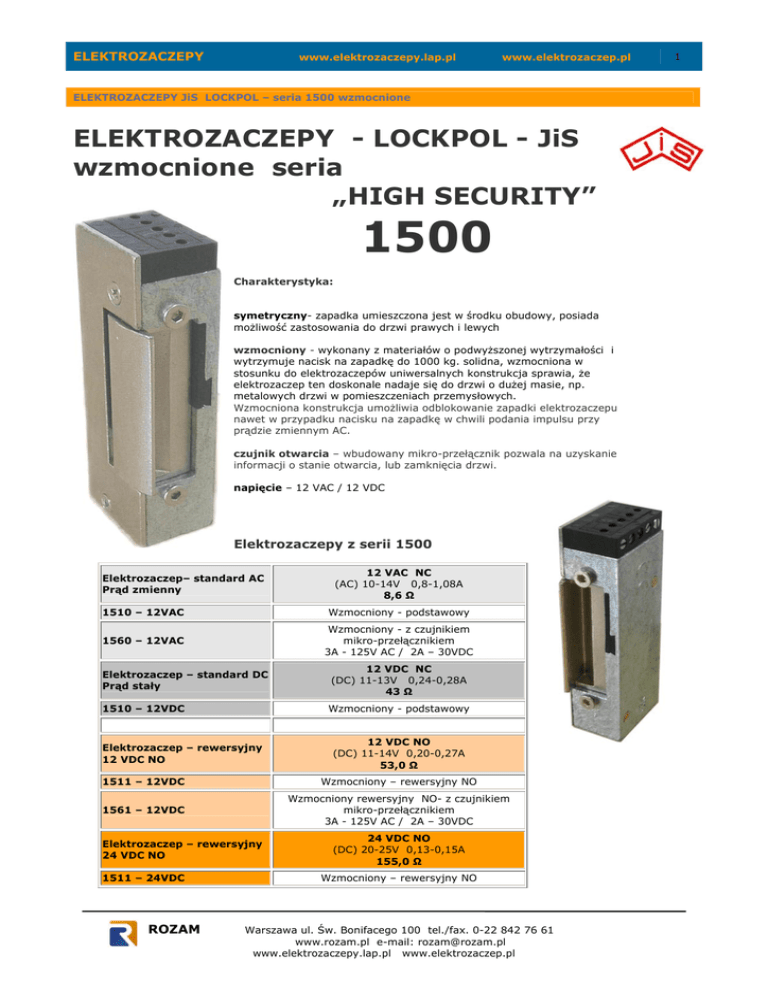 ELEKTROZACZEPY www.elektrozaczepy.lap.pl www.elektrozaczep.pl ELEKTROZACZEPY JiS LOCKPOL – seria 1500 wzmocnione ELEKTROZACZEPY - LOCKPOL - JiS wzmocnione seria „HIGH SECURITY” 1500 Charakterystyka: symetryczny- zapadka umieszczona jest w środku obudowy, posiada możliwość zastosowania do drzwi prawych i lewych wzmocniony - wykonany z materiałów o podwyższonej wytrzymałości i wytrzymuje nacisk na zapadkę do 1000 kg. solidna, wzmocniona w stosunku do elektrozaczepów uniwersalnych konstrukcja sprawia, że elektrozaczep ten doskonale nadaje się do drzwi o dużej masie, np. metalowych drzwi w pomieszczeniach przemysłowych. Wzmocniona konstrukcja umożliwia odblokowanie zapadki elektrozaczepu nawet w przypadku nacisku na zapadkę w chwili podania impulsu przy prądzie zmiennym AC. czujnik otwarcia – wbudowany mikro-przełącznik pozwala na uzyskanie informacji o stanie otwarcia, lub zamknięcia drzwi. napięcie – 12 VAC / 12 VDC Elektrozaczepy z serii 1500 Elektrozaczep– standard AC Prąd zmienny 12 VAC NC (AC) 10-14V 0,8-1,08A 8,6 Ω 1510 – 12VAC Wzmocniony - podstawowy 1560 – 12VAC Wzmocniony - z czujnikiem mikro-przełącznikiem 3A - 125V AC / 2A – 30VDC Elektrozaczep – standard DC Prąd stały 12 VDC NC (DC) 11-13V 0,24-0,28A 43 Ω 1510 – 12VDC Wzmocniony - podstawowy Elektrozaczep – rewersyjny 12 VDC NO 12 VDC NO (DC) 11-14V 0,20-0,27A 53,0 Ω 1511 – 12VDC Wzmocniony – rewersyjny NO 1561 – 12VDC Wzmocniony rewersyjny NO- z czujnikiem mikro-przełącznikiem 3A - 125V AC / 2A – 30VDC Elektrozaczep – rewersyjny 24 VDC NO 1511 – 24VDC ROZAM 24 VDC NO (DC) 20-25V 0,13-0,15A 155,0 Ω Wzmocniony – rewersyjny NO Warszawa ul. Św. Bonifacego 100 tel./fax. 0-22 842 76 61 www.rozam.pl e-mail: [email protected] www.elektrozaczepy.lap.pl www.elektrozaczep.pl 1 ELEKTROZACZEPY www.elektrozaczepy.lap.pl www.elektrozaczep.pl 2 ELEKTROZACZEPY JiS LOCKPOL – seria 1500 wzmocnione ELEKTROZACZEPY wzmocnione – seria 1500 Dane techniczne: Model – standard 12 V AC NC Model – standard 12 V DC NC Model – rewersyjny 12 V DC NO Model – rewersyjny 24 V DC NO Napięcie (AC) 10-14V (DC) 11-13V (DC) 11-14V (DC) 20-25V 0,8-1,08A 0,24-0,28A 0,20-0,27A 0,13-0,15A 8,6 Ω 43,0 Ω 53,0 Ω 155,0 Ω Prąd Oporność Wymiary: wysokość/szerokość/głębokość 85mm/21,5mm/29,5mm Elektrozaczep 1560 /1561 Wzmocniony z czujnikiem Elektrozaczepy Serii 1500 posiadają znak CE - NR 07/32300453 Oznakowanie CE informuje, że wyrób jest zgodny z europejskimi normami technicznymi. [ 89/336/CEE - 92/31/CE – 89/13/CE ]. ROZAM Warszawa ul. Św. Bonifacego 100 tel./fax. 0-22 842 76 61 www.rozam.pl e-mail: [email protected] www.elektrozaczepy.lap.pl www.elektrozaczep.pl