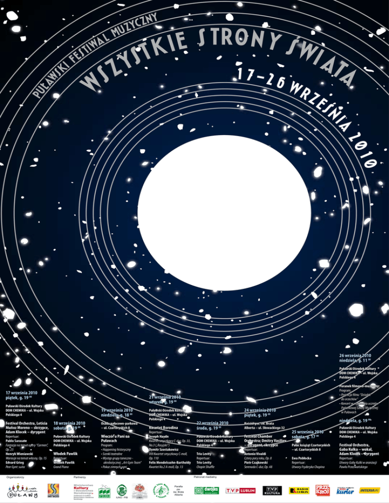 26 września 2010 niedziela, g. 11 00 Puławski Ośrodek Kultury DOM CHEMIKA – ul. Wojska Polskiego 4 17 września 2010 piątek, g. 19 00 21 września 2010 wtorek, g. 19 00 Puławski Ośrodek Kultury DOM CHEMIKA – ul. Wojska Polskiego 4 Festival Orchestra, Leticia Muñoz Moreno – skrzypce, Adam Klocek – dyrygent Repertuar: Pablo Sarasate Fantazja na temat opery “Carmen”, Op. 25 Henryk Wieniawski Wariacje na temat własny, Op. 15 Edvard Grieg Peer Gynt: suita Organizatorzy Poranek filmowo-muzyczny: Program: • Projekcja filmu “Dziadek do orzechów” • Koncert w wykonaniu uczniów Państwowej Szkoły Muzycznej w Puławach 19 września 2010 niedziela, g. 18 00 18 września 2010 sobota, g. 19 00 Osada pałacowo-parkowa – ul. Czartoryskich 8 Puławski Ośrodek Kultury DOM CHEMIKA – ul. Wojska Polskiego 4 Wieczór u Pani na Puławach Włodek Pawlik Repertuar: Włodek Pawlik Grand Piano Program: • Happening historyczny • Scenki teatralne • Występ grupy taneczno akrobatycznej „Art Gym Team” • Pokaz zimnych ogni Puławski Ośrodek Kultury DOM CHEMIKA – ul. Wojska Polskiego 4 Kwartet Borodina Repertuar: Joseph Haydn Kwartet smyczkowy C-dur, Op. 33, No.3 („Rosyjski”) Dymitr Szostakowicz VIII Kwartet smyczkowy C-moll, Op. 110 Felix Mendelssohn-Bartholdy Kwartet No.2 A-moll, Op. 13 22 września 2010 środa, g. 19 00 Kościół pw. św. Brata Alberta – ul. Słowackiego 32 Puławski Ośrodek Kultury DOM CHEMIKA – ul. Wojska Polskiego 4 Festival Chamber Orchestra; Dmitry Vasiliev – dyrygent, skrzypce Trio Levity Repertuar: Trio Levity Chopin Shuffle Patronat medialny Partnerzy Zrealizowano ze środków Ministra Kultury i Dziedzictwa Narodowego. 24 września 2010 piątek, g. 19 00 IUNG - PIB Parafia pw. św. Brata Alberta Repertuar: Antonio Vivaldi Cztery pory roku, Op. 8 Piotr Czajkowski Serenada C-dur, Op. 48 niedziela, g. 19 00 25 września 2010 sobota, g. 17 00 Pałac książąt Czartoryskich – ul. Czartoryskich 8 Ewa Pobłocka Repertuar: Utwory Fryderyka Chopina Puławski Ośrodek Kultury DOM CHEMIKA – ul. Wojska Polskiego 4 Festival Orchestra, Gaba Kulka – wokal, Adam Klocek – dyrygent Repertuar: Utwory Gaby Kulki w aranżacji Pawła Przezwańskiego
