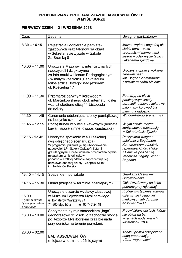 PROPONOWANY PROGRAM ZJAZDU ABSOLWENTÓW LP W