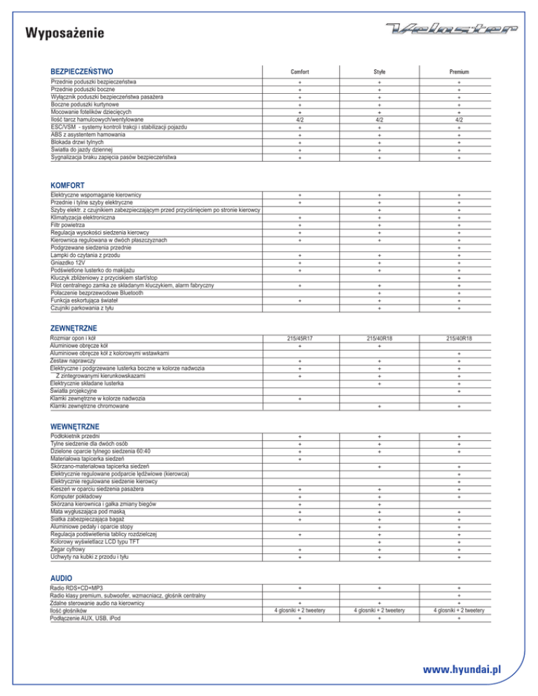 BEZPIECZEÑSTWO Przednie poduszki bezpieczeñstwa Przednie poduszki boczne Wy³¹cznik poduszki bezpieczeñstwa pasa¿era Boczne poduszki kurtynowe Mocowanie fotelików dzieciêcych Iloœæ tarcz hamulcowych/wentylowane ESC/VSM - systemy kontroli trakcji i stabilizacji pojazdu ABS z asystentem hamowania Blokada drzwi tylnych Œwiat³a do jazdy dziennej Sygnalizacja braku zapiêcia pasów bezpieczeñstwa Comfort Style Premium 4/2 4/2 4/2 215/45R17 215/40R18 215/40R18 4 glosniki + 2 tweetery 4 glosniki + 2 tweetery 4 glosniki + 2 tweetery KOMFORT Elektryczne wspomaganie kierownicy Przednie i tylne szyby elektryczne Szyby elektr. z czujnikiem zabezpieczaj¹cym przed przyciœniêciem po stronie kierowcy Klimatyzacja elektroniczna Filtr powietrza Regulacja wysokoœci siedzenia kierowcy Kierownica regulowana w dwóch pùaszczyznach Podgrzewane siedzenia przednie Lampki do czytania z przodu Gniazdko 12V Podœwietlone lusterko do makija¿u Kluczyk zbli¿eniowy z przyciskiem start/stop Pilot centralnego zamka ze skùadanym kluczykiem, alarm fabryczny Poùaczenie bezprzewodowe Bluetooth Funkcja eskortuj¹ca œwiate³ Czujniki parkowania z ty³u ZEWNÊTRZNE Rozmiar opon i kó³ Aluminiowe obrêcze kó³ Aluminiowe obrêcze kó³ z kolorowymi wstawkami Zestaw naprawczy Elektryczne i podgrzewane lusterka boczne w kolorze nadwozia Z zintegrowanymi kierunkowskazami Elektrycznie sk³adane lusterka Œwiat³a projekcyjne Klamki zewnêtrzne w kolorze nadwozia Klamki zewnêtrzne chromowane WEWNÊTRZNE Podùokietnik przedni Tylne siedzenie dla dwóch osób Dzielone oparcie tylnego siedzenia 60:40 Materia³owa tapicerka siedzeñ Skórzano-materia³owa tapicerka siedzeñ Elektrycznie regulowane podparcie lêdŸwiowe (kierowca) Elektrycznie regulowane siedzenie kierowcy Kieszeñ w oparciu siedzenia pasa¿era Komputer pok³adowy Skórzana kierownica i ga³ka zmiany biegów Mata wyg³uszaj¹ca pod mask¹ Siatka zabezpieczaj¹ca baga¿ Aluminiowe peda³y i oparcie stopy Regulacja podœwietlenia tablicy rozdzielczej Kolorowy wyœwietlacz LCD typu TFT Zegar cyfrowy Uchwyty na kubki z przodu i ty³u AUDIO Radio RDS+CD+MP3 Radio klasy premium, subwoofer, wzmacniacz, g³oœnik centralny Zdalne sterowanie audio na kierownicy Iloœæ g³oœników Podùàczenie AUX, USB, iPod