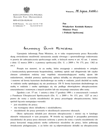 R Z E C Z P O S P O L I T A POLSKA Rzecznik Praw Obywatelskich RPO-633226-III/09/AS 00-090 Warszawa Tel. centr. 0-22 551 77 00 Al. Solidarności 77 Fax 0-22 827 64 53 Pan Władysław Kosiniak-Kamysz Minister Pracy i Polityki Społecznej Uprzejmie informuję Pana Ministra, że w toku rozpatrywania przez Rzecznika skarg stwierdzono możliwość naruszenia zasady równego i sprawiedliwego traktowania w prawie do zabezpieczenia społecznego osób, o których mowa w art. 42 ust. 1 ustawy z dnia 12 marca 2004 r. o pomocy społecznej (Dz. U. z 2009 r. Nr 175, poz. 1362 ze zm.). Przepis ten stanowi, że za osobę, która zrezygnuje z zatrudnienia w związku z koniecznością sprawowania bezpośredniej, osobistej opieki nad długotrwale lub ciężko chorym członkiem rodziny oraz wspólnie niezamieszkującymi matką ojcem lub rodzeństwem, ośrodek pomocy społecznej opłaca składkę na ubezpieczenia emerytalne i rentowe od kwoty kryterium dochodowego na osobę w rodzinie, jeżeli dochód na osobę w rodzinie osoby opiekującej się nie przekracza 150 % kwoty kryterium dochodowego na osobę w rodzinie i osoba opiekująca się nie podlega obowiązkowo ubezpieczeniom: emerytalnemu i rentowym z innych tytułów lub nie otrzymuje emerytury albo renty. Zgodnie z art. 57 ust. 1 ustawy z dnia 17 grudnia 1998 r. o emeryturach i rentach z Funduszu Ubezpieczeń Społecznych (Dz. U. z 2009 r. Nr 153, poz. 1227 ze zm.) prawo do renty z tytułu niezdolności do pracy przysługuje ubezpieczonemu, który spełnił łącznie następujące warunki: • jest niezdolny do pracy; • ma wymagany okres składkowy i nieskładkowy; • niezdolność do pracy powstała w określonych ustawowo okresach. Okres opłacania składek jest okresem ubezpieczenia i mieści się w katalogu okresów wskazanych w tym przepisie. W świetle tej regulacji w przypadku powstania niezdolności do pracy poza okresem ochrony z prawa do renty z tytułu niezdolności do pracy korzystać mogą jedynie osoby całkowicie niezdolne do pracy, które pobierają świadczenie pielęgnacyjne, a za które nie są odprowadzanie składki na ubezpieczenia - 2 - emerytalne i rentowe z uwagi na posiadany przez nie staż ubezpieczeniowy. W tym przypadku nie ma znaczenia fakt, że niezdolność do pracy zaistniała w okresie późniejszym, niż 18 miesięcy od ustania ubezpieczenia. Wynika to z treści art. 57 ust. 2 ustawy emerytalnej, w świetle którego warunek zaistnienia niezdolności do pracy w okresie ochronnym nie znajduje zastosowania wobec ubezpieczonego, który udowodnił okres składkowy i nieskładkowy wynoszący co najmniej 20 lat dla kobiety lub 25 lat dla mężczyzny oraz jest całkowicie niezdolny do pracy. Z prawa do renty z tytułu niezdolności do pracy nie mogą zatem skorzystać osoby pobierające świadczenie pielęgnacyjne, za które nie są odprowadzane składki na ubezpieczenie z uwagi na fakt posiadania odpowiedniego stażu ubezpieczenia w sytuacji, kiedy moment zaistnienia częściowej niezdolności do pracy przypadać będzie w okresie późniejszym, niż 18 miesięcy od ustania ubezpieczenia (po okresie ochrony). Wprowadzając nową formę wsparcia z systemu pomocy społecznej w postaci opłacania składek ustawodawca kierował się potrzebą zapewnienia prawa do zabezpieczenia społecznego w formie emerytury lub renty osobom rezygnującym z zatrudnienia w związku z koniecznością sprawowania bezpośredniej, osobistej opieki nad długotrwale lub ciężko chorym członkiem rodziny. Stąd też ośrodek pomocy społecznej opłaca obowiązkowo składkę na ubezpieczenia emerytalne i rentowe za takie osoby. Zasada ta nie znajduje zastosowania jedynie wobec osób podlegających obowiązkowo tym ubezpieczeniom z innych tytułów lub już pobierających emeryturę albo rentę. Przy realizacji tego założenia nie uwzględniono jednak przedstawionej sytuacji, która prowadzi do eliminacji z kręgu uprawnionych do renty z tytułu niezdolności do pracy osoby częściowo niezdolne do pracy i pobierające świadczenie pielęgnacyjne, za które zaprzestano opłacać składkę na ubezpieczenie społeczne ze względu na odpowiednio długi staż ubezpieczeniowy, jeżeli ich niezdolność do pracy powstała poza okresem ochrony. W przekonaniu Rzecznika nie ma konstytucyjnego uzasadnienia takie zróżnicowanie w prawie do renty z tytułu niezdolności do pracy osób pobierających świadczenie pielęgnacyjne. Powyższego stanowiska nie zmienia okoliczność, że w przypadku pogorszenia się stanu zdrowia osoby takie mogą wystąpić ponownie o ustalenie stopnia niezdolności do pracy. Działając na podstawie art. 16 ust. 1 ustawy z dnia 15 lipca 1987 r. o Rzeczniku Praw Obywatelskich (Dz. U. z 2001 r. Nr 14, poz. 147 ze zm.), uprzejmie proszę Pana Ministra o przedstawienie stanowiska w tej sprawie.