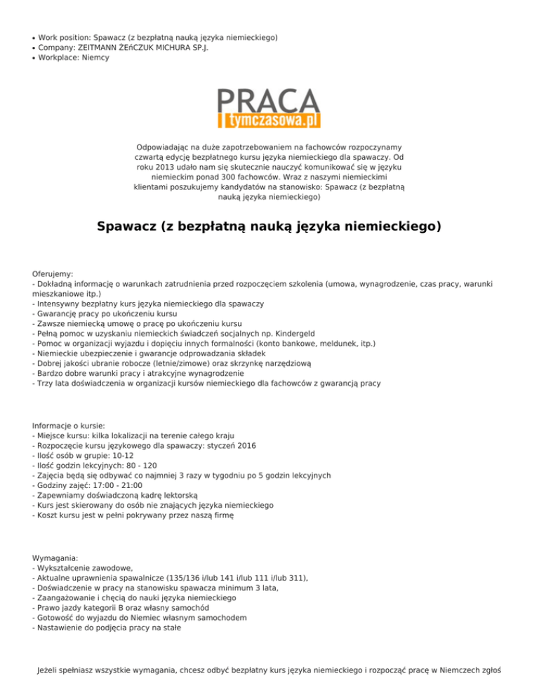 ● ● ● Work position: Spawacz (z bezpłatną nauką języka niemieckiego) Company: ZEITMANN ŻEńCZUK MICHURA SP.J. Workplace: Niemcy Odpowiadając na duże zapotrzebowaniem na fachowców rozpoczynamy czwartą edycję bezpłatnego kursu języka niemieckiego dla spawaczy. Od roku 2013 udało nam się skutecznie nauczyć komunikować się w języku niemieckim ponad 300 fachowców. Wraz z naszymi niemieckimi klientami poszukujemy kandydatów na stanowisko: Spawacz (z bezpłatną nauką języka niemieckiego) Spawacz (z bezpłatną nauką języka niemieckiego) Oferujemy: - Dokładną informację o warunkach zatrudnienia przed rozpoczęciem szkolenia (umowa, wynagrodzenie, czas pracy, warunki mieszkaniowe itp.) - Intensywny bezpłatny kurs języka niemieckiego dla spawaczy - Gwarancję pracy po ukończeniu kursu - Zawsze niemiecką umowę o pracę po ukończeniu kursu - Pełną pomoc w uzyskaniu niemieckich świadczeń socjalnych np. Kindergeld - Pomoc w organizacji wyjazdu i dopięciu innych formalności (konto bankowe, meldunek, itp.) - Niemieckie ubezpieczenie i gwarancje odprowadzania składek - Dobrej jakości ubranie robocze (letnie/zimowe) oraz skrzynkę narzędziową - Bardzo dobre warunki pracy i atrakcyjne wynagrodzenie - Trzy lata doświadczenia w organizacji kursów niemieckiego dla fachowców z gwarancją pracy Informacje o kursie: - Miejsce kursu: kilka lokalizacji na terenie całego kraju - Rozpoczęcie kursu językowego dla spawaczy: styczeń 2016 - Ilość osób w grupie: 10-12 - Ilość godzin lekcyjnych: 80 - 120 - Zajęcia będą się odbywać co najmniej 3 razy w tygodniu po 5 godzin lekcyjnych - Godziny zajęć: 17:00 - 21:00 - Zapewniamy doświadczoną kadrę lektorską - Kurs jest skierowany do osób nie znających języka niemieckiego - Koszt kursu jest w pełni pokrywany przez naszą firmę Wymagania: - Wykształcenie zawodowe, - Aktualne uprawnienia spawalnicze (135/136 i/lub 141 i/lub 111 i/lub 311), - Doświadczenie w pracy na stanowisku spawacza minimum 3 lata, - Zaangażowanie i chęcią do nauki języka niemieckiego - Prawo jazdy kategorii B oraz własny samochód - Gotowość do wyjazdu do Niemiec własnym samochodem - Nastawienie do podjęcia pracy na stałe Jeżeli spełniasz wszystkie wymagania, chcesz odbyć bezpłatny kurs języka niemieckiego i rozpocząć pracę w Niemczech zgłoś się do nas! Osoby zainteresowane prosimy o kontakt telefoniczny 12 661 64 00 lub o aplikację drogą elektroniczną (załączając CV oraz posiadane uprawnienia) Uprzejmie informujemy, że skontaktujemy się wyłącznie z wybranymi kandydatami. Zeitmann Sp.j. ul. Walerego Sławka 3, 30-633 Kraków. Numer Agencji Zatrudnienia 9212. Aplikuj Dane kontaktowe: ZEITMANN ŻEńCZUK MICHURA SP.J. Send Save Print Tweet