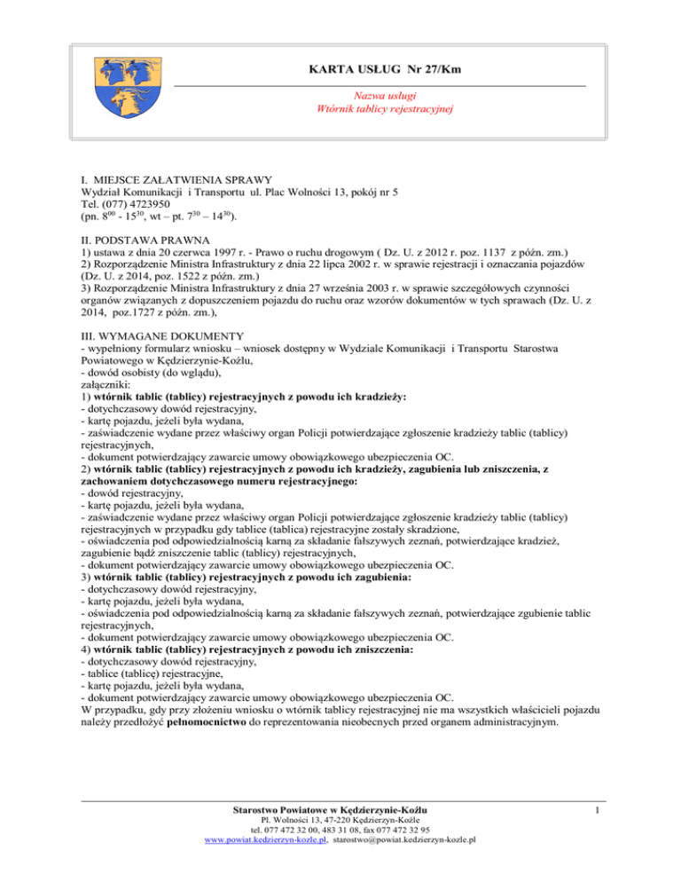 KARTA USŁUG Nr 27/Km dxkdjdakjjsajhahssdJu Nazwa usługi ksjshs Wtórnik tablicy rejestracyjnej I. MIEJSCE ZAŁATWIENIA SPRAWY Wydział Komunikacji i Transportu ul. Plac Wolności 13, pokój nr 5 Tel. (077) 4723950 (pn. 800 - 1530, wt – pt. 730 – 1430). II. PODSTAWA PRAWNA 1) ustawa z dnia 20 czerwca 1997 r. - Prawo o ruchu drogowym ( Dz. U. z 2012 r. poz. 1137 z późn. zm.) 2) Rozporządzenie Ministra Infrastruktury z dnia 22 lipca 2002 r. w sprawie rejestracji i oznaczania pojazdów (Dz. U. z 2014, poz. 1522 z późn. zm.) 3) Rozporządzenie Ministra Infrastruktury z dnia 27 września 2003 r. w sprawie szczegółowych czynności organów związanych z dopuszczeniem pojazdu do ruchu oraz wzorów dokumentów w tych sprawach (Dz. U. z 2014, poz.1727 z późn. zm.), III. WYMAGANE DOKUMENTY - wypełniony formularz wniosku – wniosek dostępny w Wydziale Komunikacji i Transportu Starostwa Powiatowego w Kędzierzynie-Koźlu, - dowód osobisty (do wglądu), załączniki: 1) wtórnik tablic (tablicy) rejestracyjnych z powodu ich kradzieży: - dotychczasowy dowód rejestracyjny, - kartę pojazdu, jeżeli była wydana, - zaświadczenie wydane przez właściwy organ Policji potwierdzające zgłoszenie kradzieży tablic (tablicy) rejestracyjnych, - dokument potwierdzający zawarcie umowy obowiązkowego ubezpieczenia OC. 2) wtórnik tablic (tablicy) rejestracyjnych z powodu ich kradzieży, zagubienia lub zniszczenia, z zachowaniem dotychczasowego numeru rejestracyjnego: - dowód rejestracyjny, - kartę pojazdu, jeżeli była wydana, - zaświadczenie wydane przez właściwy organ Policji potwierdzające zgłoszenie kradzieży tablic (tablicy) rejestracyjnych w przypadku gdy tablice (tablica) rejestracyjne zostały skradzione, - oświadczenia pod odpowiedzialnością karną za składanie fałszywych zeznań, potwierdzające kradzież, zagubienie bądź zniszczenie tablic (tablicy) rejestracyjnych, - dokument potwierdzający zawarcie umowy obowiązkowego ubezpieczenia OC. 3) wtórnik tablic (tablicy) rejestracyjnych z powodu ich zagubienia: - dotychczasowy dowód rejestracyjny, - kartę pojazdu, jeżeli była wydana, - oświadczenia pod odpowiedzialnością karną za składanie fałszywych zeznań, potwierdzające zgubienie tablic rejestracyjnych, - dokument potwierdzający zawarcie umowy obowiązkowego ubezpieczenia OC. 4) wtórnik tablic (tablicy) rejestracyjnych z powodu ich zniszczenia: - dotychczasowy dowód rejestracyjny, - tablice (tablicę) rejestracyjne, - kartę pojazdu, jeżeli była wydana, - dokument potwierdzający zawarcie umowy obowiązkowego ubezpieczenia OC. W przypadku, gdy przy złożeniu wniosku o wtórnik tablicy rejestracyjnej nie ma wszystkich właścicieli pojazdu należy przedłożyć pełnomocnictwo do reprezentowania nieobecnych przed organem administracyjnym. Starostwo Powiatowe w Kędzierzynie-Koźlu Pl. Wolności 13, 47-220 Kędzierzyn-Koźle tel. 077 472 32 00, 483 31 08, fax 077 472 32 95 www.powiat.kedzierzyn-kozle.pl, [email protected] 1 IV. OPŁATY Opłata skarbowa: brak, Opłata za wtórnik tablic rejestracyjnych: - samochodowych - 80 zł, - motocyklowych - 40 zł, - motorowerowych - 30 zł, - indywidualnych - 80 zł, - zabytkowych: samochodowych – 100 zł, motocyklowych – 50 zł, Opłata ewidencyjna za wydanie: - zalegalizowanie tablic (tablicy) rejestracyjnych – 0,50 zł, Opłatę administracyjną oraz opłatę ewidencyjną można uiścić w kasie Starostwa Powiatowego w KędzierzynieKoźlu bez ponoszenia dodatkowych kosztów lub poprzez bezpośrednią wpłatę na konto PKO BP. Oddział w Kędzierzynie – Koźlu nr 06 10203714 0000 4302 0105 5623. V. TERMIN ZAŁATWIENIA SPRAWY Terminy załatwienia sprawy określa art. 35 kpa: - organy administracji publicznej obowiązane są załatwić sprawy bez zbędnej zwłoki, - niezwłocznie powinny być załatwiane sprawy, które mogą być rozpatrzone w oparciu o dowody przedstawione przez stronę, - nie później niż w ciągu miesiąca, sprawy wymagające postępowania wyjaśniającego, - nie później niż w ciągu 2 miesięcy od wszczęcia postępowania w sprawach szczególnie skomplikowanych. VI. TRYB ODWOŁAWCZY Nie przysługuje. VII. UWAGI Opracował: Stanisław Siemaszko- ………………………… (podpis osoby sporządzającej kartę) Zatwierdził: Dariusz Strzelec-………………………………. (podpis Kierownika Wydziału merytorycznego) Starostwo Powiatowe w Kędzierzynie-Koźlu Pl. Wolności 13, 47-220 Kędzierzyn-Koźle tel. 077 472 32 00, 483 31 08, fax 077 472 32 95 www.powiat.kedzierzyn-kozle.pl, [email protected] 2