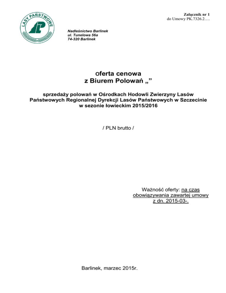 Załącznik nr 1 do Umowy PK.7326.2…. Nadleśnictwo Barlinek ul. Tunelowa 56a 74-320 Barlinek Oferta cenowa z Biurem Polowań „” sprzedaży polowań w Ośrodkach Hodowli Zwierzyny Lasów Państwowych Regionalnej Dyrekcji Lasów Państwowych w Szczecinie w sezonie łowieckim 2015/2016 / PLN brutto / Ważność oferty: na czas obowiązywania zawartej umowy z dn. 2015-03-. Barlinek, marzec 2015r. Załącznik nr 1 do Umowy PK.7326.2…. Spis treści Świadczenia pobytowe .......................................................................................... 1 Organizacja polowania .......................................................................................... 2 Opłata za pozyskane trofeum ............................................................................... 3 Jelenie ............................................................................................................................ 3 Sarny ........................................................................ Błąd! Nie zdefiniowano zakładki. Dziki ........................................................................ Błąd! Nie zdefiniowano zakładki. Zwierzyna drobna .......................................................................................................... 4 4 Zakup tuszy lub skóry ........................................................................................... 4 5 Świadczenia towarzyszące .................................................................................... 5 6 Warunki współpracy ............................................................................................. 5 1 2 3 Załącznik nr 1 do Umowy PK.7326.2…. 1 Świadczenia pobytowe 1. Opłata za pobyt – 1 myśliwego Cena obejmuje: - zakwaterowanie cudzoziemca wynosi dziennie a/ w kwaterach myśliwskich kat „S” lub hotelach *** - dopłata do pokoju 1-osob. Lub 2-osob. do pojedynczego użytku - w przypadku zakwaterowania w jednym pokoju więcej niż 2 osób opłata od osoby b/ w kwaterach myśliwskich kat. „I” lub hotelach ** - dopłata do pokoju 1-osob. Lub 2-osob. Do pojedynczego użytku 2. Opłata za pobyt – 1 osoba – nie myśliwy Cena obejmuje: - zakwaterowanie cudzoziemca lub tłumacza wynosząca dziennie: /bez względu na kategorię kwatery/ Na specjalne zmówienie klienta może być zorganizowany uroczysty posiłek (obiad lub kolacja) za dopłatą od każdego cudzoziemca 3. Opłata za całodzienne wyżywienie wynosi: Na polowaniach indywidualnych: - śniadanie - obiad - kolacja Na polowaniach zbiorowych: - śniadanie - posiłek w lesie - obiadokolacja 4. Pobyt dzieci / dobę dzieci w wieku do lat 4 dzieci w wieku od lat 4 do 12 156,57,116,104,49,- 90,- 82,137,34,47,56,- 34,23,80,- Bezpłatnie 50% opłaty za pobyt nie myśliwego Nie wyszczególnione w niniejszej ofercie świadczenia ustala się każdorazowo indywidualnie. 1 Załącznik nr 1 do Umowy PK.7326.2…. 2 Organizacja polowania 1. Organizacja polowania indywidualnego Opłata wynosi od każdego myśliwego dziennie i obejmuje: - przygotowanie łowiska, - zapewnienie 1 podprowadzającego dla każdego myśliwego - preparację i ocenę trofeów - transport tuszy zwierzyny - przygotowanie dokumentacji 2. Transport myśliwego w łowisku Ryczałt kosztów transportu w łowisku na polowaniach indywidualnych Wynosi na 1 myśliwego dziennie: 221,- 195,- 3. Organizacja polowania zbiorowego Opłata od każdego myśliwego za każdy dzień polowania obejmuje: - zapewnienie niezbędnej ilości naganiaczy i psów myśliwskich, - transport podczas polowania, - pokot zwierzyny, - uroczysty wybór króla polowania, - wręczenie pamiątkowych medali, dyplomów - przygotowanie łowiska - preparację trofeów i wynosi od myśliwego za dzień polowania: polowanie na zwierzynę grubą: grupa do 8 – 12 myśliwych 540,- grupa 13 i więcej myśliwych 432,- grupa do 8 myśliwych – tzw. ciche pędzenia* 540,- * ciche pędzenia (druczki): 2-3 naganiaczy bez psów, myśliwi stoją na przejściach zwierzyny, polowanie głównie na zwierzynę płową. 2 Załącznik nr 1 do Umowy PK.7326.2…. 3 Opłata za pozyskane trofeum 1 Jelenie Opłata za postrzelenie 2 postrzelenie jelenia byka 2200,- postrzelenie jelenia łani lub cielaka Opłata za trofeum Byki trofeum o masie do 2kg (w tym byk-szpicak) 1338,- trofeum o masie od 2,01 – 2,49 kg* 2433,- trofeum o masie od 2,50 – 2,99 kg* 3244,- trofeum o masie od 3,00 – 3,49 kg* 3548,- trofeum o masie od 3,50 – 3,99 kg* 3922,- trofeum o masie od 4,00 – 4,49 kg* 4001,- trofeum o masie od 4,50 – 4,99 kg* 4471,- trofeum o masie od 5,00 – 5,99 kg* 4671,+ 12,20 - za każde 0,01kg powyżej 5kg trofeum o masie od 6,00 – 6,99 kg* 6019,+ 16,40 - za każde 0,01kg powyżej 6kg trofeum o masie od 7,00 – 7,99 kg* 7946,+ 39,80 - za każde 0,01kg powyżej 7kg trofeum o masie powyżej 8,00 kg * 204,- 12039,+ 56,20 - za każde 0,01 kg powyżej 8 kg W przypadku podniesienia trofeum, wcześniej zaliczonego jako „trofeum nie podniesione”, nalicza się prócz rzeczywistej wartości trofeum (pomniejszonej o wartość wpłaconą za postrzelenie) umowną karę wynikającą z utraty tuszy w wysokości ekwiwalentu wartości 130 kg tuszy jelenia byka. Łanie i cielęta trofeum: grandle, rapcie 200,- Opłata za trofeum zawiera koszty przygotowania trofeum do preparowania, koszty preparacji i przechowania oraz koszty wydania certyfikatu o miejscu pozyskania trofeum, jego wadze i wstępnej wycenie według CIC. Certyfikat wydawany jest zgodnie z zapisami Decyzji nr. 76 Dyrektora Generalnego Lasów Państwowych z dnia 2.XII.2011r. 1 ² Przy postrzeleniu zwierzyny stosuje się podatek VAT w wysokości jak przy organizacji polowania. 3 Załącznik nr 1 do Umowy PK.7326.2…. Zwierzyna drobna Opłata za trofeum: trofeum z lisa (czaszka) 1,- trofeum z szopa pracza (czaszka) 1,- norka amerykańska (czaszka) 1,- trofeum z jenota (czaszka) 1,- trofeum z borsuka (czaszka) 62,- trofeum z kuny (czaszka) 52,- trofeum z t