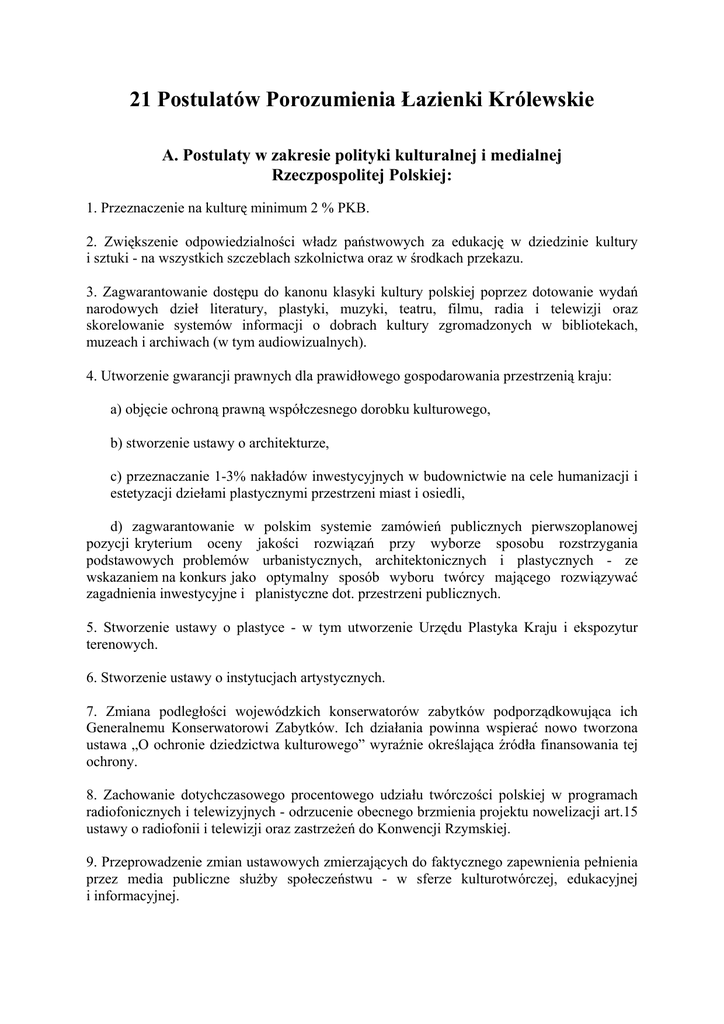 21 Postulatów Porozumienia Łazienki Królewskie A. Postulaty w zakresie polityki kulturalnej i medialnej Rzeczpospolitej Polskiej: 1. Przeznaczenie na kulturę minimum 2 % PKB. 2. Zwiększenie odpowiedzialności władz państwowych za edukację w dziedzinie kultury i sztuki - na wszystkich szczeblach szkolnictwa oraz w środkach przekazu. 3. Zagwarantowanie dostępu do kanonu klasyki kultury polskiej poprzez dotowanie wydań narodowych dzieł literatury, plastyki, muzyki, teatru, filmu, radia i telewizji oraz skorelowanie systemów informacji o dobrach kultury zgromadzonych w bibliotekach, muzeach i archiwach (w tym audiowizualnych). 4. Utworzenie gwarancji prawnych dla prawidłowego gospodarowania przestrzenią kraju: a) objęcie ochroną prawną współczesnego dorobku kulturowego, b) stworzenie ustawy o architekturze, c) przeznaczanie 1-3% nakładów inwestycyjnych w budownictwie na cele humanizacji i estetyzacji dziełami plastycznymi przestrzeni miast i osiedli, d) zagwarantowanie w polskim systemie zamówień publicznych pierwszoplanowej pozycji kryterium oceny jakości rozwiązań przy wyborze sposobu rozstrzygania podstawowych problemów urbanistycznych, architektonicznych i plastycznych - ze wskazaniem na konkurs jako optymalny sposób wyboru twórcy mającego rozwiązywać zagadnienia inwestycyjne i planistyczne dot. przestrzeni publicznych. 5. Stworzenie ustawy o plastyce - w tym utworzenie Urzędu Plastyka Kraju i ekspozytur terenowych. 6. Stworzenie ustawy o instytucjach artystycznych. 7. Zmiana podległości wojewódzkich konserwatorów zabytków podporządkowująca ich Generalnemu Konserwatorowi Zabytków. Ich działania powinna wspierać nowo tworzona ustawa „O ochronie dziedzictwa kulturowego” wyraźnie określająca źródła finansowania tej ochrony. 8. Zachowanie dotychczasowego procentowego udziału twórczości polskiej w programach radiofonicznych i telewizyjnych - odrzucenie obecnego brzmienia projektu nowelizacji art.15 ustawy o radiofonii i telewizji oraz zastrzeżeń do Konwencji Rzymskiej. 9. Przeprowadzenie zmian ustawowych zmierzających do faktycznego zapewnienia pełnienia przez media publiczne służby społeczeństwu - w sferze kulturotwórczej, edukacyjnej i informacyjnej. 10. Przywrócenie roli polskiego wzornictwa przemysłowego w polityce przemysłowej kraju celem zwiększenia konkurencyjności polskiego eksportu towarów przemysłowych, rolnych i kulturalnych. 11. Uregulowanie praw do własności instytucji kultury. B. Postulaty w zakresie warunków twórczości: 1. Stworzenie ustawy o działalności twórczej (status twórcy, jego prawa, obowiązki i zasady wykonywania swojej specjalizacji twórczej, wydzielone miejsce i narzędzia indywidualnej pracy twórczej, zapewnienie bezpłatnego wstępu do galerii, muzeów, filharmonii, teatrów i kin). 2. Kompleksowa weryfikacja ustawy o prawie autorskim i prawach pokrewnych. 3. Wprowadzenie ochrony rynku pracy dla polskich twórców i artystów wykonawców na najkorzystniejszych zasadach przyjętych w krajach Unii Europejskiej (licencje zawodowe, zamówienia publiczne, uprawnienia budowlane). 4. Przeprowadzenie profesjonalnymi metodami badań poziomu bezrobocia wśród twórców. 5. Przeprowadzenie zmian ustawowych zapewniających dziennikarzom status wolnego zawodu i jego ochronę. 6. Pakiet spraw podatkowych: a) utrzymanie 50% kosztów uzyskania przychodów z dzieł tworzonych przez twórców i artystów wykonawców, b) przywrócenie możliwości opodatkowania twórców i artystów wykonawców na zasadach dawnego tzw. konta „W”, c) utrzymanie zerowej stawki VAT do umów o dzieło twórców oraz do książek. 7. Pakiet spraw ubezpieczeń: a) utrzymanie dotychczasowych zasad emerytalnych i rentowych dla pracowników instytucji artystycznych, b) dostosowanie ustaw o ubezpieczeniu społecznym i ubezpieczeniu zdrowotnym dla twórców nie zatrudnionych na etatach, c) umożliwienie opłacania składek na ubezpieczenie społeczne i zdrowotne w zależności od terminów wypłaconych honorariów, d) zwrot zagarniętych przez Państwo indywidualnych składek na tzw. emerytury twórcze, e) utworzenie specjalistycznych placówek służby zdrowia uwzględniających specyfikę środowiska twórców. 8. Nowelizacja ustawy o grach losowych (art.47b ust.1a) umożliwiająca stowarzyszeniom i związkom twórców udział w podziale środków finansowych. 9. Nowelizacja ustawy o działalności pożytku publicznego i o wolontariacie w celu zapewniania sprawiedliwej reprezentacji stowarzyszeń twórców w Radzie Działalności Pożytku Publicznego. 10. Utrzymanie Funduszu Promocji Twórczości. Podpisy