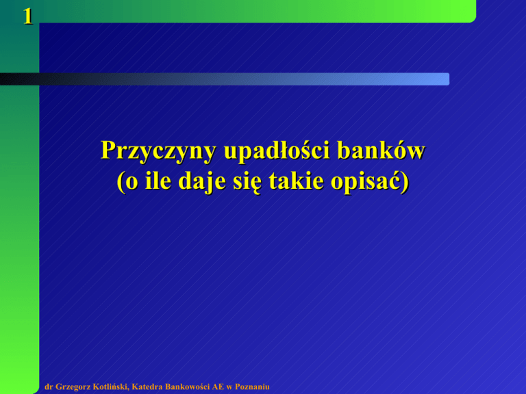 1 Przyczyny upadłości banków (o ile daje się takie opisać) dr Grzegorz Kotliński, Katedra Bankowości AE w Poznaniu 2 Upadłość banku kryzysy ogólnosektorowe wywołane z reguły kryzysem gospodarczym kryzys gospodarczy wywołany z reguły załamaniami wartości waluty powodem kryzysów mogą być także problemy samych banków – przykład banki japońskie oskarżane o współpracę z mafią oraz korupcję Przyczyną mogą być także przemiany gospodarcze - Polska dr Grzegorz Kotliński, Katedra Bankowości AE w Poznaniu upadłości incydentalne Wywołane są z reguły problemami wewnętrznymi banków Ich powodem często jest nieuczciwość właścicieli albo osób zarządzających Brak lub nieudolność nadzoru bankowego Panika wśród klientów Inne? 3 Podstawowe przyczyny upadłości banków Przyczyny upadłości banków Przyczyny wewnętrzne ZŁE ZARZĄDZANIE AKTYWAMI: W tym: Straty spowodowane złą gospodarką kredytową (złe procedury, zbytnie zaangażowanie, kredytowanie sółek powiązanych, nieprzestrzeganie norm ostrożnościowych) Koncentracja kredytów w słabych i niestabilnych sektorach gospodarki bankructwo głównych kredytobiorców Liczba przypadków 50 30 13 5 Brak właściwego kierownictwa i sprawnych wewnętrznych procedur kredytowych 23 W tym : Złe inwestycje banku lub przedsiębiorstwa zależnego Fałszywe dane finansowe banku Oszustwa podatkowe zbyt ambitna polityka właścicieli 7 6 2 2 Zła pozycja finansowa banku 2 Niedokapitalizowanie banku 2 Przyczyny wewnętrzne Run na bank Problemy innego banku lub holdingu, którego jest częścią Złe warunki makroekonomiczne Niekorzystne w prasieAE w Poznaniu dr Grzegorz Kotliński,komentarze Katedra Bankowości 8 5 1 1 4 Kryzysy ogólnosektorowe Kryzys hiszpański (1977-1985) Kryzys nordycki (1990 -1992) Kryzys amerykański (1981 -1991) Kryzys japoński (II połowa lat 90_ tych) Kryzys rosyjski (1998) Kryzys argentyński (2002) dr Grzegorz Kotliński, Katedra Bankowości AE w Poznaniu 5 Spektakularne upadłości banków Credit Lyonnais (lata 80-te) mino, że w końcu nie ogłoszono jego upadłości Banco Ambrosiano (1982) Baring’s Bank (Łajdak na giełdzie) Bank of credit and commerce international Bank Staropolski SA Bank Posnania SA Bank Merkury Bank Handlowo Przemysłowy SA bs-y dr Grzegorz Kotliński, Katedra Bankowości AE w Poznaniu 6 Czynniki zwiększające ryzyko upadku banków (wg Fraserów, Ocena wyników …) Nieistniejąca lub niewłaściwie realizowana polityka kredytowa (88%) Nieadekwatne systemy zapewniające zgodność działań z wewnętrzną polityką banku oraz przepisami prawa bankowego (69%) Nieodpowiednie systemy kontroli wewnętrznej kluczowych pracowników i departamentów banków (62%) Niewłaściwe systemy identyfikacji kredytów wątpliwych i trudnych (59%) Decyzje podejmowane przez jedną dominującą osobę (57%) Nieistniejąca lub niewłaściwie realizowana polityka ZAiPB (49%) Defraudacja, korupcja, kryminał (35%) dr Grzegorz Kotliński, Katedra Bankowości AE w Poznaniu 7 Upadek Banku Staropolskiego SA w P-niu Wartość depozytów zgromadzonych w BSP wynosiła 760 mln zł; wartość depozytów spełniających warunki BFG wyniosła około 620 mln zł; do tej sumy należało jeszcze doliczyć odsetki, jakie zostały naliczone od momentu zamknięcia banku (tj. 14 stycznia 2000 r.) do 11 lutego kiedy wydano wyrok sądu o ogłoszeniu upadłości banku (około 30 mln zł), kwota odsetek została pokryta z odzyskanych płynnych środków upadłego banku Banki zapłaciły kwotę około 620 mln zł. Kwota ta została podzielona proporcjonalnie do udziałów w rynku depozytów. Konsekwencje objęcia gwarancjami BFG wkładów klientów BSP poniosły wszystkie banki, a także ich klienci. Od upadku BSP banki tworzą na rzecz składek odprowadzanych do BFG rezerwy dr Grzegorz Kotliński, Katedra Bankowości AE w Poznaniu 8 Wybrane banki Zysk brutto w 1999 roku (w mln zł) Udział w tworzeniu funduszu ochrony środków gwarantowanych dla klientów BSP Wpłaty banków w mln zł PKO b.p. 304,3 22 136,2 44,7 PEKAO SA 304,3 18,5 114,9 37,8 BPH SA 116,0 4,2 26,1 22,5 KREDYT BANK SA 240,1 3,5 21,8 9,1 BSK SA 331,7 4,3 26,7 8,0 35,7 0,5 2,8 7,9 PBK SA 430,1 5,4 33,5 7,8 BGŻ SA 436,3 4,6 28,3 6,5 WBK SA 276,4 2,7 17,0 6,1 Grupa BIG BG SA 533,4 5,0 31,0 5,8 CITIBANK POLSKA SA 221,9 1,9 11,8 5,3 HANDLOWY SA 614,4 3,8 23,7 3,9 BOŚ SA 146,6 0,9 5,6 3,8 BRE SA 1 067,8 3,0 18,3 1,7 ..... ..... ...... ...... LGPETRO SA INNE RAZEM (około) 6 000,0 dr Grzegorz Kotliński, Katedra Bankowości AE w Poznaniu * 620 Wpłaty banków jako procent ich zysku brutto 7,0 – 8,7 9 Koniec dziękuję!!! dr Grzegorz Kotliński, Katedra Bankowości AE w Poznaniu