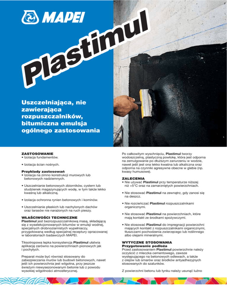l u m i t s a l P Uszczelniająca, nie zawierająca rozpuszczalników, bitumiczna emulsja ogólnego zastosowania ZASTOSOWANIE • Izolacja fundamentów. • Izolacja ścian nośnych. Przykłady zastosowań • Izolacja na zimno konstrukcji murowych lub betonowych nadziemnych. • Uszczelnianie betonowych zbiorników, cystern lub studzienek magazynujących wodę, w tym także lekko kwaśną lub alkaliczną. Po całkowitym wyschnięciu, Plastimul tworzy wodoszczelną, plastyczną powłokę, która jest odporna na zemulgowanie po dłuższym zanurzeniu w wodzie, nawet jeśli jest ona lekko kwaśna lub alkaliczna oraz odporna na czynniki agresywne obecne w glebie (np. kwasy humusowe). ZALECENIA • Nie używać Plastimul przy temperaturze niższej niż +5°C oraz na zamarzniętych powierzchniach. • Nie stosować Plastimul na zewnątrz, gdy zanosi się na deszcz. • Izolacja ochronna rynien betonowych i kominów. • Uszczelnianie płaskich lub nachylonych dachów oraz tarasów nie narażonych na ruch pieszy. WŁAŚCIWOŚCI TECHNICZNE Plastimul jest bezrozpuszczalnikową masą, składającą się z wyselekcjonowanych bitumów w emulsji wodnej, specjalnych drobnoziarnistych wypełniaczy, przygotowaną według specjalnej receptury opracowanej w laboratoriach badawczych MAPEI. Tiksotropowa lepka konsystencja Plastimul ułatwia aplikację zarówno na powierzchniach pionowych jak i pochyłych. Preparat może być również stosowany do zabezpieczania murów lub budowli betonowych, nawet jeśli ich powierzchnia jest wilgotna, przy jeszcze świeżym niewysezonowanym betonie lub z powodu wysokiej wilgotności atmosferycznej. • Nie rozcieńczać Plastimul rozpuszczalnikami organicznymi. • Nie stosować Plastimul na powierzchniach, które mają kontakt ze środkami spożywczymi. • Nie stosować Plastimul do impregnacji powierzchni mających kontakt z rozpuszczalnikami organicznymi, tłuszczami pochodzenia zwierzęcego lub roślinnego albo olejami mineralnymi. WYTYCZNE STOSOWANIA Przygotowanie podłoża Przed zastosowaniem Plastimul powierzchnie należy oczyścić z mleczka cementowego, zawsze występującego na betonowych odlewach, a także z olejów lub smarów oraz środków antyadhezyjnych stosowanych do szalunków. Z powierzchni betonu lub tynku należy usunąć luźno [sche3] 323_plastimul_pl (22.10.2008 - 4ª Bozza/Ciano/PDF) l u im t s Pla DANE TECHNICZNE (wartości typowe) WŁAŚCIWOŚCI PRODUKTU Konsystencja: gęsta pasta Kolor: czarny Gęstość objętościowa (kg/dm3): 1,20 pH: 10 Lepkość Brookfield’a (mPa•s): 250.000 (wirnik D - 2,5 obrotów) Zawartość suchej substancji (%): 75 Palność: nie Przechowywanie: 24 miesiące w oryginalnym opakowaniu, chronić przed mrozem Szkodliwość wg dyrektyw 1999/45/EC: brak. Przed zastosowaniem należy zapoznać się z paragrafem “Środki ostrożności i bezpieczeństwa” oraz informacjami podanymi na opakowaniu, a także w karcie charakterystyki substancji niebezpiecznej Kod celny: 2715 00 00 IMPREGNACJA POWIERZCHNI POZIOMYCH NIE PRZEZNACZONYCH DO RUCHU PIESZEGO Pierwsza warstwa (podkład). Proporcje mieszania rozcieńczyć Plastimul wodą w ilości 45-50% Czas schnięcia: 3-6 godzin Druga warstwa z uzbrojeniem, grubość 3 mm, proporcje mieszania: nie rozcieńczony Plastimul Minimalna temperatura stosowania: +5°C WŁAŚCIWOŚCI KOŃCOWE Odporność na starzenie: doskonała Odporność na rozcieńczone kwasy i zasady: doskonała Odporność na spryskiwanie wodą w +23°C: po 6 godzinach od aplikacji związane części. Pęknięcia powinny być uszczelnione, a widoczne na powierzchni wady naprawione preparatami Planitop 400 lub innymi produktami z linii Mapegrout. Powierzchnie poziome (np. tarasy) muszą mieć spadek nie mniejszy niż 1%, aby umożliwić odpływ wody do rynien. Zarówno podłoże jak i otoczenie powinny mieć temperaturę nie niższą niż +5°C. Plastimul można stosować w oryginalnym stężeniu albo rozcieńczyć wodą, zależnie od zastosowania. Należy uważnie przeczytać instrukcje stosowania, podane poniżej. IZOLACJA POWIERZCHNI PIONOWYCH (np. fundamentów lub ścian nośnych) Zwilżyć powierzchnię przeznaczoną do impregnacji, a następnie przystąpić do aplikacji Plastimul w dwóch następujących po sobie warstwach, w poniższy sposób: • Pierwsza warstwa (gruntowanie) Rozcieńczyć Plastimul dodatkiem 45 do 50% wody i wymieszać do uzyskania jednolitej mieszanki. Pokryć podłoże rozcieńczonym preparatem Plastimul używając pędzla. Drugą warstwę można nałożyć dopiero wtedy, gdy pierwsza warstwa całkiem wyschnie, po upływie 3-6 godzin, w zależności od temperatury i wentylacji. • Druga warstwa Starannie rozprowadzić nie rozcieńczony Plastimul packą lub pędzlem, aby uzyskać warstwę o minimalnej grubości około 1 mm. IZOLACJA POWIERZCHNI POZIOMYCH NIE PRZEZNACZONYCH DO RUCHU PIESZEGO Powierzchnię przeznaczoną do impregnacji należy zwilżyć, a następnie pokryć ją dwiema warstwami Plastimul, w następujący sposób: • Pierwsza warstwa (gruntowanie) Rozcieńczyć Plastimul dodatkiem 45 do 50% wody i wymieszać, do uzyskania jednolitej mieszanki. Powierzchnię pokryć rozcieńczonym preparatem przy pomocy pędzla. Drugą warstwę można nakładać dopiero wtedy, gdy pierwsza warstwa całkiem wyschnie (po upływie 3-6 godzin). • Druga warstwa Starannie rozprowadzić packą warstwę nie rozcieńczonego preparatu Plastimul o grubości około 2 mm a następnie, gdy jest jeszcze świeża, umieścić w niej siatkę z włókna szklanego lub włókninę, o niskiej gramaturze, aby zwiększyć mechaniczną wytrzymałość powłoki. Takie wzmocnienie zalecane jest szczególnie wówczas, gdy w podłożu występują pęknięcia. Następnie starannie nałożyć kolejną warstwę Plastimul o grubość około 1 mm i posypać ją obficie piaskiem o granulacji do 1 mm, gdy jest jeszcze mokra. Po całkowitym wyschnięciu, na wodoszczelną powierzchnię wykonaną z Plastimul można wchodzić ty