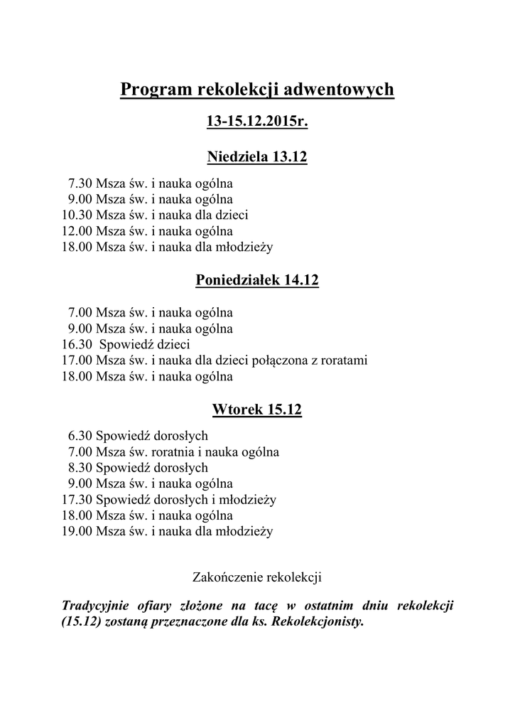 Program rekolekcji adwentowych 13-15.12.2015r. Niedziela 13.12 7.30 Msza św. i nauka ogólna 9.00 Msza św. i nauka ogólna 10.30 Msza św. i nauka dla dzieci 12.00 Msza św. i nauka ogólna 18.00 Msza św. i nauka dla młodzieży Poniedziałek 14.12 7.00 Msza św. i nauka ogólna 9.00 Msza św. i nauka ogólna 16.30 Spowiedź dzieci 17.00 Msza św. i nauka dla dzieci połączona z roratami 18.00 Msza św. i nauka ogólna Wtorek 15.12 6.30 Spowiedź dorosłych 7.00 Msza św. roratnia i nauka ogólna 8.30 Spowiedź dorosłych 9.00 Msza św. i nauka ogólna 17.30 Spowiedź dorosłych i młodzieży 18.00 Msza św. i nauka ogólna 19.00 Msza św. i nauka dla młodzieży Zakończenie rekolekcji Tradycyjnie ofiary złożone na tacę w ostatnim dniu rekolekcji (15.12) zostaną przeznaczone dla ks. Rekolekcjonisty.