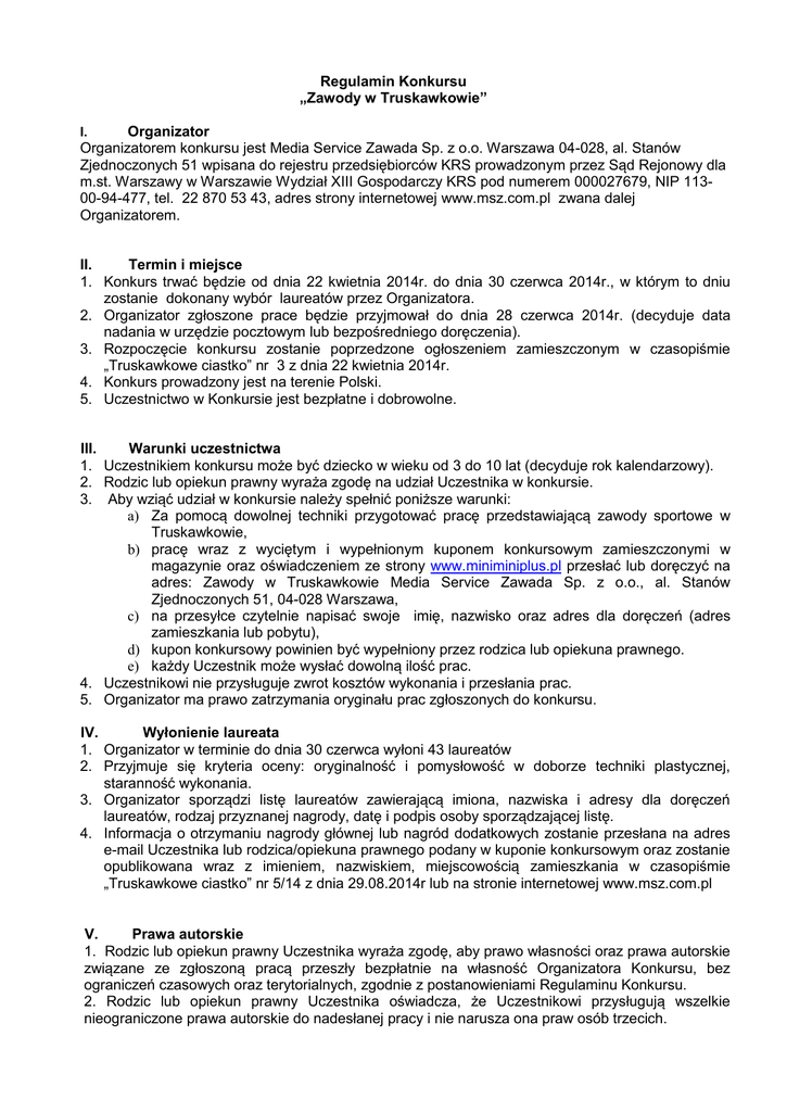 Regulamin Konkursu „Zawody w Truskawkowie” Organizator Organizatorem konkursu jest Media Service Zawada Sp. z o.o. Warszawa 04-028, al. Stanów Zjednoczonych 51 wpisana do rejestru przedsiębiorców KRS prowadzonym przez Sąd Rejonowy dla m.st. Warszawy w Warszawie Wydział XIII Gospodarczy KRS pod numerem 000027679, NIP 11300-94-477, tel. 22 870 53 43, adres strony internetowej www.msz.com.pl zwana dalej Organizatorem. I. II. Termin i miejsce 1. Konkurs trwać będzie od dnia 22 kwietnia 2014r. do dnia 30 czerwca 2014r., w którym to dniu zostanie dokonany wybór laureatów przez Organizatora. 2. Organizator zgłoszone prace będzie przyjmował do dnia 28 czerwca 2014r. (decyduje data nadania w urzędzie pocztowym lub bezpośredniego doręczenia). 3. Rozpoczęcie konkursu zostanie poprzedzone ogłoszeniem zamieszczonym w czasopiśmie „Truskawkowe ciastko” nr 3 z dnia 22 kwietnia 2014r. 4. Konkurs prowadzony jest na terenie Polski. 5. Uczestnictwo w Konkursie jest bezpłatne i dobrowolne. III. Warunki uczestnictwa 1. Uczestnikiem konkursu może być dziecko w wieku od 3 do 10 lat (decyduje rok kalendarzowy). 2. Rodzic lub opiekun prawny wyraża zgodę na udział Uczestnika w konkursie. 3. Aby wziąć udział w konkursie należy spełnić poniższe warunki: a) Za pomocą dowolnej techniki przygotować pracę przedstawiającą zawody sportowe w Truskawkowie, b) pracę wraz z wyciętym i wypełnionym kuponem konkursowym zamieszczonymi w magazynie oraz oświadczeniem ze strony www.miniminiplus.pl przesłać lub doręczyć na adres: Zawody w Truskawkowie Media Service Zawada Sp. z o.o., al. Stanów Zjednoczonych 51, 04-028 Warszawa, c) na przesyłce czytelnie napisać swoje imię, nazwisko oraz adres dla doręczeń (adres zamieszkania lub pobytu), d) kupon konkursowy powinien być wypełniony przez rodzica lub opiekuna prawnego. e) każdy Uczestnik może wysłać dowolną ilość prac. 4. Uczestnikowi nie przysługuje zwrot kosztów wykonania i przesłania prac. 5. Organizator ma prawo zatrzymania oryginału prac zgłoszonych do konkursu. IV. Wyłonienie laureata 1. Organizator w terminie do dnia 30 czerwca wyłoni 43 laureatów 2. Przyjmuje się kryteria oceny: oryginalność i pomysłowość w doborze techniki plastycznej, staranność wykonania. 3. Organizator sporządzi listę laureatów zawierającą imiona, nazwiska i adresy dla doręczeń laureatów, rodzaj przyznanej nagrody, datę i podpis osoby sporządzającej listę. 4. Informacja o otrzymaniu nagrody głównej lub nagród dodatkowych zostanie przesłana na adres e-mail Uczestnika lub rodzica/opiekuna prawnego podany w kuponie konkursowym oraz zostanie opublikowana wraz z imieniem, nazwiskiem, miejscowością zamieszkania w czasopiśmie „Truskawkowe ciastko” nr 5/14 z dnia 29.08.2014r lub na stronie internetowej www.msz.com.pl V. Prawa autorskie 1. Rodzic lub opiekun prawny Uczestnika wyraża zgodę, aby prawo własności oraz prawa autorskie związane ze zgłoszoną pracą przeszły bezpłatnie na własność Organizatora Konkursu, bez ograniczeń czasowych oraz terytorialnych, zgodnie z postanowieniami Regulaminu Konkursu. 2. Rodzic lub opiekun prawny Uczestnika oświadcza, że Uczestnikowi przysługują wszelkie nieograniczone prawa autorskie do nadesłanej pracy i nie narusza ona praw osób trzecich. 3. Rodzic lub opiekun prawny Uczestnika przenosi na Organizatora - nieodpłatnie na czas nieoznaczony – autorskie prawa majątkowe do nadesłanej pracy na wszelkich polach eksploatacji w szczególności wymienionych w art. 50 ustawy z dnia 4 lutego 1994 r. o prawie autorskim i prawach pokrewnych (Dz. U. z 2006r. Nr 90, poz. 631 z późn. zm.), w tym m.in. do: utrwalenia, powielenia, rozpowszechnia , publikowania na stronach internetowych oraz w innych publikacjach wydawanych przez Organizatora we wszystkich technikach znanych w dniu złożenia oświadczenia – uprawnienie to dotyczy wielokrotnego publikowania i nie jest ograniczone w czasie i co do terytorium. Przeniesienie praw autorskich następuje w dniu wyłonienia laureatów. VI. Nagrody 1. Laureaci konkursu otrzymają nagrody w postaci: a) 1 voucher na 4-dniowy pobyt rodzinny na Mazurach ufundowany przez firmę Goldberry Mariola Kiwak Sp. z o.o. o wartości jednostkowej 700 zł brutto,* b) 1 tablet SmartKid ufundowany przez firmę LARK Sp. z o.o. o wartości jednostkowej 300 zł brutto, c) 2 zestawy LEGO Friends 41039 ufundowane przez firmę LEGO Polska Sp. z o.o. o wartości jednostkowej 130 zł brutto, d) 2 zestawy LEGO Disney Princess 41052 ufundowane przez firmę LEGO Polska Sp. z o.o. o wartości jednostkowej 130 zł brutto, e) 3 zegarki Flik Flak ufundowane przez firmę The Swatch Group Company SP. z o.o. o wartości jednostkowej 160 zł brutto, f) 3 lalki Lalaloopsy ufundowane przez firmę MGA Entertainment SP. z o.o. o wartości jednostkowej 100 zł brutto, g) 6 zestawów Zelfs ufundowanych przez firmę Epee Polska Sp. z o.o. o wartości jednostkowej 50 zł brutto, h) 5 lalek Pinypon ufundowanych przez firmę TM Toys Sp. zo.o. o wartości jednostkowej 40 zł brutto, i) 20 płyt „Niezwykłe lekcje rytmiki” ufundowane przez firmę AJ Music Managment o wartości jednostkowej 30 zł brutto. 2. Nagroda nie może zostać zamieniona na ekwiwalent pieniężny lub inną rzeczową. 3. Jeden Uczestnik może otrzymać tylko jedną nagrodę. 4. Laureat nie ponosi jakichkolwiek opłat z tytułu otrzymania nagrody, w tym kosztów doręczenia lub podatków. 5. Odbiór nagrody: nagroda zostanie przesłana pocztą – listem poleconym w terminie 6 tygodni od daty opublikowania listy laureatów w numerze 5/2014 z dnia 29.08.2014 na podany adres dla doręczeń. VII. Reklamacje 1. Każdemu Uczestnikowi przysługuje prawo wniesienia reklamacji związanej z niniejszym Konkursem w terminie do 15 dni roboczych po zakończeniu konkursu. 2. Reklamacje należy zgłaszać na adres Organizatora. 3. Zainteresowani, zostaną powiadomieni o rozpatrzeniu reklamacji w ciągu 14 dni 