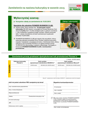 Zamówienie na nasiona kukurydzy w sezonie 2015 Wykorzystaj szansę: Zakup i skorzystaj Korzystne rabaty za zamówienie do 15.03.2015 Specjalnie dla członków PIONEER BUSINESS CLUB: Każda osoba, która zamówi min. 10 jednostek nasion kukurydzy (80.000 nasion) i przystąpi do Pioneer Bussines Club otrzyma kurtkę 3 w 1. Kurtka dostępna tylko w jednym rozmiarze L, bez możliwości uzyskania innego rozmiaru. Można otrzymać tylko 1 sztukę niezależnie od ilości zamówionych opakowań powyżej 10 jednostek. PIONEER BUSINESS CLUB jest otwarty dla wszystkich, którzy dokonują zakupów produktów firmy Pioneer (nasiona kukurydzy, rzepaku i inokulanty i przystąpią do klubu). Członkowie klubu, którzy zakupią w 2015 produkty Pioneer’a za ogólną wartość ponad 10.000,00 PLN skorzystają z systemu rabatowego. Szczegóły w broszurze PIONEER BUSINESS CLUB u komisantów i promotorów. . Zamόwienie proszę przekazać dystrybutorowi lub promotorowi Pioneer‘a (1 worek = 80.000 nasion) Kukurydza Odmiana kukurydzy Pioneer‘a Ilość worków zaprawionych standardowo MAXIM XL® 80.000 nasion BIG BAG (36 x 80.000 nasion) Ilość worków zaprawionych dodatkowo Mesurol® 80.000 nasion BIG BAG (36 x 80.000 nasion) Mesurol® - zarejestrowane marki firmy Bayer. MAXIM XL® - zarejestrowana marka firmy Syngenta. Jeśli nie jesteś członkiem PBC-zarejestruj się teraz! Wypełnia komisant/promotor Imię i nazwisko/nazwa gospodarstwa Nr komisanta Ulica, nr domu/mieszkania Imię i nazwisko Miejscowość/poczta Data i podpis Telefon Powierzchnia kukurydzy w ha Nr konta bankowego NIP Tak, chcę zostać członkiem PIONEER BUSINESS CLUB. Wyrażam zgodę na przechowywanie i przetwarzanie moich danych osobowych przez firmę Pioneer na potrzeby PIONEER BUSINESS CLUB Deklarowany termin zapłaty:_________________ Data i podpis zamawiającego Charakterystyka odmian Bardzo dobra Dobra Średnia Deklaracja zgody Deklaracja zgody: Przekazując dane osobowe firmie DuPont Pioneer, wyrażam zgodę na powyższe warunki. Przekazując dane osobowe, wyrażam zgodę na przesyłanie mi komunikatów marketingowych przez DuPont Pioneer za pomocą następujących środków komunikacji elektronicznych, w odniesieniu do których wyrażam zgodę, poprzez umieszczenie znaku „x” w określonych polach: list Data e-mail faks ( proszę zaznaczyć „x” środki komunikacji elektronicznej, którą Państwo akceptują ). Podpis Powiadomienie dot. ochrony prywatności Twoja prywatność jest dla nas ważne.Zbierane przez nas informacje umożliwiają identyfikację Państwa biznesowych zainteresowań, oferowanie Państwu produktów i usług jednoczesnie zapwniając Państwu odpowiednie komfort w toku kontaktów biznesowych. Państwa dane osobowe (imię i nazwisko, adres e-mail, numer telefonu i inne informacje Dane Osobowe) będą przechowywane w wybranych miejscach znajdujących się przede wszystkim na terytorium Stanów Zjednoczonych. We wspomnianych wyżej celach informacje te mogą być wykorzystywane przez firmę DuPont, jej podmioty powiazane, jej partnerów oraz wybranye osóby trzecie w innych krajach. Aby uzyskać dostęp do swoich danych osobowych, w celu ich zmieny, usunięcia albo wyrażenia sprzeciwu w ich przetwarzaniu, należy skorzystać z tego przekierowania www.pioneer.com/pl Pioneer Hi-Bred Northern Europe Sales Division GmbH, Oddział w Polsce ul. Wybieg 6, 61-315 Poznań, tel. +48 61 816 20 68, fax +48 61 657 19 51 www.pioneer.com/poland Owalne logo DuPont jest zarejestrowanym znakiem towarowym Firmy DuPont. ®, TM, SM Znaki towarowe i znaki serwisowe Firmy Pioneer. © 2014 PHII