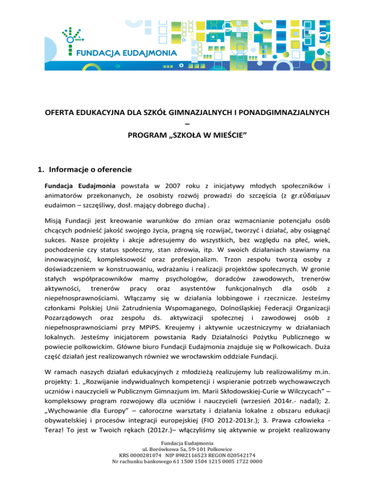 OFERTA EDUKACYJNA DLA SZKÓŁ GIMNAZJALNYCH I PONADGIMNAZJALNYCH – PROGRAM „SZKOŁA W MIEŚCIE” 1. Informacje o oferencie Fundacja Eudajmonia powstała w 2007 roku z inicjatywy młodych społeczników i animatorów przekonanych, że osobisty rozwój prowadzi do szczęścia (z gr.εὐδαίμων eudaimon – szczęśliwy, dosł. mający dobrego ducha) . Misją Fundacji jest kreowanie warunków do zmian oraz wzmacnianie potencjału osób chcących podnieść jakość swojego życia, pragną się rozwijać, tworzyć i działać, aby osiągnąć sukces. Nasze projekty i akcje adresujemy do wszystkich, bez względu na płeć, wiek, pochodzenie czy status społeczny, stan zdrowia, itp. W swoich działaniach stawiamy na innowacyjność, kompleksowość oraz profesjonalizm. Trzon zespołu tworzą osoby z doświadczeniem w konstruowaniu, wdrażaniu i realizacji projektów społecznych. W gronie stałych współpracowników mamy psychologów, doradców zawodowych, trenerów aktywności, trenerów pracy oraz asystentów funkcjonalnych dla osób z niepełnosprawnościami. Włączamy się w działania lobbingowe i rzecznicze. Jesteśmy członkami Polskiej Unii Zatrudnienia Wspomaganego, Dolnośląskiej Federacji Organizacji Pozarządowych oraz zespołu ds. aktywizacji społecznej i zawodowej osób z niepełnosprawnościami przy MPiPS. Kreujemy i aktywnie uczestniczymy w działaniach lokalnych. Jesteśmy inicjatorem powstania Rady Działalności Pożytku Publicznego w powiecie polkowickim. Główne biuro Fundacji Eudajmonia znajduje się w Polkowicach. Duża część działań jest realizowanych również we wrocławskim oddziale Fundacji. W ramach naszych działań edukacyjnych z młodzieżą realizujemy lub realizowaliśmy m.in. projekty: 1. „Rozwijanie indywidualnych kompetencji i wspieranie potrzeb wychowawczych uczniów i nauczycieli w Publicznym Gimnazjum im. Marii Skłodowskiej-Curie w Wilczycach” – kompleksowy program rozwojowy dla uczniów i nauczycieli (wrzesień 2014r.- nadal); 2. „Wychowanie dla Europy” – całoroczne warsztaty i działania lokalne z obszaru edukacji obywatelskiej i procesów integracji europejskiej (FIO 2012-2013r.); 3. Prawa człowieka Teraz! To jest w Twoich rękach (2012r.)– włączyliśmy się aktywnie w projekt realizowany Fundacja Eudajmonia ul. Borówkowa 5a, 59-101 Polkowice KRS 0000281074 NIP 8982116523 REGON 020542174 Nr rachunku bankowego 61 1500 1504 1215 0005 1722 0000 przez Amnesty International; 4. „Do pracy – gotowi – start I i II” (2011-2012) – warsztaty umiejętności interpersonalnych, z zakresu zarządzania codziennością dla mieszkańców placówki resocjalizacyjnej „Skarbek” w Polkowicach; 5. „Bądź bliżej!” (2009r.) – warsztaty dla szkól ponadgimnazjalnych z zakresu wolontariatu na rzecz osób z niepełnosprawnościami. Więcej informacji na temat Fundacji Eudajmonia na stronie: www.eudajmonia.pl Rozpoczęliśmy również (w formie wolontariatu) realizację warsztatów pod wspólnym tytułem „Oswoić nieznane” we wrocławskich placówkach oświatowych (Zespół Szkół nr 25 oraz Przedszkole nr 94). Warsztaty w pięciu grupach ponadgimnazjalnych zostały przeprowadzone na podstawie programu, jakie prezentujemy poniżej i zostały bardzo dobrze ocenione przez uczestników i pedagogów (w załączeniu referencje). 2. Oferta edukacyjna Niepełnosprawność nadal stosunkowo często jest powodem bezpośredniej i pośredniej dyskryminacji oraz wykluczania osób z dysfunkcjami z wielu obszarów życia społecznego. Postawy społeczeństwa w stosunku do osób z różnego rodzaju dysfunkcjami sensorycznymi, fizycznymi, psychicznymi, czy intelektualnymi bardzo często wahają się od lęku i wynikającego z niego dystansowania się, a nawet odtrącenia po litość i współczucie, jaką wywołują osoby w naszym przekonaniu słabsze, mniej zaradne życiowo. Dzieje się tak, dlatego, że ciągle jeszcze w naszych relacjach z osobami o innym wyglądzie czy sposobie funkcjonowania kierujemy się stereotypami, uprzedzeniami i brakiem pewności co do tego, jak należy się zachować. Przyczyną dyskryminacji i uprzedzeń wobec osób niepełnosprawnych często jest niewiedza. Zmiana tej sytuacji – włączenie osób niepełnosprawnych w życie społeczne, budowanie relacji opartych na wzajemnej otwartości, zależy więc również od edukacji dzieci i młodzieży w zakresie tego jak funkcjonują osoby niepełnosprawne i jakie są ich rzeczywiste potrzeby. Wykorzystując nasze doświadczenie w zakresie wsparcia osób z niepełnosprawnościami, chcemy zaoferować uczniom szkół gimnazjalnych i ponadgimnazjalnych warsztaty, podczas których zdobędą wiedzę i podstawowe umiejętności w zakresie porozumiewania się i współpracy z osobami z różnym rodzajem niepełnosprawności; identyfikowania i pokonywania barier, z jakimi się borykają; poznania zasad savoir – vivre wobec osób z dysfunkcjami. Warsztaty będą realizowane z wykorzystaniem metod aktywizujących, w tym symulacji różnych niepełnosprawności, odgrywania ról i pracy w grupie. Współprowadzącymi zajęcia będę osoby z różnymi niepełnosprawnościami (osoba niewidoma, niesłysząca, z Fundacja Eudajmonia ul. Borówkowa 5a, 59-101 Polkowice KRS 0000281074 NIP 8982116523 REGON 020542174 Nr rachunku bankowego 61 1500 1504 1215 0005 1722 0000 niepełnosprawnością ruchową i intelektualną), co pozwoli na bezpośredni kontakt obu stron oraz na przełamywanie wzajemnych barier i uprzedzeń. Oferowane przez nas warsztaty wpisują się w podstawę programową przedmiotu Wiedza o społeczeństwie dla szkół gimnazjalnych i ponadgimnazjalnych. Zgodnie z zaleconymi warunkami i sposobami realizacji podstawy programowej z tego przedmiotu, zajęcia z wiedzy o społeczeństwie mają kształtować u uczniów m.in. zaangażowanie w działania obywatelskie, wrażliwość społeczną, odpowiedzialność oraz tolerancję. W ramach tego przedmiotu powinno si