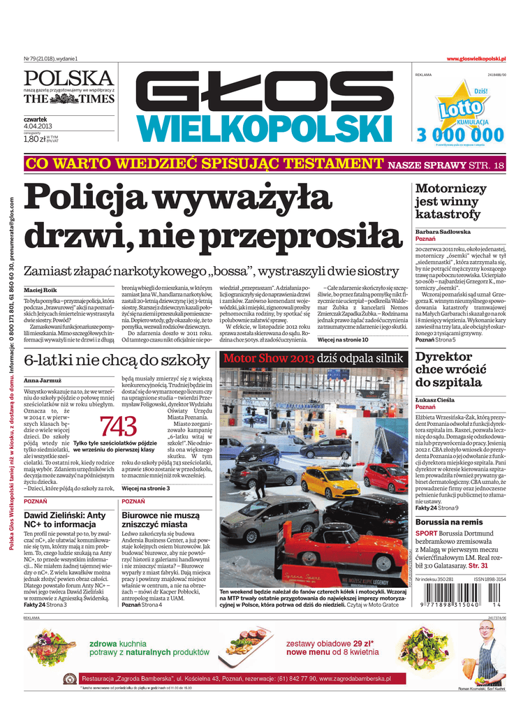 Nr79(21.018),wydanie1 www.gloswielkopolski.pl REKLAMA 2418488/00 czwartek 4.04.2013 cena gazety TYM 1,80zł W8%VAT Policjawyważyła drzwi,nieprzeprosiła Motorniczy jest winny katastrofy Barbara Sadłowska Poznań 20czerwca2011roku,okołojedenastej, motorniczy „ósemki” wjechał w tył „siedemnastki” , która zatrzymała się, by nie potrącić mężczyzny koszącego trawęnapoboczutorowiska.Ucierpiało 50 osób – najbardziej Grzegorz K., motorniczy „ósemki”. Wczoraj poznański sąd uznał GrzegorzaK.winnymnieumyślnegospowodowania katastrofy tramwajowej naMałychGarbarachiskazałgonarok i8miesięcywięzienia.Wykonaniekary zawiesiłnatrzylata,aleobciążyłoskarżonego 2 tysiącami grzywny. Zamiastzłapaćnarkotykowego„bossa”,wystraszylidwiesiostry Maciej Roik Tobyłapomyłka–przyznajepolicja,która podczas„brawurowej”akcjinapoznańskich Jeżycach śmiertelnie wystraszyła dwiesiostry.Powód? Zamaskowanifunkcjonariuszepomylilimieszkania.Mimoszczegółowychinformacji wyważyli nie te drzwi i z długą broniąwbieglidomieszkania,wktórym zamiastJanaW.,handlarzanarkotyków, zastali20-letniądziewczynęijej3-letnią siostrę.Starszejzdziewczynkazalipołożyćsięnaziemiiprzeszukalipomieszczenia.Dopierowtedy,gdyokazałosię,żeto pomyłka,wezwalirodzicówdziewczyn. Do zdarzenia doszło w 2011 roku. Odtamtegoczasuniktoficjalnieniepo- 6-latki nie chcą do szkoły będą musiały zmierzyć się z większą konkurencyjnością.Trudniejbędzieim Wszystko wskazuje na to, że we wrześ- dostaćsiędowymarzonegoliceumczy niu do szkoły pójdzie o połowę mniej na upragnione studia – twierdzi Przesześciolatków niż w roku ubiegłym. mysławFoligowski,dyrektorWydziału Oznacza to, że Oświaty Urzędu w 2014 r. w pierwMiasta Poznania. szych klasach bęMiasto zorganidzie o wiele więcej zowało kampanię dzieci. Do szkoły „6-latku witaj w pójdą wtedy nie Tylko tyle sześciolatków pójdzie szkole!”.Nieodniotylko siedmiolatki, we wrześniu do pierwszej klasy sła ona większego ale iwszystkie sześskutku. W tym ciolatki. To ostatni rok, kiedy rodzice roku do szkoły pójdą 743 sześciolatki, mają wybór. Zdaniem urzędników ich a prawie 1800 zostanie w przedszkolu, decyzjamożezaważyćnapóźniejszym to znacznie mniej niż rok wcześniej. życiu dziecka. – Dzieci, które pójdą do szkoły za rok, Więcej na stronie 3 Anna Jarmuż wiedział„przepraszam”.Adziałaniapolicjiograniczyłysiędonaprawieniadrzwi i zamków. Zarówno komendant wojewódzki,jakimiejski,zignorowaliprośby pełnomocnika rodziny, by spotkać się ipolubowniezałatwićsprawę. W efekcie, w listopadzie 2012 roku sprawazostałaskierowanadosądu.Rodzinachce50tys.złzadośćuczynienia. –Całezdarzenieskończyłosięszczęśliwie,boprzezfatalnąpomyłkęniktfizycznienieucierpiał–podkreślaWaldemar Żubka z kancelarii Nomos ZmierczakZapadkaŻubka.– Rodzinama jednak prawo żądać zadośćuczynienia zatraumatycznezdarzenieijegoskutki. Poznań Strona 5 Więcej na stronie 10 Motor Show 2013 dziś odpala silnik Dyrektor chce wrócić do szpitala Łukasz Cieśla Poznań 743 POZNAŃ POZNAŃ Dawid Zieliński: Anty NC+ to informacja Biurowce nie muszą zniszczyć miasta Ten profil nie powstał po to, by zwalczać nC+, ale ułatwiać komunikowanie się tym, którzy mają z nim problem. To, czego ludzie szukają na Anty NC+, to przede wszystkim informacji... Nie miałem żadnej tajemnej wiedzy o nC+. Z wielu kawałków można jednak złożyć pewien obraz całości. Dlatego powstało forum Anty NC+ – mówi jego twórca Dawid Zieliński w rozmowie z Agnieszką Świderską. Ledwo zakończyła się budowa Andersia Business Center, a już powstaje kolejnych osiem biurowców. Jak budować biurowce, aby nie powtórzyć historii z galeriami handlowymi i nie zniszczyć miasta? – Biurowce wyparły z miast fabryki. Dają miejsca pracy i powinny znajdować miejsce właśnie w centrum, a nie na obrzeżach – mówi dr Kacper Pobłocki, antropolog miasta z UAM. Fakty 24 Strona 3 REKLAMA Poznań Strona 4 Elżbieta Wrzesińska-Żak, którą prezydentPoznaniaodwołałzfunkcjidyrektora szpitala im. Raszei, pozwała lecznicędosądu.Domagasięodszkodowania lub przywrócenia dopracy. Jesienią 2012 r. CBA złożyło wniosek do prezydentaPoznaniaojejodwołaniezfunkcji dyrektora miejskiego szpitala. Pani dyrektor w okresie kierowania szpitalem prowadziła również prywatny gabinet dermatologiczny. CBA uznało, że prowadzenie firmy oraz jednoczesne pełnienie funkcji publicznej to złamanie ustawy. Fakty 24 Strona 9 Borussia na remis SPORT Borussia Dortmund FOT.GRZEGORZDEMIŃSKI Polska Głos Wielkopolski taniej niż w kiosku, z dostawą do domu. Informacje: 0 800 171 801, 61 860 60 30, [email protected] CO WARTO WIEDZIEĆ SPISUJĄC TESTAMENT NASZE SPRAWY STR. 18 bezbramkowo zremisowała z Malagą w pierwszym meczu ćwierćfinałowym LM. Real rozbił 3:0 Galatasaray. Str. 31 Nr indeksu 350 281 ISSN 1898-3154 Ten weekend będzie należał do fanów czterech kółek i motocykli. Wczoraj na MTP trwały ostatnie przygotowania do największej imprezy motoryzacyjnej w Polsce, która potrwa od dziś do niedzieli. Czytaj w Moto Gratce 2417374/00 Pogoda więcej str. 20 maks. 8°C min. 5°C 4.04.2013 Imieniny: Anastazji, Szymona,Tadeusza Powódź? Nie ma zagrożenia Dzisiaj szóstoklasiści sprawdzą swoją wiedzę Mimo kalendarzowej wiosny śnieg zalega na ulicach i polach. Już wkrótce, wraz z wyczekiwanym podwyższeniem temperatur, spłynie do Warty. Czy grozi nam powódź? W obecnej sytuacji stan wody w Warcie, według nomenklatury meteorologicznej, jest w strefie stanów średnich. Wzrasta, ale Wielkopolanom nie grozi powódź. Możliwość gwałtownego przyboru wód oceniana jest jako niska. Czy mogą wystąpić lokalne podtopienia? Te są możliwe w przypadku gwałtownego ocieplenia. Uspokajam jednak, że według dzisiejszej prognozy pogody nie przewiduje się szybkiego wzrostu temperatur. Jak wygląda sytuacja w po