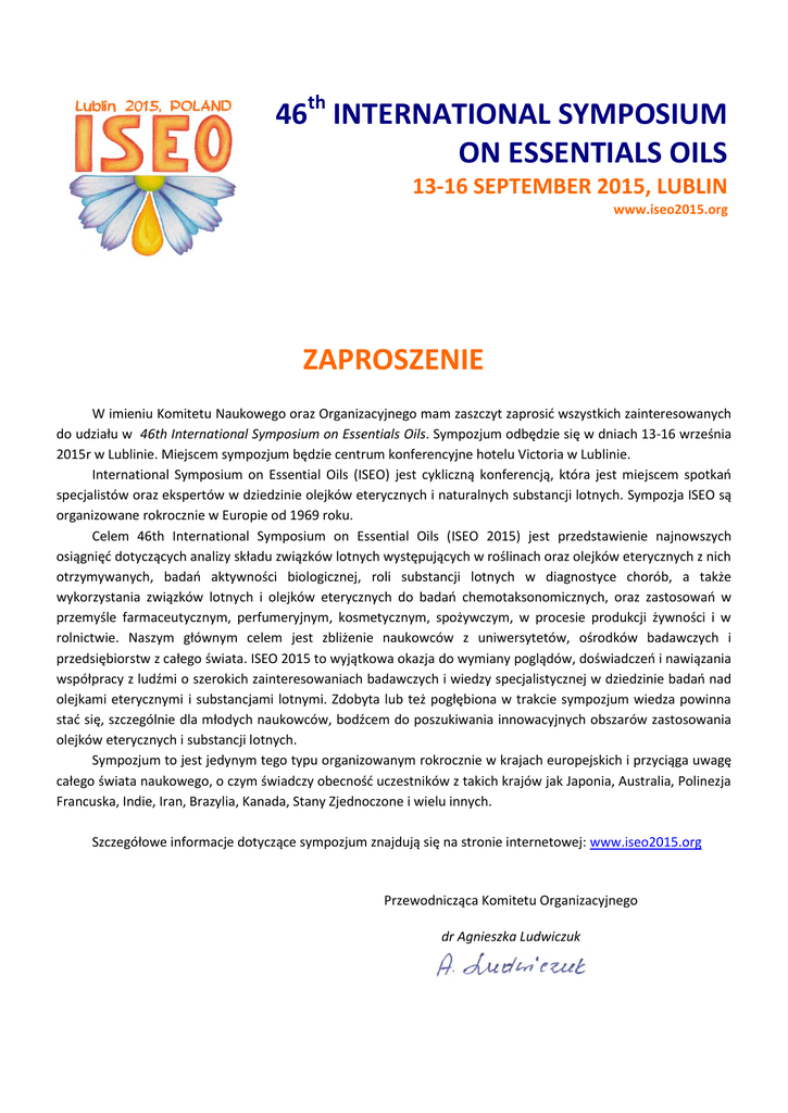 46th INTERNATIONAL SYMPOSIUM ON ESSENTIALS OILS 13-16 SEPTEMBER 2015, LUBLIN www.iseo2015.org ZAPROSZENIE W imieniu Komitetu Naukowego oraz Organizacyjnego mam zaszczyt zaprosić wszystkich zainteresowanych do udziału w 46th International Symposium on Essentials Oils. Sympozjum odbędzie się w dniach 13-16 września 2015r w Lublinie. Miejscem sympozjum będzie centrum konferencyjne hotelu Victoria w Lublinie. International Symposium on Essential Oils (ISEO) jest cykliczną konferencją, która jest miejscem spotkań specjalistów oraz ekspertów w dziedzinie olejków eterycznych i naturalnych substancji lotnych. Sympozja ISEO są organizowane rokrocznie w Europie od 1969 roku. Celem 46th International Symposium on Essential Oils (ISEO 2015) jest przedstawienie najnowszych osiągnięć dotyczących analizy składu związków lotnych występujących w roślinach oraz olejków eterycznych z nich otrzymywanych, badań aktywności biologicznej, roli substancji lotnych w diagnostyce chorób, a także wykorzystania związków lotnych i olejków eterycznych do badań chemotaksonomicznych, oraz zastosowań w przemyśle farmaceutycznym, perfumeryjnym, kosmetycznym, spożywczym, w procesie produkcji żywności i w rolnictwie. Naszym głównym celem jest zbliżenie naukowców z uniwersytetów, ośrodków badawczych i przedsiębiorstw z całego świata. ISEO 2015 to wyjątkowa okazja do wymiany poglądów, doświadczeń i nawiązania współpracy z ludźmi o szerokich zainteresowaniach badawczych i wiedzy specjalistycznej w dziedzinie badań nad olejkami eterycznymi i substancjami lotnymi. Zdobyta lub też pogłębiona w trakcie sympozjum wiedza powinna stać się, szczególnie dla młodych naukowców, bodźcem do poszukiwania innowacyjnych obszarów zastosowania olejków eterycznych i substancji lotnych. Sympozjum to jest jedynym tego typu organizowanym rokrocznie w krajach europejskich i przyciąga uwagę całego świata naukowego, o czym świadczy obecność uczestników z takich krajów jak Japonia, Australia, Polinezja Francuska, Indie, Iran, Brazylia, Kanada, Stany Zjednoczone i wielu innych. Szczegółowe informacje dotyczące sympozjum znajdują się na stronie internetowej: www.iseo2015.org Przewodnicząca Komitetu Organizacyjnego dr Agnieszka Ludwiczuk Organizatorzy Uniwersytet Medyczny w Lublinie Katedra i Zakład Farmakognozji z Pracownią Roślin Leczniczych, Uniwersytet Medyczny w Lublinie Polska Akademia Nauk Komitet Organizacyjny Przewodnicząca: Agnieszka Ludwiczuk Sekretarz: Krystyna Skalicka-Woźniak Członkowie: Kazimierz Głowniak Tomasz Baj Magdalena Bartnik Aleksandra Józefczyk Małgorzata Kozyra Wirginia Kukuła-Koch Marek Kwietniewski Tomasz Mroczek Elwira Sieniawska Jarosław Widelski Grażyna Zgórka Stały Komitet Naukowy Yoshinori Asakawa (Tokushima, Japonia) Nicolas Baldovini (Nicea, Francja) K. Hüsnü Can Baser (Eskisehir, Turcja) Carlo Bicchi (Turyn, Włochy) Gerhard Buchbauer (Wiedeń, Austria) Alain Chaintreau (Genewa, Szwajcaria) Fatih Demirci (Eskisehir, Turcja) Jan Demyttenaere (Bruksela, Belgia) Ana Cristina Figueiredo (Lizbona, Portugalia) Chlodwig Franz (Wiedeń, Austria) Jan Karlsen (Oslo, Norwegia) Karl-Heinz Kubeczka (Margetshoechheim, Niemcy) Stanislaw Lochyński (Wrocław, Polska) Agnieszka Ludwiczuk (Lublin, Polska) Luigi Mondello (Mesyna, Włochy) Johannes Novak (Wiedeń, Austria) Patrizia Rubiolo (Turyn, Włochy) Hans Scheffer (Lejda, Holandia) Alvaro Viljoen (Pretoria, Republika Południowej Afryki) Éva Németh-Zámboriné (Budapeszt, Węgry) Harmonogram sympozjum 13 września (niedziela): Rejestracja uczestników; koktajl powitalny 14 września (poniedziałek): Sesje naukowe i pierwsza sesja posterowa; czas wolny 15 września (wtorek): Sesje naukowe i pierwsza sesja posterowa; uroczysta kolacja 16 września (środa): Sesje naukowe, Podsumowanie i zamknięcie Sympozjum, wycieczka WAŻNE DATY! 31 marzec 2015 25 maj 2015 30 czerwiec 2015 nadsyłanie streszczeń powiadomienie o przyjęciu abstraktów opłata rejestracyjna Język konferencji Oficjalnym językiem sympozjum jest język angielski Opłaty konferencyjne: Uczestnicy Studenci Osoby towarzyszące przed 30 czerwca 2015 350 EUR 250 EUR 130 EUR Po 30 czerwca 2015 400 EUR 300 EUR 150 EUR Opłata na miejscu 450 EUR 350 EUR 150 EUR opłata konferencyjna dla uczestników i studentów obejmuje: wstęp na wszystkie sesje naukowe drukowane materiały sympozjalne wraz z teczką koktajl powitalny przerwy kawowe obiady opłata konferencyjna dla osób towarzyszących obejmuje: koktajl powitalny obiady wycieczka w trakcie sympozjum DANE KONTAKTOWE Przewodnicząca: dr Agnieszka Ludwiczuk Sekretarz: dr Krystyna Skalicka-Wozniak Katedra i zakład Farmakognozji z Pracownią Roślin Leczniczych Uniwersytet Medyczny w Lublinie ul. Chodźki 1, 20-093 Lublin tel.: 81 7423710 faks: 81 7423809 e-mail: [email protected] Katedra i zakład Farmakognozji z Pracownią Roślin Leczniczych Uniwersytet Medyczny w Lublinie ul. Chodźki 1, 20-093 Lublin tel.: 81 7423807 faks: 81 7423809 e-mail: [email protected]