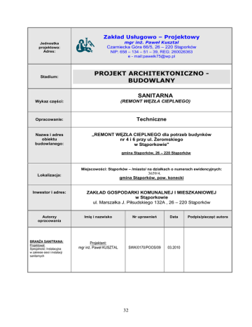 Zakład Usługowo – Projektowy mgr inż. Paweł Kusztal Jednostka projektowa: Adres: Czarniecka Góra 66/5, 26 – 220 Stąporków Stadium: PROJEKT ARCHITEKTONICZNO BUDOWLANY NIP: 658 – 134 – 51 – 39, REG: 260026363 e - mail:[email protected] SANITARNA (REMONT WĘZŁA CIEPLNEGO) Wykaz części: Opracowanie: Techniczne Nazwa i adres obiektu budowlanego: „REMONT WĘZŁA CIEPLNEGO dla potrzeb budynków nr 4 i 6 przy ul. Żeromskiego w Stąporkowie" gmina Stąporków, 26 – 220 Stąporków Miejscowości: Stąporków – /miasto/ na działkach o numerach ewidencyjnych: Lokalizacja: 3659/4. gmina Stąporków, pow. konecki Inwestor i adres: ZAKŁAD GOSPODARKI KOMUNALNEJ I MIESZKANIOWEJ w Stąporkowie ul. Marszałka J. Piłsudskiego 132A , 26 – 220 Stąporków Autorzy opracowania BRANŻA SANITRANA: Projektował: Specjalność: Instalacyjna w zakresie sieci i instalacji sanitarnych Imię i nazwisko Nr uprawnień Data Projektant: mgr inż. Paweł KUSZTAL SWK/0170/POOS/09 03.2010 32 Podpis/pieczęć autora OPIS TECHNICZNY DO„PROJEKTU ARCHIT. - BUDOWLANEGO” 1. PODSTAWA OPRACOWANIA: • • • • • • • umowa Nr 4/2009. z dnia 08.09.2009 r. zawarta pomiędzy ZGK i M z siedzibą przy ul. Marszałka J. Piłsudskiego 132A w Stąporkowie, a Zakładem Usługowo – Projektowym w Czarnieckiej Górze 66/5. wizja lokalna i pomiary terenowe, Projekt techniczny technologiczny węzła centralnego ogrzewania w budynku mieszkalnym przy ul. Konopnickiej 1, Osiedla Żeromskiego, aut. inż. J. Sienickiej, "TERMIX - Radom", czerwiec 1996 r. warunki techniczne Nr 12 z dnia 26.03.2010 r. wydane przez ZGK i M – Oddział Wodociągów i Kanalizacji w Stąporkowie, Ustawa z dnia 7.07.1994 r. Prawo budowlane tekst jedn. (Dz. U. z 2006 r., Nr 156, poz. 1118 z p. zm.), Rozporządzenie Ministra Infrastruktury z dnia 12 kwietnia 2002 r. w sprawie warunków technicznych, jakim powinny odpowiadać - budynki i ich usytuowanie tekst jedn. (Dz. U z 2002, Nr 75, poz. 690 z p. zm.) aktualnie obowiązujące polskie normy, europejskie, warunki techniczne, katalogi producentów, literatura techniczna – branżowa, 2. PRZEDMIOT I ZAKRES OPRACOWANIA: Przedmiot inwestycji objęty niniejszym opracowaniem, stanowi projekt pn. "Remontu węzła cieplnego dla budynków nr 4 i 6 przy ul. Żeromskiego w Stąporkowie". 3. ŹRÓDŁO CIEPŁA: Źródło ciepła dla potrzeb istniejącego węzła stanowi kotłownia gazowa (wbudowana), wysokotemperaturowa o mocy nominalnej ok. Q = 2 KW, zlokalizowana przy budynku mieszkalnym nr 3 (ul. Słowackiego). Kotłownia wchodzi w skład systemu ciepłowniczego miasta Stąporków. Do produkcji energii cieplnej wykorzystywany jest gaz ziemny rodzaju "E" (GZ - 50) dostarczany z sieci gazowniczej KSG - Zakładu Gazowniczego w Kielcach. Energia cieplna, wytwarzana m.in. dla potrzeb omawianego węzła cieplnego dostarczana jest za pośrednictwem zewnętrznej sieci cieplnej z rur preizolowanych, wysokich parametrów tz/tp = 130/700C. 4. STAN ISTNIEJĄCY: Niniejszy węzeł cieplny będący przedmiotem opracowania, usytuowany jest w pomieszczeniu technicznym, na poziomie piwnicy (kondygnacji podziemnej) w budynku mieszkalnym, wielorodzinnym przy ul. Konopnickiej 1 w Stąporkowie. Wykonany w systemie węzła jednofunkcyjnego (wymiennikowego) przekazującego energię cieplną z sieci cieplnej do wewnętrznej instalacji centralnego ogrzewania z możliwością: • regulacji temperatury i ciśnienia nośnika ciepła, • wymuszenia krążenia czynnika grzejnego, • zabezpieczenia instalacji c.o. przed nadmiernym wzrostem ciśnienia. Stan techniczny urządzeń i instalacji węzła oraz pomieszczenia - dobry. Czynnik grzewczy węzła stanowi woda o parametrach 120/700C, z zewnętrznej sieci cieplnej, doprowadzana do 2 - wymienników typu JAD - X 3/18 nr 98 02 52: jednostkowa powierzchnia wymiany ciepła: 2m2, max temperatura pracy: 2030C, max ciśnienie pracy: 1,6 MPa, rok prod. 1998. Ogrzewany w wymiennikach nośnik ciepła (woda) o temperaturze 80/650C przetłaczany jest do wewnętrznej instalacji c.o. za pośrednictwem pompy obiegowej LFP - 65 POs 60A o parametrach: 33 max wysokość podnoszenia: h = 6m, wydajności max: Q = 40m3/h, zasilanie: 380/400V, 3 ~ 50Hz. Zabezpieczenie instalacji wykonane w układzie zamkniętym z naczyniem wzbiorczym, przeponowym REFLEX typu GG - 400 - 300 ST, nr fabr. 4/0942F oraz zaworami sprężynowymi, bezpieczeństwa typu SG. Uzupełnienie zładu w instalacji c.o. odbywa się rurociągu powrotnego instalacji wysokich parametrów poprzez układ wodomierza JSW Ø 15mm METRON, zawór elektromagnetyczny sterowany manometrem kontaktowym. Stabilizację ciśnienia w węźle, po stronie wysokich parametrów, zapewnia regulator różnicy ciśnienia typu IVD, DN 25mm - DANAFOSS. Zadaną temperaturę wody w instalacji c.o. zapewnia zawór regulacyjny IVF - DN25mm z napędem AMV 123 i regulatorem elektronicznym ECL 9300. Regulator połączony z czujnikami: temperatury zewnętrznej i temperatury wody (zasilającej) instalację c.o. Pomiar ilości pobieranego ciepła przez węzeł odbywa się za pośrednictwem licznika ciepła typu LEC 3M C5 ISA. Ochronę przed zanieczyszczeniami ferromagnetycznymi pochodzącymi w sieci cieplnej, stanowi odmulacz typu SeCes - POL (IOW), nr fabryczny 98030 o pojemności 32dm3, zamontowany na rurociągu powrotnym. Urządzenia zamontowano na rurociągu powrotnym, po stronie wysokich parametrów. Do pomiaru ciśnienia i temperatury po stronie (wysokich i niskich parametrów) służą termometry słupkowe i manometry tarczowe. Rurociągi i rozdzielacze - po stronie wysokich parametrów wykonane ze stali czarnej bez szwu wg PN - 74/H - 74219 oraz z rur stalowych, czarnych ze szwem wg PN - 74/H - 74200 - po stronie niskich parametrów. Rurociągi izolowane termicznie prefabrykowanymi elementami z pianki poliuretanowej w płaszczu z tworzywa sztucznego. Armatura - złożona z zaworów kołnierzowych, kulowych przeznaczonych pracy w instalacjach c.o. o max