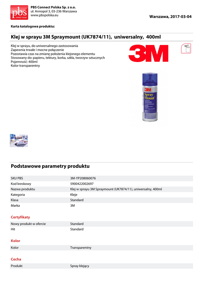 PBS Connect Polska Sp. z o.o. ul. Annopol 3, 03-236 Warszawa www.pbspolska.eu Warszawa, 2017-03-04 Karta katalogowa produktu: Klej w sprayu 3M Spraymount (UK7874/11), uniwersalny, 400ml Klej w sprayu, do uniwersalnego zastosowania Zapewnia trwałe i mocne połączenie Pozostawia czas na zmianę położenia klejonego elementu Stosowany do: papieru, tektury, korka, szkła, tworzyw sztucznych Pojemność: 400ml Kolor transparentny Podstawowe parametry produktu SKU PBS 3M-YP208060076 Kod kreskowy 5900422002697 Nazwa produktu Klej w sprayu 3M Spraymount (UK7874/11), uniwersalny, 400ml Kategoria Kleje Klasa Standard Marka 3M Certyfikaty Nowy produkt w ofercie Standard Hit Standard Kolor Kolor Transparentny Cecha Produkt Spray klejący PBS Connect Polska Sp. z o.o. ul. Annopol 3, 03-236 Warszawa www.pbspolska.eu Warszawa, 2017-03-04 Karta katalogowa produktu cd. Klej w sprayu 3M Spraymount (UK7874/11), uniwersalny, 400ml Podstawowe parametry produktu Typ Uniwersalny W ofercie od 2013-10 Wymiary Rozmiar 400ml Wspólny słownik zamówień CPV 24910000-6 Jednostki logistyczne Opakowanie 1 12 szt