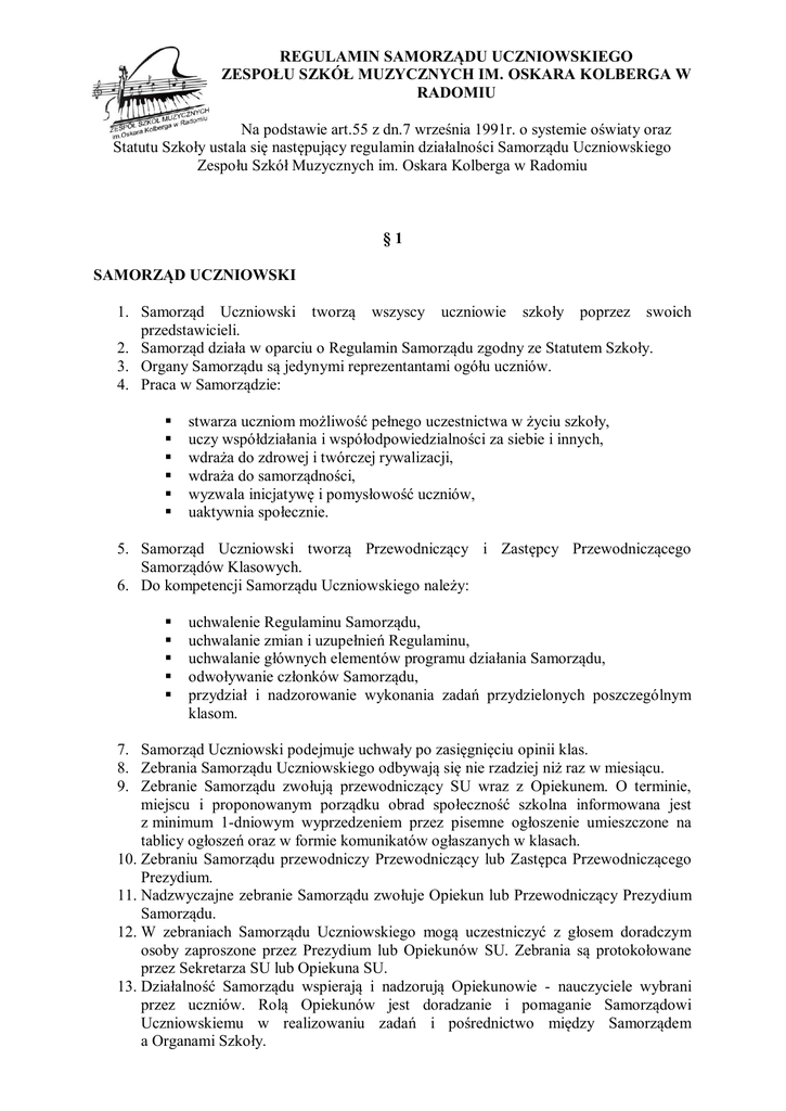 REGULAMIN SAMORZĄDU UCZNIOWSKIEGO ZESPOŁU SZKÓŁ MUZYCZNYCH IM. OSKARA KOLBERGA W RADOMIU Na podstawie art.55 z dn.7 września 1991r. o systemie oświaty oraz Statutu Szkoły ustala się następujący regulamin działalności Samorządu Uczniowskiego Zespołu Szkół Muzycznych im. Oskara Kolberga w Radomiu §1 SAMORZĄD UCZNIOWSKI 1. Samorząd Uczniowski tworzą wszyscy uczniowie szkoły poprzez swoich przedstawicieli. 2. Samorząd działa w oparciu o Regulamin Samorządu zgodny ze Statutem Szkoły. 3. Organy Samorządu są jedynymi reprezentantami ogółu uczniów. 4. Praca w Samorządzie: stwarza uczniom możliwość pełnego uczestnictwa w życiu szkoły, uczy współdziałania i współodpowiedzialności za siebie i innych, wdraża do zdrowej i twórczej rywalizacji, wdraża do samorządności, wyzwala inicjatywę i pomysłowość uczniów, uaktywnia społecznie. 5. Samorząd Uczniowski tworzą Przewodniczący i Zastępcy Przewodniczącego Samorządów Klasowych. 6. Do kompetencji Samorządu Uczniowskiego należy: uchwalenie Regulaminu Samorządu, uchwalanie zmian i uzupełnień Regulaminu, uchwalanie głównych elementów programu działania Samorządu, odwoływanie członków Samorządu, przydział i nadzorowanie wykonania zadań przydzielonych poszczególnym klasom. 7. Samorząd Uczniowski podejmuje uchwały po zasięgnięciu opinii klas. 8. Zebrania Samorządu Uczniowskiego odbywają się nie rzadziej niż raz w miesiącu. 9. Zebranie Samorządu zwołują przewodniczący SU wraz z Opiekunem. O terminie, miejscu i proponowanym porządku obrad społeczność szkolna informowana jest z minimum 1-dniowym wyprzedzeniem przez pisemne ogłoszenie umieszczone na tablicy ogłoszeń oraz w formie komunikatów ogłaszanych w klasach. 10. Zebraniu Samorządu przewodniczy Przewodniczący lub Zastępca Przewodniczącego Prezydium. 11. Nadzwyczajne zebranie Samorządu zwołuje Opiekun lub Przewodniczący Prezydium Samorządu. 12. W zebraniach Samorządu Uczniowskiego mogą uczestniczyć z głosem doradczym osoby zaproszone przez Prezydium lub Opiekunów SU. Zebrania są protokołowane przez Sekretarza SU lub Opiekuna SU. 13. Działalność Samorządu wspierają i nadzorują Opiekunowie - nauczyciele wybrani przez uczniów. Rolą Opiekunów jest doradzanie i pomaganie Samorządowi Uczniowskiemu w realizowaniu zadań i pośrednictwo między Samorządem a Organami Szkoły. 14. Dyrektor szkoły zapewnia organom Samorządu Uczniowskiego warunki organizacyjne, w tym lokalowe, oraz współpracuje z Samorządem poprzez Opiekunów. §2 ZADANIA SAMORZĄDU UCZNIOWSKIEGO 1. Samorząd Uczniowski jest powołany do reprezentowania uczniów wobec organów szkoły. 2. Samorząd reprezentuje społeczność uczniowską wobec instytucji, organów i organizacji pozaszkolnych. 3. Realizacji celów winna towarzyszyć dbałość o dobre imię szkoły. 4. Do zadań Samorządu należy w szczególności: wdrożenie przedstawicieli społeczności uczniowskiej do pracy na rzecz Szkoły i współpracy ze środowiskiem lokalnym, podniesienie rangi Samorządu Uczniowskiego na terenie Szkoły, wdrożenie do samodzielnego i świadomego podejmowania decyzji i działań, przedstawianie organom Szkoły opinii i potrzeb społeczności uczniowskiej, współdziałanie z organami Szkoły, organizacjami szkolnymi i Radą Rodziców w zapewnianiu uczniom należytych warunków do nauki, włączanie się do akcji humanitarnych, występowanie do organów Szkoły o udzielenie pomocy uczniom znajdującym się w trudnej sytuacji, mediacja przy rozstrzyganiu konfliktów dotyczących społeczności szkolnej, współudział w organizowaniu pozalekcyjnego życia szkolnego, planowanie, organizowanie i ocenianie własnych i zespołowych działań na rzecz Szkoły i środowiska, integracja społeczności szkolnej, kształtowanie postaw koleżeńskich i prospołecznych, organizowanie uroczystości szkolnych, działalności kulturalnej, sportowej i turystycznej, tworzenie ceremoniału Szkoły, kultywowanie tradycji, współudział w ocenianiu nauczyciela ubiegającego się o wyższy stopień awansu zawodowego, dbałość o dobre imię i honor Szkoły, gromadzenie środków finansowych do realizacji celów statutowych. 5. Samorząd poprzez różne formy swojego działania zapewnia realizację uprawnień statutowych społeczności uczniowskiej. W przypadku nie respektowania tych uprawnień przez dyrekcję Samorząd Szkolny może wystąpić (powiadomieniem dyrekcji) z pisemną skargą do Rzecznika Praw Ucznia. §3 UPRAWNIENIA SAMORZĄDU 1. Prawo przedstawiania Dyrektorowi Szkoły, Radzie Pedagogicznej i Radzie Rodziców wniosków i opinii dotyczących spraw szkoły, a w szczególności dotyczących realizacji podstawowych praw uczniów. 2. Prawo do przedstawiania propozycji do planu dydaktyczno-wychowawczego szkoły wynikających z potrzeb i zainteresowań uczniów. 3. Prawo do zapoznawania się z programem nauczania, z jego treścią, celem i stawianymi wymaganiami. 4. Prawo do jawnej i umotywowanej oceny postępów w nauce i zachowaniu. 5. Prawo do organizacji życia szkolnego, umożliwiające zachowanie właściwych proporcji między wysiłkiem szkolnym, a możliwością rozwijania i zaspokajania własnych zainteresowań. 6. Redagowanie ściennych gazetek szkolnych. 7. Prawo organizowania działalności kulturalnej, oświatowej, sportowej oraz rozrywkowej zgodnie z własnymi potrzebami i możliwościami organizacyjnymi, w porozumieniu z Dyrektorem Szkoły 8. Prawo wyboru nauczyciela pełniącego rolę opiekuna Samorządu i wypowiadania opinii na temat współpracy z tymże nauczycielem. 9. Dysponowanie, w porozumieniu z opiekunem, funduszami będącymi w posiadaniu Samorządu oraz środkami wspólnie wypracowanymi przez młodzież. §4 ORGANY SAMORZĄDU 1. Organami Samorządu są: Samorząd Klasowy, Samorząd Szkolny, Prezydium Samorządu Uczniowskiego, 2. Kadencja samorządowych organów wybieralnych trwa dwa lata . 3. Wszystkie wybory personalne 