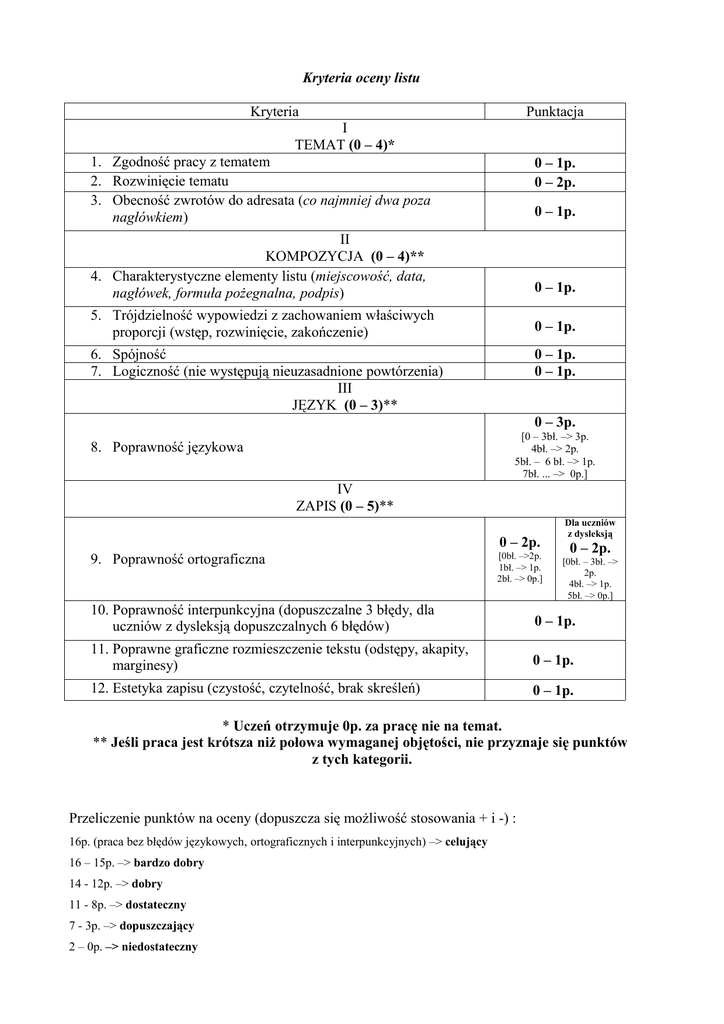 Kryteria oceny listu Kryteria Punktacja I TEMAT (0 – 4)* 1. Zgodność pracy z tematem 2. Rozwinięcie tematu 3. Obecność zwrotów do adresata (co najmniej dwa poza nagłówkiem) 0 – 1p. 0 – 2p. 0 – 1p. II KOMPOZYCJA (0 – 4)** 4. Charakterystyczne elementy listu (miejscowość, data, nagłówek, formuła pożegnalna, podpis) 0 – 1p. 5. Trójdzielność wypowiedzi z zachowaniem właściwych proporcji (wstęp, rozwinięcie, zakończenie) 0 – 1p. 6. Spójność 7. Logiczność (nie występują nieuzasadnione powtórzenia) III JĘZYK (0 – 3)** 0 – 1p. 0 – 1p. 0 – 3p. [0 – 3bł. –> 3p. 4bł. –> 2p. 5bł. – 6 bł. –> 1p. 7bł. ... –> 0p.] 8. Poprawność językowa IV ZAPIS (0 – 5)** 0 – 2p. 9. Poprawność ortograficzna [0bł. –>2p. 1bł. –> 1p. 2bł. –> 0p.] Dla uczniów z dysleksją 0 – 2p. [0bł. – 3bł. –> 2p. 4bł. –> 1p. 5bł. –> 0p.] 10. Poprawność interpunkcyjna (dopuszczalne 3 błędy, dla uczniów z dysleksją dopuszczalnych 6 błędów) 0 – 1p. 11. Poprawne graficzne rozmieszczenie tekstu (odstępy, akapity, marginesy) 0 – 1p. 12. Estetyka zapisu (czystość, czytelność, brak skreśleń) 0 – 1p. * Uczeń otrzymuje 0p. za pracę nie na temat. ** Jeśli praca jest krótsza niż połowa wymaganej objętości, nie przyznaje się punktów z tych kategorii. Przeliczenie punktów na oceny (dopuszcza się możliwość stosowania + i -) : 16p. (praca bez błędów językowych, ortograficznych i interpunkcyjnych) –> celujący 16 – 15p. –> bardzo dobry 14 - 12p. –> dobry 11 - 8p. –> dostateczny 7 - 3p. –> dopuszczający 2 – 0p. –> niedostateczny