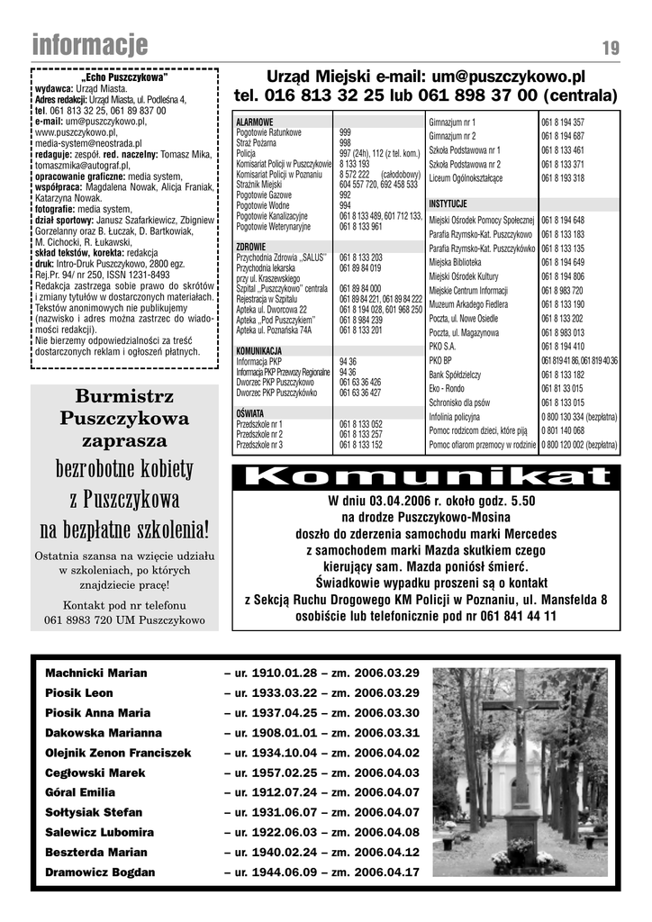 informacje Echo Puszczykowa wydawca: Urz¹d Miasta. Adres redakcji: Urz¹d Miasta, ul. Podlena 4, tel. 061 813 32 25, 061 89 837 00 e-mail: um(puszczykowo.pl, www.puszczykowo.pl, media-system(neostrada.pl redaguje: zespó³. red. naczelny: Tomasz Mika, tomaszmika(autograf.pl, opracowanie graficzne: media system, wspó³praca: Magdalena Nowak, Alicja Franiak, Katarzyna Nowak. fotografie: media system, dzia³ sportowy: Janusz Szafarkiewicz, Zbigniew Gorzelanny oraz B. £uczak, D. Bartkowiak, M. Cichocki, R. £ukawski, sk³ad tekstów, korekta: redakcja druk: Intro-Druk Puszczykowo, 2800 egz. Rej.Pr. 94/ nr 250, ISSN 1231-8493 Redakcja zastrzega sobie prawo do skrótów i zmiany tytu³ów w dostarczonych materia³ach. Tekstów anonimowych nie publikujemy (nazwisko i adres mo¿na zastrzec do wiadomoci redakcji). Nie bierzemy odpowiedzialnoci za treæ dostarczonych reklam i og³oszeñ p³atnych. Burmistrz Puszczykowa zaprasza bezrobotne kobiety z Puszczykowa na bezp³atne szkolenia! Ostatnia szansa na wziêcie udzia³u w szkoleniach, po których znajdziecie pracê! Kontakt pod nr telefonu 061 8983 720 UM Puszczykowo 19 Urz¹d Miejski e-mail: [email protected] tel. 016 813 32 25 lub 061 898 37 00 (centrala) ALARMOWE Pogotowie Ratunkowe Stra¿ Po¿arna Policja Komisariat Policji w Puszczykowie Komisariat Policji w Poznaniu Stra¿nik Miejski Pogotowie Gazowe Pogotowie Wodne Pogotowie Kanalizacyjne Pogotowie Weterynaryjne 999 998 997 (24h), 112 (z tel. kom.) 8 133 193 8 572 222 (ca³odobowy) 604 557 720, 692 458 533 992 994 061 8 133 489, 601 712 133, 061 8 133 961 Gimnazjum nr 1 Gimnazjum nr 2 Szko³a Podstawowa nr 1 Szko³a Podstawowa nr 2 Liceum Ogólnokszta³c¹ce 061 8 194 357 061 8 194 687 061 8 133 461 061 8 133 371 061 8 193 318 INSTYTUCJE Miejski Orodek Pomocy Spo³ecznej Parafia Rzymsko-Kat. Puszczykowo ZDROWIE Parafia Rzymsko-Kat. Puszczykówko Przychodnia Zdrowia ,,SALUS 061 8 133 203 Miejska Biblioteka Przychodnia lekarska 061 89 84 019 Miejski Orodek Kultury przy ul. Kraszewskiego Szpital ,,Puszczykowo centrala 061 89 84 000 Miejskie Centrum Informacji Rejestracja w Szpitalu 061 89 84 221, 061 89 84 222 Muzeum Arkadego Fiedlera Apteka ul. Dworcowa 22 061 8 194 028, 601 968 250 Poczta, ul. Nowe Osiedle Apteka ,,Pod Puszczykiem 061 8 984 239 Apteka ul. Poznañska 74A 061 8 133 201 Poczta, ul. Magazynowa PKO S.A. KOMUNIKACJA PKO BP Informacja PKP 94 36 Informacja PKP Przewozy Regionalne 94 36 Bank Spó³dzielczy Dworzec PKP Puszczykowo 061 63 36 426 Eko - Rondo Dworzec PKP Puszczykówko 061 63 36 427 Schronisko dla psów OWIATA Infolinia policyjna Przedszkole nr 1 061 8 133 052 Pomoc rodzicom dzieci, które pij¹ Przedszkole nr 2 061 8 133 257 Pomoc ofiarom przemocy w rodzinie Przedszkole nr 3 061 8 133 152 061 8 194 648 061 8 133 183 061 8 133 135 061 8 194 649 061 8 194 806 061 8 983 720 061 8 133 190 061 8 133 202 061 8 983 013 061 8 194 410 061 819 41 86, 061 819 40 36 061 8 133 182 061 81 33 015 061 8 133 015 0 800 130 334 (bezp³atna) 0 801 140 068 0 800 120 002 (bezp³atna) Komunikat W dniu 03.04.2006 r. oko³o godz. 5.50 na drodze Puszczykowo-Mosina dosz³o do zderzenia samochodu marki Mercedes z samochodem marki Mazda skutkiem czego kieruj¹cy sam. Mazda poniós³ mieræ. wiadkowie wypadku proszeni s¹ o kontakt z Sekcj¹ Ruchu Drogowego KM Policji w Poznaniu, ul. Mansfelda 8 osobicie lub telefonicznie pod nr 061 841 44 11 Machnicki Marian ur. 1910.01.28 zm. 2006.03.29 Piosik Leon ur. 1933.03.22 zm. 2006.03.29 Piosik Anna Maria ur. 1937.04.25 zm. 2006.03.30 Dakowska Marianna ur. 1908.01.01 zm. 2006.03.31 Olejnik Zenon Franciszek ur. 1934.10.04 zm. 2006.04.02 Ceg³owski Marek ur. 1957.02.25 zm. 2006.04.03 Góral Emilia ur. 1912.07.24 zm. 2006.04.07 So³tysiak Stefan ur. 1931.06.07 zm. 2006.04.07 Salewicz Lubomira ur. 1922.06.03 zm. 2006.04.08 Beszterda Marian ur. 1940.02.24 zm. 2006.04.12 Dramowicz Bogdan ur. 1944.06.09 zm. 2006.04.17