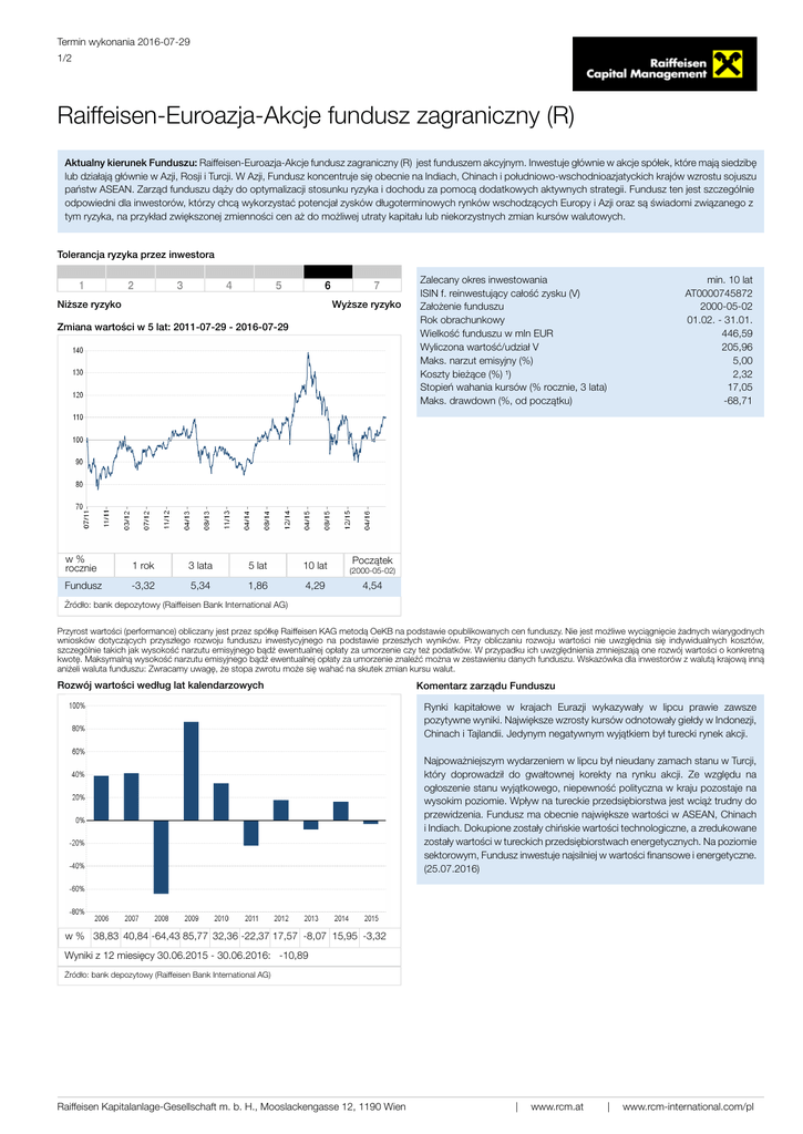 Termin wykonania 2016-07-29 1/2 Raiffeisen-Euroazja-Akcje fundusz zagraniczny (R) Aktualny kierunek Funduszu: Raiffeisen-Euroazja-Akcje fundusz zagraniczny (R) jest funduszem akcyjnym. Inwestuje głównie w akcje spółek, które mają siedzibę lub działają głównie w Azji, Rosji i Turcji. W Azji, Fundusz koncentruje się obecnie na Indiach, Chinach i południowo-wschodnioazjatyckich krajów wzrostu sojuszu państw ASEAN. Zarząd funduszu dąży do optymalizacji stosunku ryzyka i dochodu za pomocą dodatkowych aktywnych strategii. Fundusz ten jest szczególnie odpowiedni dla inwestorów, którzy chcą wykorzystać potencjał zysków długoterminowych rynków wschodzących Europy i Azji oraz są świadomi związanego z tym ryzyka, na przykład zwiększonej zmienności cen aż do możliwej utraty kapitału lub niekorzystnych zmian kursów walutowych. Tolerancja ryzyka przez inwestora Niższe ryzyko Wyższe ryzyko Zmiana wartości w 5 lat: 2011-07-29 - 2016-07-29 w% rocznie 1 rok 3 lata 5 lat 10 lat (2000-05-02) Fundusz -3,32 5,34 1,86 4,29 4,54 Zalecany okres inwestowania ISIN f. reinwestujący całość zysku (V) Założenie funduszu Rok obrachunkowy Wielkość funduszu w mln EUR Wyliczona wartość/udział V Maks. narzut emisyjny (%) Koszty bieżące (%) ¹) Stopień wahania kursów (% rocznie, 3 lata) Maks. drawdown (%, od początku) min. 10 lat AT0000745872 2000-05-02 01.02. - 31.01. 446,59 205,96 5,00 2,32 17,05 -68,71 Początek Żródło: bank depozytowy (Raiffeisen Bank International AG) Przyrost wartości (performance) obliczany jest przez spółkę Raiffeisen KAG metodą OeKB na podstawie opublikowanych cen funduszy. Nie jest możliwe wyciągnięcie żadnych wiarygodnych wniosków dotyczących przyszłego rozwoju funduszu inwestycyjnego na podstawie przeszłych wyników. Przy obliczaniu rozwoju wartości nie uwzględnia się indywidualnych kosztów, szczególnie takich jak wysokość narzutu emisyjnego bądź ewentualnej opłaty za umorzenie czy też podatków. W przypadku ich uwzględnienia zmniejszają one rozwój wartości o konkretną kwotę. Maksymalną wysokość narzutu emisyjnego bądź ewentualnej opłaty za umorzenie znaleźć można w zestawieniu danych funduszu. Wskazówka dla inwestorów z walutą krajową inną aniżeli waluta funduszu: Zwracamy uwagę, że stopa zwrotu może się wahać na skutek zmian kursu walut. Rozwój wartości według lat kalendarzowych Komentarz zarządu Funduszu Rynki kapitałowe w krajach Eurazji wykazywały w lipcu prawie zawsze pozytywne wyniki. Największe wzrosty kursów odnotowały giełdy w Indonezji, Chinach i Tajlandii. Jedynym negatywnym wyjątkiem był turecki rynek akcji. Najpoważniejszym wydarzeniem w lipcu był nieudany zamach stanu w Turcji, który doprowadził do gwałtownej korekty na rynku akcji. Ze względu na ogłoszenie stanu wyjątkowego, niepewność polityczna w kraju pozostaje na wysokim poziomie. Wpływ na tureckie przedsiębiorstwa jest wciąż trudny do przewidzenia. Fundusz ma obecnie największe wartości w ASEAN, Chinach i Indiach. Dokupione zostały chińskie wartości technologiczne, a zredukowane zostały wartości w tureckich przedsiębiorstwach energetycznych. Na poziomie sektorowym, Fundusz inwestuje najsilniej w wartości finansowe i energetyczne. (25.07.2016) w % 38,83 40,84 -64,43 85,77 32,36 -22,37 17,57 -8,07 15,95 -3,32 Wyniki z 12 miesięcy 30.06.2015 - 30.06.2016: -10,89 Żródło: bank depozytowy (Raiffeisen Bank International AG) Raiffeisen Kapitalanlage-Gesellschaft m. b. H., Mooslackengasse 12, 1190 Wien | www.rcm.at | www.rcm-international.com/pl Termin wykonania 2016-07-29 2/2 Raiffeisen-Euroazja-Akcje fundusz zagraniczny (R) Struktura pap. wartościowych wg kraju siedziby Struktura pap. wartościowych wg sektorów MSCI Największe pozycje akcji Struktura funduszu wg walut papierów wartościowych Sberbank of Russia 4,51% Zijin Mining Group Co Ltd 2,62% Lukoil OAO 2,53% Bank of China Ltd 2,28% Want Want China Holdings Ltd 2,11% Hengan International Group Co Ltd 2,03% Tata Motors Ltd 1,93% China Mobile Ltd 1,78% China Construction Bank Corp 1,70% Maruti Suzuki India Ltd 1,69% ¹) „Koszty bieżące“ naliczane są na podstawie danych liczbowych na dzień 30.06.2016 z uwzględnieniem poprzednich 12 miesięcy. „Koszty bieżące“ zawierają wynagrodzenie za zarządzanie oraz pobrane w tym okresie opłaty. Koszty transakcji zagranicznych i opłaty uzależnione od powodzenia nie są częścią „opłat bieżących”. „Koszty bieżące“ mogą być każdego roku różne. Dokładny wykaz składników kosztów zawartych w „Kosztach bieżących” znaleźć można w aktualnym sprawozdaniu rocznym w podpunkcie „Koszty”. W ramach strategii inwestycyjnej możliwe są znaczne inwestycje w instrumenty pochodne (z uwzględnieniem związanego z nimi ryzyka). Fundusz wykazuje większą zmienność, tj. wartości udziałów ulegają dużym wahaniom w górę i w dół w krótkich okresach, przy czym nie można wykluczyć również strat kapitałowych. Jest to komunikat marketingowy. Wszystkie dane i informacje zostały zestawione i sprawdzone z największą starannością, a także z wykorzystaniem wiarygodnych źródeł. Niniejsze informacje są aktualne na dzień sporządzania aktualizacji. Nie ponosi się odpowiedzialności ani nie gwarantuje poprawności i kompletności informacji. Opublikowane prospekty lub informacje dla inwestorów zgodnie z § 21 ustawy zarządzających alternatywnymi funduszami inwestycyjnymi (AIFMG) oraz dokumenty informacyjne dla klienta (kluczowe informacje dla inwestorów) funduszy Raiffeisen Investment-Gesellschaft mbH, zatwierdzonych do dystrybucji w Polsce, są dostępne pod adresem www.rcm-international.com/pl, a także w siedzibie Raiffeisen Bank Polska S.A., ul. Piękna 20, 00-549 Warszawa, w języku angielskim i polskim. Raiffeisen Kapitalanlage-Gesellschaft m. b. H., Mooslackengasse 12, 1190 Wien | www.rcm.at | www.rcm-international.com/pl