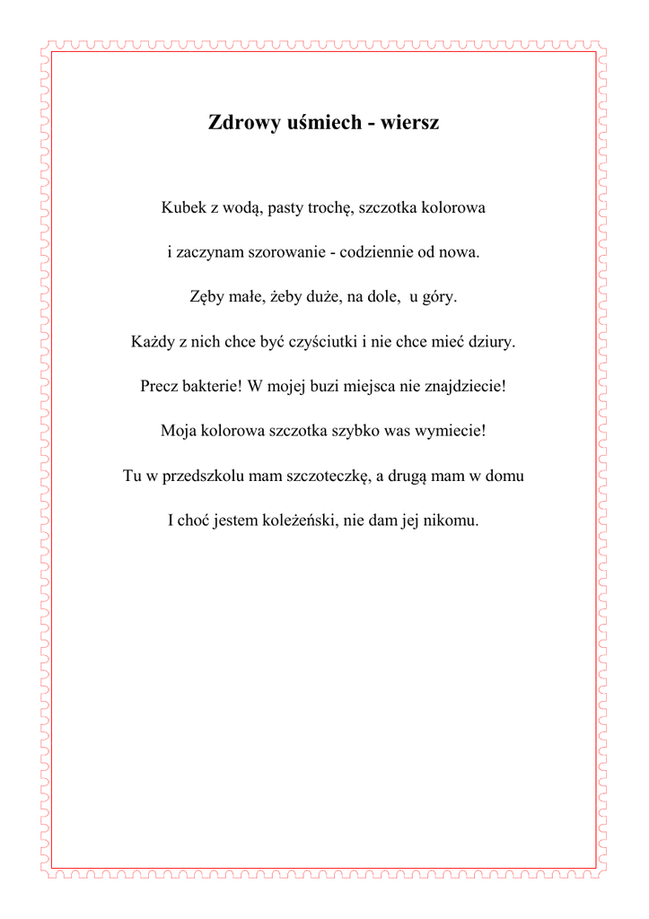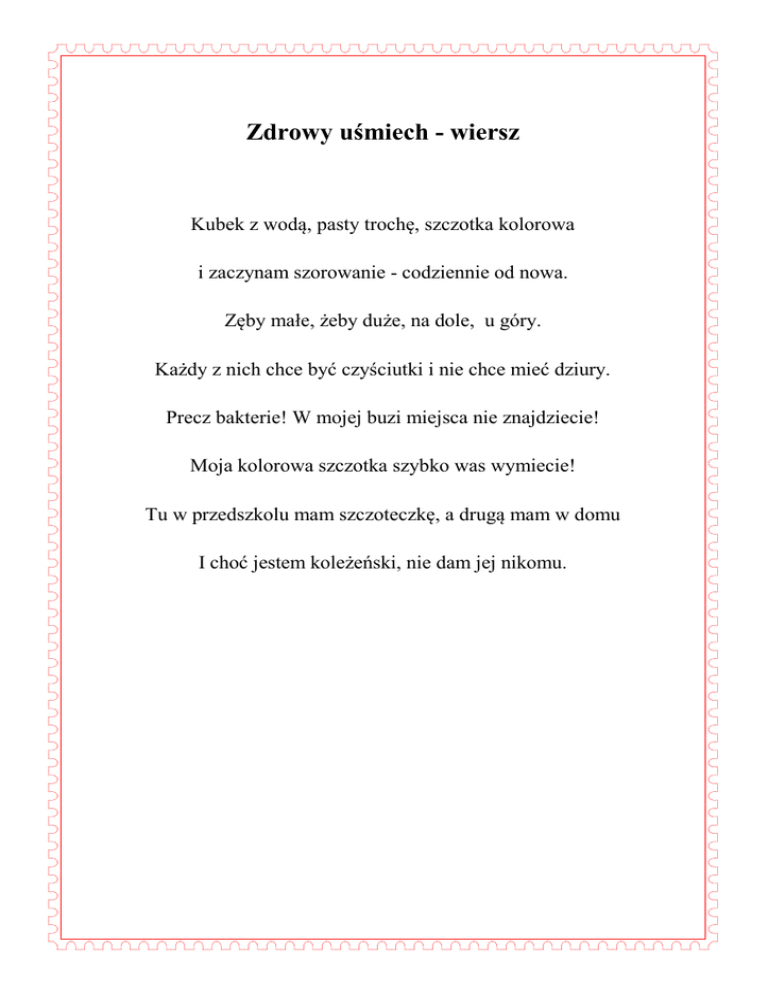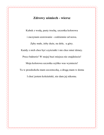 Zdrowy uśmiech - wiersz Kubek z wodą, pasty trochę, szczotka kolorowa i zaczynam szorowanie - codziennie od nowa. Zęby małe, żeby duże, na dole, u góry. Każdy z nich chce być czyściutki i nie chce mieć dziury. Precz bakterie! W mojej buzi miejsca nie znajdziecie! Moja kolorowa szczotka szybko was wymiecie! Tu w przedszkolu mam szczoteczkę, a drugą mam w domu I choć jestem koleżeński, nie dam jej nikomu.