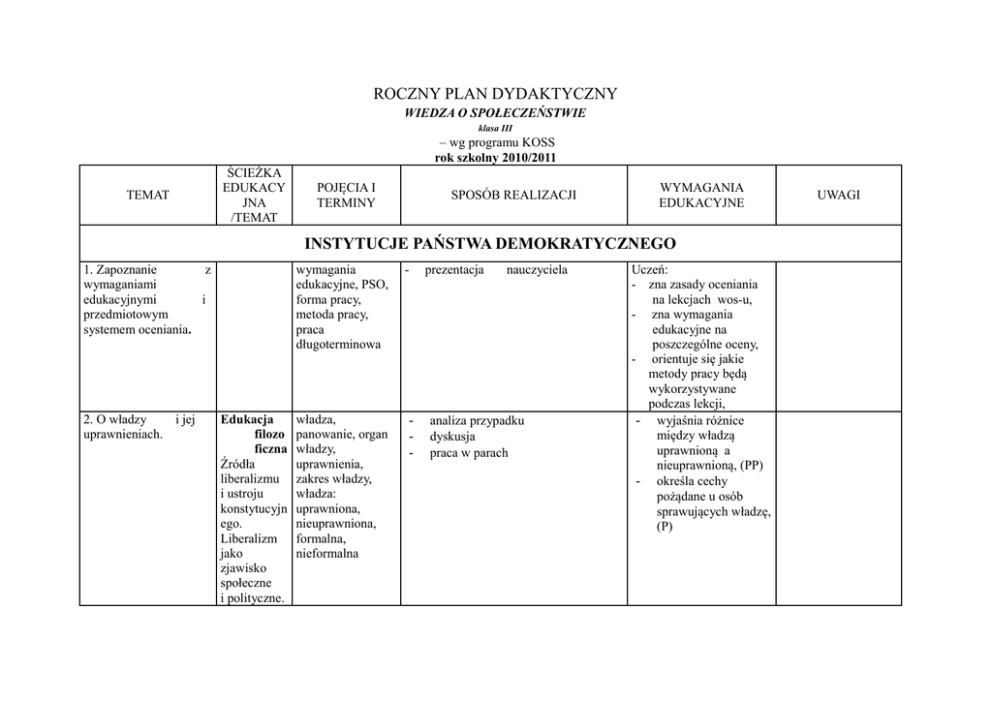 ROCZNY PLAN DYDAKTYCZNY WIEDZA O SPOŁECZEŃSTWIE klasa III – wg programu KOSS rok szkolny 2010/2011 TEMAT ŚCIEŻKA EDUKACY JNA /TEMAT POJĘCIA I TERMINY SPOSÓB REALIZACJI WYMAGANIA EDUKACYJNE INSTYTUCJE PAŃSTWA DEMOKRATYCZNEGO 1. Zapoznanie z wymaganiami edukacyjnymi i przedmiotowym systemem oceniania. 2. O władzy i jej uprawnieniach. wymagania edukacyjne, PSO, forma pracy, metoda pracy, praca długoterminowa Edukacja filozo ficzna Źródła liberalizmu i ustroju konstytucyjn ego. Liberalizm jako zjawisko społeczne i polityczne. władza, panowanie, organ władzy, uprawnienia, zakres władzy, władza: uprawniona, nieuprawniona, formalna, nieformalna - - prezentacja nauczyciela analiza przypadku dyskusja praca w parach Uczeń: - zna zasady oceniania na lekcjach wos-u, - zna wymagania edukacyjne na poszczególne oceny, - orientuje się jakie metody pracy będą wykorzystywane podczas lekcji, - wyjaśnia różnice między władzą uprawnioną a nieuprawnioną, (PP) - określa cechy pożądane u osób sprawujących władzę, (P) UWAGI 3. Rola konstytucji w państwie. 4. Władza ustawodawcza wykonawcza RP. Kultura polska na tle tradycji śródziemno morskiej Rzymski rodowód republiki. i w konstytucja, konstytucjonalizm, referendum konstytucyjne, Trybunał Konstytucyjny, skarga konstytucyjna, konkordat wybory, parlament, prezydent, rząd, władza ustawodawcza, wykonawcza, system: parlamentarny, prezydencki, mieszany ustawa, inicjatywa ustawodawcza, debata sejmowa, poprawki - praca w grupach analiza Konstytucji RP gromadzenie argumentów dyskusji - zabawa edukacyjna „Prawda czy fałsz” analiza dokumentów układanie słowniczka tematycznego - do - - - objaśnia , czym jest konstytucja, (P) zna główne funkcje konstytucji we współczesnym państwie demokratycznym, (PP) zna sposób powoływania parlamentu, (P) opisuje cechy charakterystyczne systemu parlamentarnego, prezydenckiego i mieszanego, (PP) zna uprawnienia rządu i prezydenta, (P) zna drogę ustawodawczą(P) określa kompetencje sejmu, senatu i prezydenta w czasie powstawania nowej ustawy, (PP) 5. Administrować, czyli zarządzać. administracja publiczna, administracja rządowa, administracja samorządowa, organ, urząd, urzędnik, służba cywilna - metoda tekstu przewodniego, analiza przypadku, metoda ćwiczeń praktycznych (redagowanie odwołania od decyzji administracyjnej) - - - - potrafi określić, co to jest administracja publiczna (P), rozróżnia kompetencje administracji publicznej, rządowej i samorządowej (PP) wskazuje zależności pomiędzy organami władzy rządowej samorządowej (PP), wymienia reguły, jakim powinien kierować się dobry urzędnik (P), potrafi napisać odwołanie od decyzji administracyjnej (PP). 6. Na straży prawa. 7. Kto patrzy władzy na ręce? norma prawna, akt prawny, zarządzenie statut, regulamin, funkcje prawa, kodeks sądy, apelacja, kasacja, prawo karne, administracyjne, cywilne, policja sąd karny, sąd cywilny, proces, prokurator, organa ścigania, domniemanie niewinności, wyrok, odwołanie, instancje - praworządność, kontrola państwowa, rzecznik praw obywatelskich, decyzja administracyjna - praca w grupach gry i zabawy edukacyjne układanie słowniczka „sądowego” - - metoda tekstu przewodniego, analiza przypadku, redagowanie wniosku do Rzecznika Praw Obywatelskich - - wie, czym różnią się normy prawne od innego rodzaju norm określa rolę prawa w życiu społecznym, potrafi wyjaśnić pojęcie niezawisłość sądów, zna zadania prokuratury i policji, określa, jakie sprawy powinny trafić do sądu karnego, jakie do cywilnego, zauważa główne różnice w postępowaniu sądowym w sprawach karnych i cywilnych, wymienia kompetencje Trybunału Stanu, Naczelnego Sadu Administracyjnego, Najwyższej Izby Kontroli, wie, z jakimi sprawami można zwracać się do RPO, redaguje wniosek do Rzecznika Praw Obywatelskich. 8. Test sprawdzający Instytucje państwa demokratycznego. 9. Kto działa w gospodarce? potrzeby ekonomiczne, czynniki wytwórcze, rzadkość dóbr, usługi, kapitał, decyzja, koszt utraconej szansy podmioty gospodarcze, gospodarstwo domowe, przedsiębiorstwo, obieg okrężny, zasoby, dochody - praca z tekstem analiza łańcucha zdarzeń wywiady - - - pracuje samodzielnie, właściwie planuje własną pracę, określa potrzeby ekonomiczne i możliwości ich zaspokojenia, (P) wie, czym są czynniki wytwórcze, (P) podejmuje decyzje ekonomiczne, (PP) wymienia podmioty funkcjonujące w gospodarce, (P) wskazuje różnice w zasobach, dochodach, działalności gospodarstw domowych i przedsiębiorstw, (P) potrafi omówić obieg okrężny, (PP) 10. W świecie pieniądza. 11. Budżet państwa. dochody, wydatki, budżet, konsument, kredyt, oszczędności, lokata, obligacja, akcja, rękojmia, gwarancja produkcja, rynek, konkurencja, podaż, popyt, cena równowagi rynkowej, monopol, giełda, akcje, barter, pieniądz kruszcowy, pieniądz papierowy, karta kredytowa, bank, kredyt, czek, depozyt, obrót bezgotówkowy, inflacja - podatek:dochodow y, od wartości dodanej(VAT),akc yza, cło, równowaga budżetowa, deficyt, nadwyżka, skarb państwa - analiza dokumentów praca w grupach praca ze słownikami - praca z testem symulacje odgrywanie ról - - dostrzega wpływ potrzeb rynku na produkcję, rozumie, czym jest konkurencja rynkowa, dostrzega niebezpieczeństwo monopolizacji, określa funkcje pieniądza, wymienia najważniejsze operacje bankowe, zna rodzaje podatków, (P) wie, skąd się biorą środki finansowe państwa i jak są wydatkowane, (P) dostrzega wpływ istnienia szarej strefy na budżet państwa, (PP) 12. Wybieram szkołę i zawód. 13. Szukam pracy. 14. Powtórka przed egzaminem Edukacja prozdrowotn a Działalność człowieka a zagrożenia zdrowia. rynek pracy, wynagrodzenie, kwalifikacje zawodowe, kariera zawodowa - Edukacja regio nalna Problemy społeczne mieszkańcó w gminy. bezrobocie, siła robocza, stopa bezrobocia, pośrednictwo pracy, CV, list mot