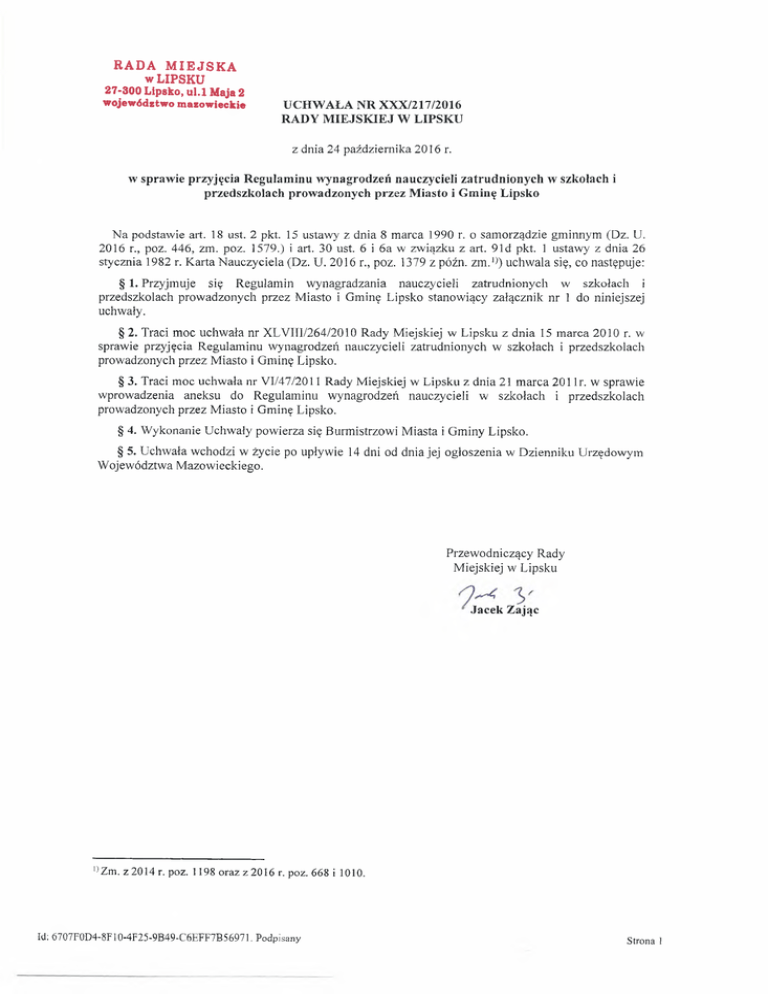 RADA M I E J S K A w LIPSKU 27-300 Lipsko, u l.l Maja 2 województwo mazowieckie UCHWAŁA NR XXX/217/2016 RADY MIEJSKIEJ W LIPSKU z dnia 24 października 2016 r. w sprawie przyjęcia Regulaminu wynagrodzeń nauczycieli zatrudnionych w szkołach i przedszkolach prowadzonych przez Miasto i Gminę Lipsko Na podstawie art. 18 ust. 2 pkt. 15 ustawy z dnia 8 marca 1990 r. o samorządzie gminnym (Dz. U. 2016 r., poz. 446, zm. poz. 1579.) i art. 30 ust. 6 i 6a w związku z art. 91 cl pkt. 1 ustawy z dnia 26 stycznia 1982 r. Karta Nauczyciela (Dz. U. 2016 r., poz. 1379 z późn. zm.ń) uchwala się, co następuje: § 1. Przyjmuje się Regulamin wynagradzania nauczycieli zatrudnionych w szkołach i przedszkolach prowadzonych przez Miasto i Gminę Lipsko stanowiący załącznik nr 1 do niniejszej uchwały. § 2. Traci moc uchwała nr XLVIII/264/2010 Rady Miejskiej w Lipsku z dnia 15 marca 2010 r. w sprawie przyjęcia Regulaminu wynagrodzeń nauczycieli zatrudnionych w szkołach i przedszkolach prowadzonych przez Miasto i Gminę Lipsko. § 3. Traci moc uchwała nr VI/47/2011 Rady Miejskiej w Lipsku z dnia 21 marca 201 lr. w sprawie wprowadzenia aneksu do Regulaminu wynagrodzeń nauczycieli w szkołach i przedszkolach prowadzonych przez Miasto i Gminę Lipsko. § 4. Wykonanie Uchwały powierza się Burmistrzowi Miasta i Gminy Lipsko. § 5. Uchwała wchodzi w życie po upływie 14 dni od dnia jej ogłoszenia w Dzienniku Urzędowym Województwa Mazowieckiego. Przewodniczący Rady Miejskiej w Lipsku Jacek Zając V)Zm. z 2014 r. poz. 1198 oraz z 2016 r. poz. 668 i 1010. Id; 6707F0D4-8F10-4F25-9B49-C6EFF7B56971. Podpisany Strona 1 RADA M I E J SK A w LIPSKU 27-300 Lipsko, u l.l Maja 2 województwo mazowieckie Załącznik do Uchwały N r X X X /217/2016 Rady Miejskiej w Lipsku z dnia 24 października 2016 r. REGULAMIN W YNAGRODZEŃ NAUCZYCIELI ZATRUDNIONYCH W SZKOŁACH I PRZEDSZKOLACH PROWADZONYCH PRZEZ MIASTO I GMINĘ LIPSKO Rozdział 1. PRZEPISY OGÓLNE § 1. 1. Ilekroć w dalszych przepisach jest mowa bez bliższego określenia o : 1) Karcie Nauczyciela — należy przez to rozumieć ustawę z dnia 26 stycznia 1982r. — Karta Nauczyciela; 2) rozporządzeniu — należy przez to rozumieć rozporządzenie Ministra Edukacji Narodowej i Sportu z dnia 31 stycznia 2005r. w sprawie wysokości minimalnych stawek wynagrodzenia zasadniczego nauczycieli, ogólnych warunków przyznawania dodatków do wynagrodzenia zasadniczego oraz wynagrodzenia za pracę w dni wolne od pracy (Dz. U. z 2014 r. poz. 416 z późn. zm.); 3) szkole - należy przez to rozumieć szkołę, przedszkole, zespołu placówek dla których organem prowadzącym jest Miasto i Gmina Lipsko; 4) dyrektorze lub wicedyrektorze - należy przez to rozumieć dyrektora lub wicedyrektora jednostki o której mowa w pkt. 3; 5) roku szkolnym należy przez to rozumieć - okres pracy szkoły od 1 września danego roku do 31 sierpnia roku następnego; 6) klasie - należy przez to rozumieć także oddział lub grupę; 7) uczniu - należy przez to rozumieć także wychowanka; 8) miesięcznej liczbie godzin obowiązkowego lub realizowanego wymiaru zajęć nauczyciela - należy przez to rozumieć odpowiedni wymiar godzin, określony odpowiednio w art. 42 ust. 3 lub ust. 4a Karty Nauczyciela pomnożony przez 4.16 z zaokrągleniem do pełnej godziny w ten sposób, że czas zajęć do 0,5 godziny pomijamy, a co najmniej 0,5 godziny liczymy za pełną godzinę; 9) nauczycielu - należy przez to rozumieć nauczycieli, wychowawców i innych pedagogicznych zatrudnionych w szkołach i przedszkolach. pracowników 2. Nauczycielowi zatrudnionemu w niepełnym wymiarze czasu pracy poszczególne składniki wynagrodzenia przysługują w części proporcjonalnej do wymiaru czasu pracy, o ile postanowienia niniejszego Regulaminu lub przepisy szczegółowe nie stanowią inaczej. 3. W razie zastępowania nieobecnych nauczycieli przez nauczycieli zatrudnionych w niepełnym wymiarze godzin — za faktycznie zrealizowane godziny zastępstw przysługuje wynagrodzenie według zasad ustalonych dla godzin ponadwymiarowych. . § 2 Regulamin określa warunki przyznawania oraz wysokość: 1) wynagrodzenia za godziny ponadwymiarowe i zastępstwa doraźne; 2) dodatku za wysługę lat; 3) dodatku motywacyjnego; Id: 6707F0D4-8F10-4F25-9B49-C6EFF7B56971. Podpisany Strona 1 4) dodatku funkcyjnego; 5) dodatku za pracę w warunkach trudnych i uciążliwych; 6) dodatków specjalistycznych; 7) nagród ze specjalnego funduszu nagród; 7) nauczycielskiego dodatku mieszkaniowego; 8) dodatków socjalnych i inny świadczeń. Rozdział 2. WYNAGRODZENIE ZA GODZINY PONADWYMIAROWE I ZASTĘPSTW A DORAŹNE. § 3. 1. Rozliczenia godzin zajęć dydaktycznych, opiekuńczych i wychowawczych nauczyciela (w tym również dyrektora) dokonuję się w oparciu o aktualne przepisy oświatowe. 2. Wynagrodzenie za godziny ponadwymiarowe wypłaca się wg. stawki osobistego zaszeregowania nauczyciela, z uwzględnieniem dodatku za warunki pracy (jeżeli praca w tej godzinie została zrealizowana w warunkach uprawniających do dodatku). 3. Wysokość stawki za jedną godzinę ponadwymiarową oblicza się dzieląc sumę dodatku za warunki pracy (jeżeli praca w tej godzinie została zrealizowana w warunkach uprawniających do dodatku) i odpowiedniej stawki wynagrodzenia zasadniczego nauczyciela wynikającą z jego zaszeregowania przez miesięczną liczbę godzin tygodniowego obowiązkowego wymiaru godzin, ustalonego dla rodzaju zajęć dydaktycznych, wychowawczych lub opiekuńczych, realizowanych w ramach godzin ponadwymiarowych. § 4. 1. Wynagrodzenie za godziny ponadwymiarowe przydzielone w planie organizacyjnym przysługuje w Dniu Edukacji Narodowej oraz w dniach, w których nauczyciel nie mógł realizować zajęć z przyczyn leżących po stronie pracodawcy, w szczególności w związku z: zawieszenia zajęć z powodu epidemii, warunków pogodowych lub innych sytuacji losowych; wyjazdem dzieci na wycieczki lub imprezy; chorob