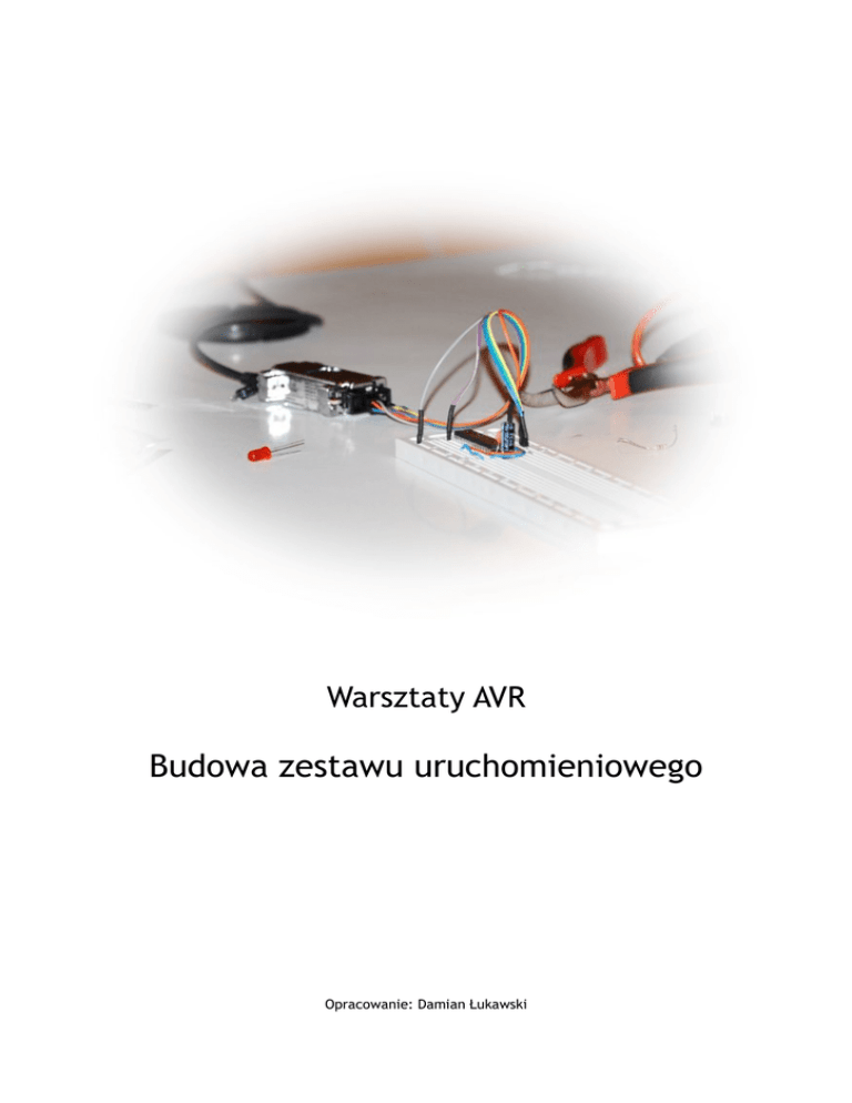 Warsztaty AVR Budowa zestawu uruchomieniowego Opracowanie: Damian Łukawski Wstęp Opracowanie jest gratisowym dodatkiem do warsztatów prowadzonych przez studenckie koło automatyków SKALP działające na Politechnice Gdańskiej. Treść zawiera czynności, w których wymagana jest obsługa niebezpiecznych narzędzi (lutownica, obcęgi, nóż itp.), które w przypadku niepoprawnego użytkowania mogą spowodować uszkodzenia ciała, uszkodzenie elementów elektronicznych lub samych narzędzi. Autor nie bierze odpowiedzialności za poniesione straty wynikające z korzystania z tego opracowania. Zaleca się zachowanie szczególnej ostrożności, trzeźwości oraz jasności umysłu. Miłej lektury! Przygotowanie Aby rozpocząć prace związane z budowaniem oraz używaniem zestawu potrzebne będą nam: Dodatkowo przyda się lutownica, cyna, pasta do lutowania / kalafonia oraz kilka ostrych narzędzi (nóż, ewentualnie obcęgi czy kombinerki). Układ prototypowy Zanim zaczniemy budowę układu warto jest wspomnieć co nieco na temat połączeń w naszej płytce stykowej. W omawianym elemencie zostały zaznaczone liniami ciągłymi pady, które są ze sobą połączone. Grup zaznaczonych na czerwono użyjemy do podłączenia zasilania (+, Vcc), a zaznaczone na niebiesko złączymy z masą (-, GND). Oznaczone kolorem zielonym będą podłączone do różnych nóg układu oraz peryferiów. Aby przejść dalej musimy rozplanować położenie elementów oraz ich połączenie na podstawie schematu, który prezentuje się następująco: Przedstawiony układ jest bardzo prosty i składa się zaledwie z 3 elementów, także bez przeciągania przejdziemy od razu do jego realizacji. Pierwszym krokiem będzie umieszczenie atmegi8 w płytce stykowej. Proponuję to zrobić z brzegu płytki gdzie mamy początek numeracji padów (1), gdyż w późniejszych etapach ułatwi nam to pracę. Układ ma nieco odchylone nogi od pionu, które należy przygiąć tak aby mogł wejść bez oporów w pady. Należy pamiętać, że góra naszego mikrokontrolera jest zaznaczona wcięciem (2) – podobnie jak na schemacie połączeń pokazanym nieco wyżej. Tuż za układem wtykamy kondensatory filtrujące (3) – aby nie było daleko. Kondensator ceramiczny może być włożony dowolną stroną. Kondensator elektrolityczny musimy włożyć zgodnie z oznaczeniami (4), ponieważ jest elementem biegunowym. Odwrotne podłączenie może doprowadzić do jego bardzo szybkiego ogrzania i uszkodzenia lub nawet eksplozji! Jak można zauważyć nogi wkładanych elementów są niekomfortowo długie – oczywiście je skracamy, a powstałe druciki (5) zachowujemy na później do połączenia sąsiednich grup padów. Przyszedł czas na zrealizowanie połączeń. Z resztek – drucików, które można uzyskać z nadmiarowych długości nóg kondensatorów elektrolitycznych wykonujemy zworki, którymi łączymy kondensatory filtrujące z zasilaniem powstającego układu. W kolejnym kroku przejdziemy do wykonywania łączeniówek. Przyda się nóż oraz … fragment skrętki – którego ku naszemu zaskoczeniu nie ma w zestawach. Jednak można go dostać za grosze w wielu sklepach. Jeżeli jednak chcemy wykonać ładniejszy przewód połączeniowy i to opierając się tylko i wyłącznie na elementach zestawu – sposób znajdziemy trochę dalej. Aby wykonać prostą łączeniówkę musimy najpierw zdjąć izolację z skrętki (1). Następnie należy rozpleść pary przewodów o odpowiadających nam kolorach. Uzyskane przewody możemy pociąć na fragmenty o docelowej długości (2 i 3). Należy jeszcze zdjąć do ok maks. 5mm izolacji z obu stron każdej potencjalnej łączeniówki (2) – co będzie miejscem wejścia w pad płytki stykowej. Po wykonaniu łączeniówek, należy nimi podłączyć zasilanie do atmegi8 (zgodnie z wcześniej prezentowanym schematem) (3). Trzeba pamiętać o wykonaniu połączenia poprawnie, gdyż ryzykujemy układem. W celu ograniczenia użycia przewodów połączeniowych możemy użyć zwory do doprowadzenia zasilania przy AREF i AVCC (4). Układ prototypowy został zmontowany! Należy zapewnić połączenie z programatorem i będziemy mieli pełne pole do działania.